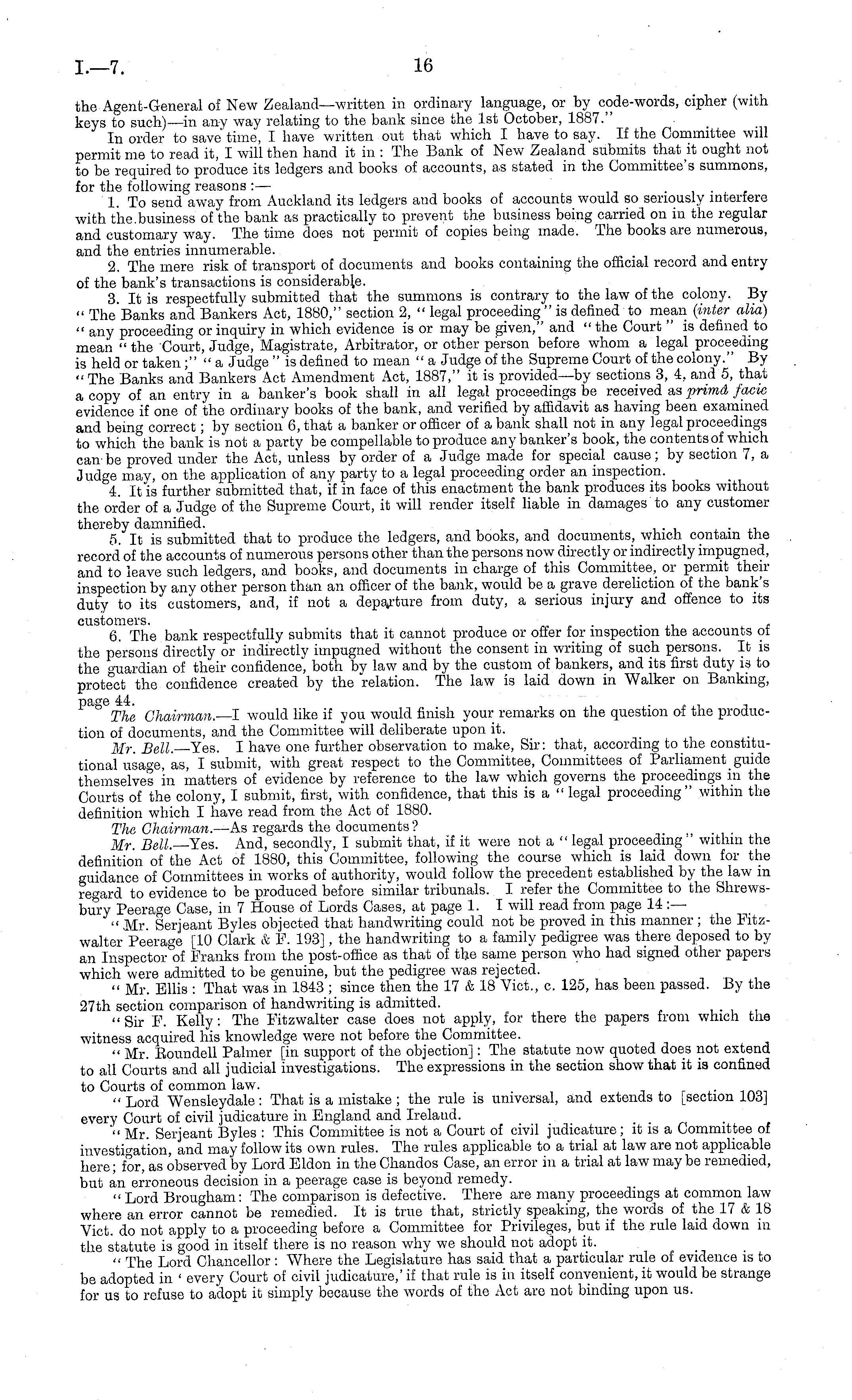 the Agent-General of New Zealand—written in ordinary language, or by code-words, cipher (with keys to such) —in any way relating to the bank since the Ist October, 1887." In order to save time, I have written out that which I have to say. If the Committee will permit me to read it, I will then hand it in : The Bank of New Zealand submits that it ought not to be required to produce its ledgers and books of accounts, as stated in the Committee's summons, for the following reasons : — 1. To send away from Auckland its ledgers and books of accounts would so seriously interfere with the.business of the bank as practically to prevent the business being carried on in the regular and customary way. The time does not permit of copies being made. The books are numerous, and the entries innumerable. 2. The mere risk of transport of documents and books containing the official record and entry of the bank's transactions is considerable. 3. It is respectfully submitted that the summons is contrary to the law of the colony. By " The Banks and Bankers Act, 1880," section 2, " legal proceeding " is defined to mean (inter aim) " any proceeding or inquiry in which evidence is or may be given," and " the Court " is defined to mean " the Court, Judge, Magistrate, Arbitrator, or other person before whom a legal proceeding is held or taken ;" "a Judge "is defined to mean " a Judge of the Supreme Court of the colony." By "The Banks and Bankers Act Amendment Act, 1887," it is provided—by sections 3, 4, and 5, that a copy of an entry in a banker's book shall in all legal proceedings be received as prima facie evidence if one of the ordinary books of the bank, and verified by affidavit as having been examined and being correct; by section 6, that a banker or officer of a bank shall not in any legal proceedings to which the bank is not a party be compellable to produce any banker's book, the contents of which can-be proved under the Act, unless by order of a Judge made for special cause; by section 7, a Judge may, on the application of any party to a legal proceeding order an inspection. 4. It is further submitted that, if in face of this enactment the bank produces its books without the order of a Judge of the Supreme Court, it will render itself liable in damages to any customer thereby damnified. . 5. It is submitted that to produce the ledgers, and books, and documents, which contain the record' of the accounts of numerous persons other than the persons now directly or indirectly impugned, and to leave such ledgers, and books, and documents in charge of this Committee, or permit theninspection by any other person than an officer of the bank, would be a grave dereliction of the bank's duty to its customers, and, if not a departure from duty, a serious injury and offence to its customers. ... , 6. The bank respectfully submits that it cannot produce or offer for inspection the accounts of the persons directly or indirectly impugned without the consent in writing of such persons. It is the guardian of their confidence, both by law and by the custom of bankers, and its first duty is to protect the confidence created by the relation. The law is laid down in Walker on Banking, page 44. . The Chairman.—l would like if you would finish your remarks on the question of the production of documents, and the Committee will deliberate upon it. Mr. Bell—Yes. I have one further observation to make, Sir: that, according to the constitutional usage, as, I submit, with great respect to the Committee, Committees of Parliament guide themselves in matters of evidence by reference to the law which governs the proceedings in the Courts of the colony, I submit, first, with confidence, that this is a " legal proceeding" within the definition which I have read from the Act of 1880. The Chairman. —As regards the documents ? Mr. Bell.— Yes. And, secondly, I submit that, if it were not a " legal proceeding " within the definition of the Act of 1880, this Committee, following the course which is laid down for the guidance of Committees in works of authority, would follow the precedent established by the law in regard to evidence to be produced before similar tribunals. I refer the Committee to the Shrewsbury Peerage Case, in 7 House of Lords Cases, at page 1. I will read from page 14 :— " Mr. Serjeant Byles objected that handwriting could not be proved in this manner ; the Fitzwalter Peerage [10 Clark &F. 193], the handwriting to a family pedigree was there deposed to by an Inspector of Franks from the post-office as that of the same person who had signed other papers which were admitted to be genuine, but the pedigree was rejected. " Mr. Ellis : That was in 1843 ; since then the 17 &18 Vict., c. 125, has been passed. By the 27th section comparison of handwriting is admitted. . " Sir F. Kelly: The Fitzwalter case does not apply, for there the papers from which the witness acquired his knowledge were not before the Committee. " Mr. Eoundell Palmer [in support of the objection]: The statute now quoted does not extend to all Courts and all judicial investigations. The expressions in the section show that it is confined to Courts of common law. . ■ " Lord Wensleydale : That is a mistake ; the rule is universal, and extends to [section 103] every Court of civil judicature in England and Irelaud. '" Mr. Serjeant Byles : This Committee is not a Court of civil judicature; it is a Committee of investigation, and may follow its own rules. The rules applicable to a trial at law are not applicable here; for, as observed by Lord Eldon in the Chandos Case, an error in a trial at law may be remedied, but an erroneous decision in a peerage case is beyond remedy. " Lord Brougham: The comparison is defective. There are many proceedings at common law where an error cannot be remedied. It is true that, strictly speaking, the words of the 17 &18 Vict, do not apply to a proceeding before a Committee for Privileges, but if the rule laid down in