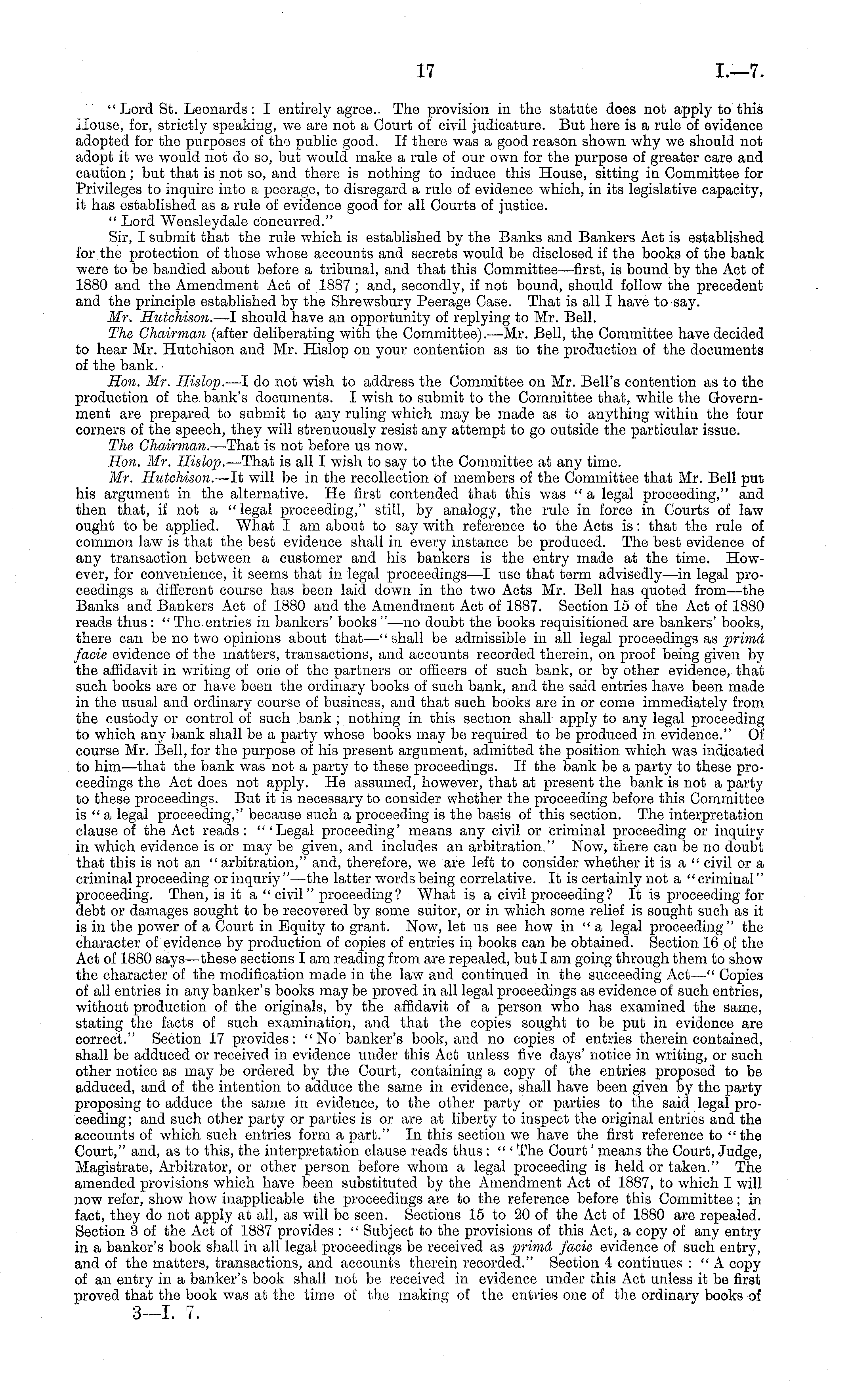 "Lord St. Leonards: I entirely agree.. The provision in the statute does not apply to this House, for, strictly speaking, we are not a Court of civil judicature. But here is a rule of evidence adopted for the purposes of the public good. If there was a good reason shown why we should not adopt it we would not do so, but would make a rule of our own for the purpose of greater care and caution; but that is not so, and there is nothing to induce this House, sitting in Committee for Privileges to inquire into a peerage, to disregard a rule of evidence which, in its legislative capacity, it has established as a rule of evidence good for all Courts of justice. " Lord Wensleydale concurred." Sir, I submit that the rule which is established by the Banks and Bankers Act is established for the protection of those whose accounts and secrets would be disclosed if the books of the bank were to be bandied about before a tribunal, and that this Committee —first, is bound by the Act of 1880 and the Amendment Act of 1887 ; and, secondly, if not bound, should follow the precedent and the principle established by the Shrewsbury Peerage Case. That is all I have to say. Mr. Hutchison. —l should have an opportunity of replying to Mr. Bell. The Chairman (after deliberating with the Committee). —Mr. Bell, the Committee have decided to hear Mr. Hutchison and Mr. Hislop on your contention as to the production of the documents of the bank. Hon. Mr. Hislop. —l do not wish to address the Committee on Mr. Bell's contention as to the production of the bank's documents. I wish to submit to the Committee that, while the Government are prepared to submit to any ruling which may be made as to anything within the four corners of the speech, they will strenuously resist any attempt to go outside the particular issue. The Chairman. —That is not before us now. Hon. Mr. Hislop. —That is all I wish to say to the Committee at any time. Mr. Hutchison. —lt will be in the recollection of members of the Committee that Mr. Bell put his argument in the alternative. He first contended that this was " a legal proceeding," and then that, if not a "legal proceeding," still, by analogy, the rule in force in Courts of law ought to be applied. What I am about to say with reference to the Acts is: that the rule of common law is that the best evidence shall in every instance be produced. The best evidence of any transaction between a customer and his bankers is the entry made at the time. However, for convenience, it seems that in legal proceedings—l use that term advisedly—in legal proceedings a different course has been laid down in the two Acts Mr. Bell has quoted from—the Banks and Bankers Act of 1880 and the Amendment Act of 1887. Section 15 of the Act of 1880 reads thus : " The entries in bankers' books " —no doubt the books requisitioned are bankers' books, there can be no two opinions about that—"shall be admissible in all legal proceedings as prima facie evidence of the matters, transactions, and accounts recorded therein, on proof being given by the affidavit in writing of one of the partners or officers of such bank, or by other evidence, that such books are or have been the ordinary books of such bank, and the said entries have been made in the usual and ordinary course of business, and that such books are in or come immediately from the custody or control of such bank ; nothing in this section shall apply to any legal proceeding to which any bank shall be a party whose books may be required to be produced in evidence." Of course Mr. Bell, for the purpose of his present argument, admitted the position which was indicated to him—that the bank was not a party to these proceedings. If the bank be a party to these proceedings the Act does not apply. He assumed, however, that at present the bank is not a party to these proceedings. But it is necessary to consider whether the proceeding before this Committee is " a legal proceeding," because such a proceeding is the basis of this section. The interpretation clause of the Act reads : " 'Legal proceeding' means any civil or criminal proceeding or inquiry in which evidence is or may be given, and includes an arbitration." Now, there can be no doubt that this is not an " arbitration," and, therefore, we are left to consider whether it is a " civil or a criminal proceeding orinquriy"—the latter words being correlative. It is certainly not a "criminal" proceeding. Then, is it a " civil " proceeding? What is a civil proceeding? It is proceeding for debt or damages sought to be recovered by some suitor, or in which some relief is sought such as it is in the power of a Court in Equity to grant. Now, let us see how in " a legal proceeding" the character of evidence by production of copies of entries in books can be obtained. Section 16 of the Act of 1880 says—these sections I am reading from are repealed, but I am going through them to show the character of the modification made in the law and continued in the succeeding Act—" Copies of all entries in any banker's books may be proved in all legal proceedings as evidence of such entries, without production of the originals, by the affidavit of a person who has examined the same, stating the facts of such examination, and that the copies sought to be put in evidence are correct." Section 17 provides: "No banker's book, and no copies of entries therein contained, shall be adduced or received in evidence under this Act unless five days' notice in writing, or such other notice as may be ordered by the Court, containing a copy of the entries proposed to be adduced, and of the intention to adduce the same in evidence, shall have been given by the party proposing to adduce the same in evidence, to the other party or parties to the said legal proceeding; and such other party or parties is or are at liberty to inspect the original entries and the accounts of which such entries form a part." In this section we have the first r