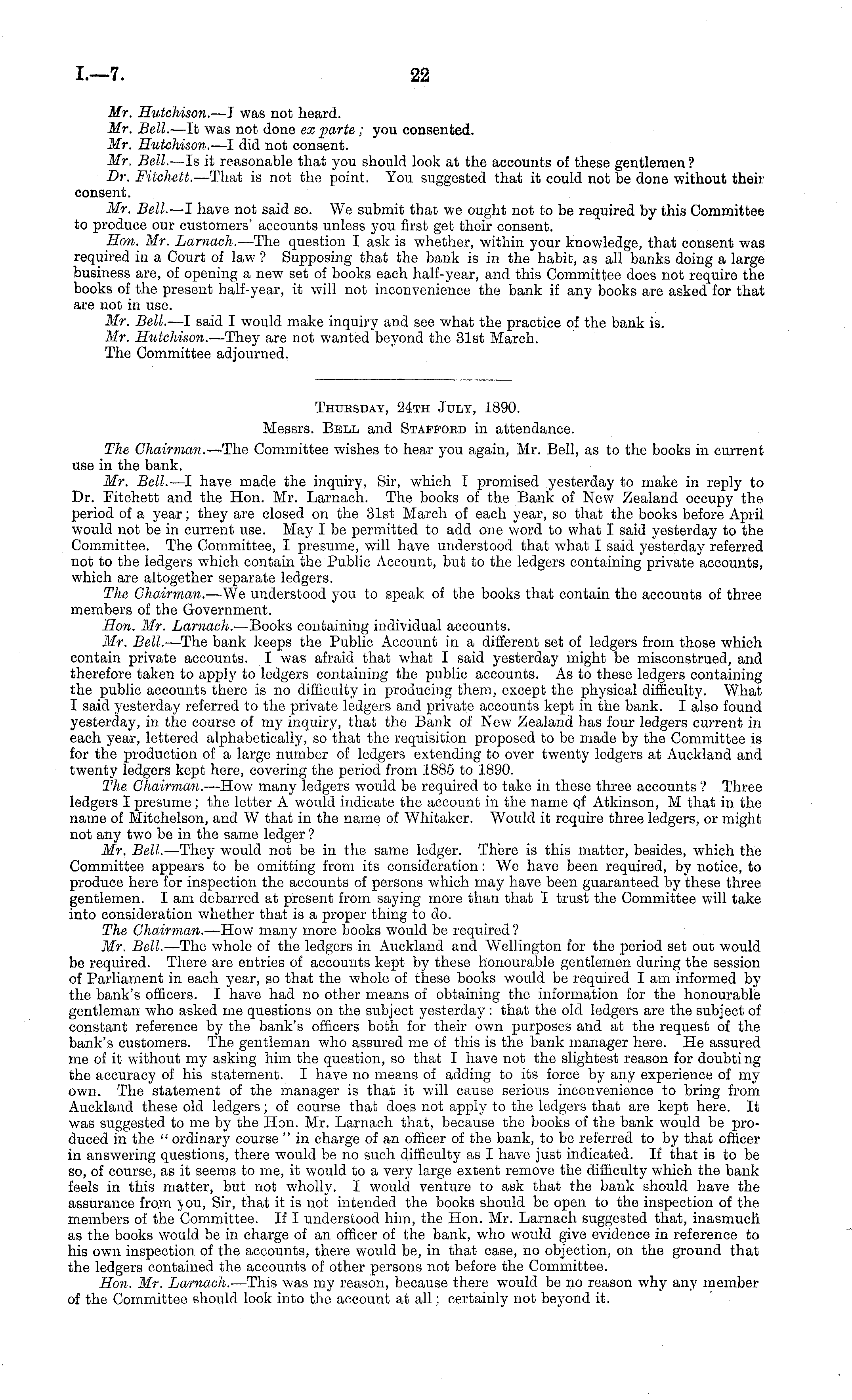 Thuesday, 24th July, 1890. Messrs. Bell and Stafpoed in attendance. The Chairman. —The Committee wishes to hear you again, Mr. Bell, as to the books in current use in the bank. Mr. Bell. —l have made the inquiry, Sir, which I promised yesterday to make in reply to Dr. Fitchett and the Hon. Mr. Larnach. The books of the Bank of New Zealand occupy the period of a year; they are closed on the 31st March of each year, so that the books before April would not be in current use. May Ibe permitted to add one word to what I said yesterday to the Committee. The Committee, I presume, will have understood that what I said yesterday referred not to the ledgers which contain the Public Account, but to the ledgers containing private accounts, which are altogether separate ledgers. The Chairman. —We understood y-ou to speak of the books that contain the accounts of three members of the Government. Hon. Mr. Larnach. —Books containing individual accounts. Mr. Bell. —The bank keeps the Public Account in a different set of ledgers from those which contain private accounts. I was afraid that what I said yesterday might be misconstrued, and therefore taken to apply to ledgers containing the public accounts. As to these ledgers containing the public accounts there is no difficulty in producing them, except the physical difficulty. What I said yesterday referred to the private ledgers and private accounts kept in the bank. I also found yesterday, in the course of my inquiry, that the Bank of New Zealand has four ledgers current in each year, lettered alphabetically, so that the requisition proposed to be made by the Committee is for the production of a large number of ledgers extending to over twenty ledgers at Auckland and twenty ledgers kept here, covering the period from 1885 to 1890. The Chairman. —How many ledgers would be required to take in these three accounts ? Three ledgers I presume; the letter A would indicate the account in the name qi Atkinson, M that in the name of Mitchelson, and W that in the name of Whitaker. Would it require three ledgers, or might not any two be in the same ledger ? Mr. Bell. —They would not be in the same ledger. There is this matter, besides, which the Committee appears to be omitting from its consideration: We have been required, by notice, to produce here for inspection the accounts of persons which may have been guaranteed by these three gentlemen. lam debarred at present from saying more than that I trust the Committee will take into consideration whether that is a proper thing to do. The Chairman. —How many more books would be required ? Mr. Bell. —The whole of the ledgers in Auckland and Wellington for the period set out would be required. There are entries of accounts kept by these honourable gentlemen during the session of Parliament in each year, so that the whole of these books would be required I am informed by the bank's officers. I have had no other means of obtaining the information for the honourable gentleman who asked me questions on the subject yesterday : that the old ledgers are the subject of constant reference by the bank's officers both for their own purposes and at the request of the bank's customers. The gentleman who assured me of this is the bank manager here. He assured me of it without my asking him the question, so that I have not the slightest reason for doubting the accuracy of his statement. I have no means of adding to its force by any experience of my own. The statement of the manager is that it will cause serious inconvenience to bring from Auckland these old ledgers; of course that does not apply to the ledgers that are kept here. It was suggested to me by the Hon. Mr. Larnach that, because the books of the bank would be produced in the " ordinary course " in charge of an officer of the bank, to be referred to by that officer in answering questions, there would be no such difficulty as I have just indicated. If that is to be so, of course, as it seems to me, it would to a very large extent remove the difficulty which the bank feels in this matter, but not wholly. I would venture to ask that the bank should have the assurance from j ou, Sir, that it is not intended the books should be open to the inspection of the members of the Committee. If I understood him, the Hon. Mr. Larnach suggested that, inasmuch as the books would be in charge of an officer of the bank, who would give evidence in reference to his own inspection of the accounts, there would be, in that case, no objection, on the ground that the ledgers contained the accounts of other persons not before the Committee. Hon. Mr. Larnach. —This was my reason, because there would be no reason why any member of the Committee should look into the account at all; certainly not beyond it.