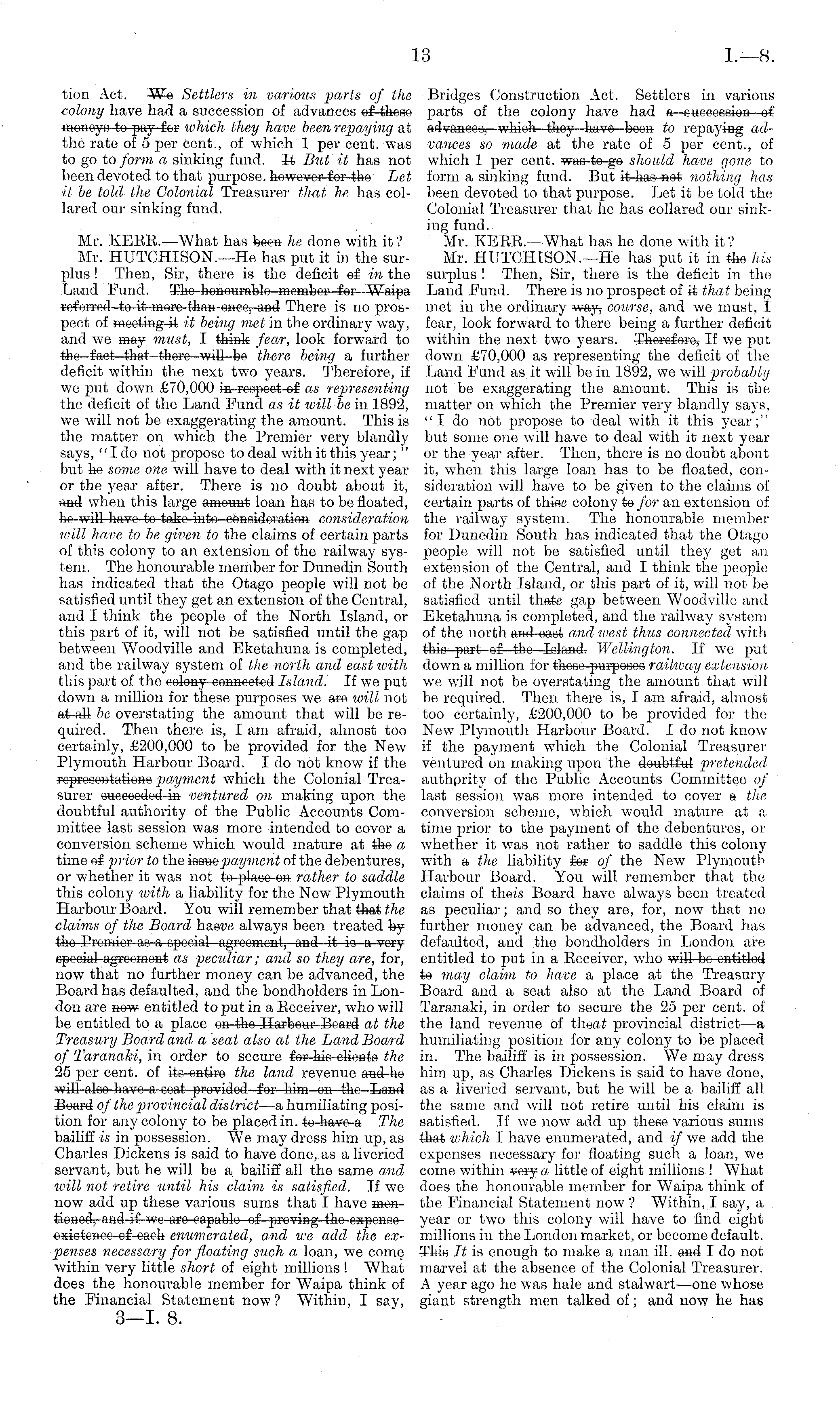 tion Act. We Settlers in various parts of the colony have had a succession of advances of these awaeys-4a-pay-fe which they have been repaying at the rate of 5 per Cent., of which 1 per cent, was to go to form a sinking fund. It But it has not been devoted to that purpose, however for tho Let it be told the Colonial Treasurer that he has collared our sinking fund. Mr. KERR.—What has beee he done with it ? Mr. HUTCHISON.—He has put it in the surplus ! Then, Sir, there is the deficit el in the Land Fund. Tlio honearablo member for—Waipa roforrod to it rnoro. than-onoo, and There is no prospect of meeting-it it being met in the ordinary way, and we may must, I think fear, look forward to the— fact that—there will be there being a further deficit within the next two years. Therefore, if we put down £70,000 ia-respoct of as representing the deficit of the Land Fund as it will be in 1892, we will not be exaggerating the amount. This is the matter on which the Premier very blandly says, " I do not propose to deal with it this year; " but he some one will have to deal with it next year or the year after. There is no doubt about it, aad when this large amount loan has to be floated, ha-will-have to take into consideratioa consideration will have to be given to the claims of certain parts of this colony to an extension of the railway system. The honourable member for Dunedin South has indicated that the Otago people will not be satisfied until they get an extension of the Central, and I think the people of the North Island, or this part of it, will not be satisfied until the gap between Woodville and Eketahuna is completed, and the railway system of the north and east with this part of the colony connected Island. If we put down a million for these purposes we ase will not at-all bo overstating the amount that will be required. Then there is, I am afraid, almost too certainly, £200,000 to be provided for the New Plymouth Harbour Board. I do not know if the representatieas payment which the Colonial Treasurer saeeeeded4a ventured on making upon the doubtful authority of the Public Accounts Committee last session was more intended to cover a conversion scheme which would mature at the a time ol prior to the issue payment of the debentures, or whether it was not te place on rather to saddle this colony with a liability for the New Plymouth Harbour Board. You will remember that that the claims of the Board hasve always been treated fey tho Prcmier-as-a-oponial -agfoomcnt, aad it io a very special agreement as peculiar; and so they are, for, now that no further money can be advanced, the Board has defaulted, and the bondholders in London are aow entitled to put in a Receiver, who will be entitled to a place on the-Barbear-Beard at the Treasury Board and a seat also at the Land Board of Taranaki, in order to secure for-his-elieats the 25 per cent, of its-eatire the land revenue aad-he will aloo have-a-seat provided—ler—him on the-Laad Beard of the provincial district —a humiliating position for any colony to be placed in. te4ia¥e-a The bailiff is in possession. We may dress him up, as Charles Dickens is said to have done, as a liveried servant, but he will be a. bailiff all the same and will not retire until his claim is satisfied. If we now add up these various sums that I have tieaedy-aad-il-we-are-eapable-el-provißg-the-espease-esisteaee-el-eaea enumerated, and we add the expenses necessary for floating such a loan, we come within very little short of eight millions ! What does the honourable member for Waipa think of the Financial Statement now? Within, I say,