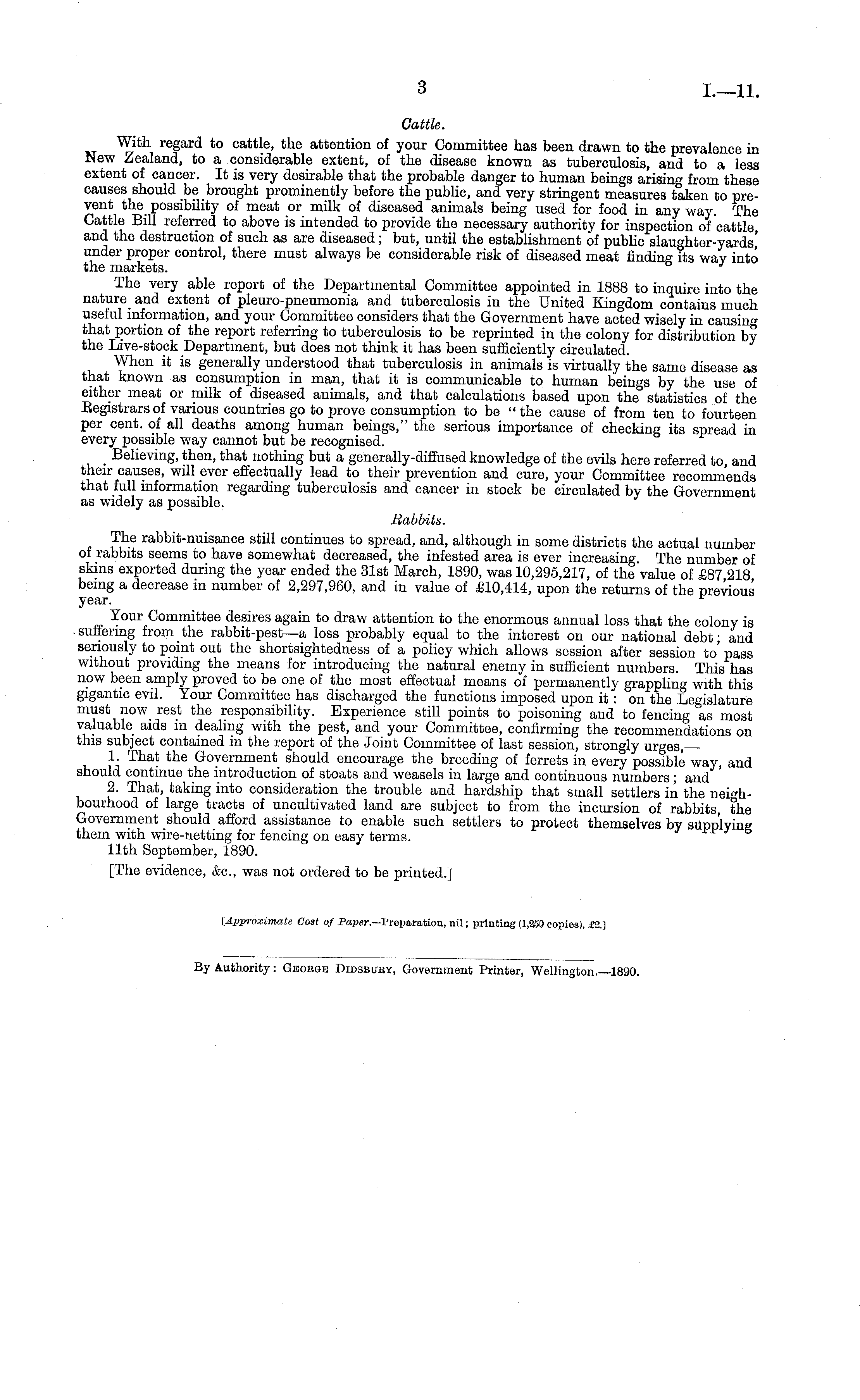 Cattle. With regard to cattle, the attention of your Committee has been drawn to the prevalence in New Zealand, to a considerable extent, of the disease known as tuberculosis, and to a less extent of cancer. It is very desirable that the probable danger to human beings arising from these causes should be brought prominently before the public, and very stringent measures taken to prevent the possibility of meat or milk of diseased animals being used for food in any way. The Cattle Bill referred to above is intended to provide the necessary authority for inspection of cattle and the destruction of such as are diseased; but, until the establishment of public slaughter-yards' under proper control, there must always be considerable risk of diseased meat finding its way into the markets. J The very able report of the Departmental Committee appointed in 1888 to inquire into the nature_ and extent of pleuro-pneumonia and tuberculosis in the United Kingdom contains much useful information, and your Committee considers that the Government have acted wisely in causing that portion of the report referring to tuberculosis to be reprinted in the colony for distribution by the Live-stock Department, but does not think it has been sufficiently circulated. When it is generally understood that tuberculosis in animals is virtually the same disease as that known as consumption in man, that it is communicable to human beings by the use of either meat or milk of diseased animals, and that calculations based upon the statistics of the Registrars of various countries go to prove consumption to be "the cause of from ten to fourteen per cent, of all deaths among human beings," the serious importance of checking its spread in every possible way cannot but be recognised. _ Believing, then, that nothing but a generally-diffused knowledge of the evils here referred to, and their causes, will ever effectually lead to their prevention and cure, your Committee recommends that full information regarding tuberculosis and cancer in stock be circulated by the Government as widely as possible. Babbits. The rabbit-nuisance still continues to spread, and, although in some districts the actual number of rabbits seems to have somewhat decreased, the infested area is ever increasing. The number of skins exported during the year ended the 31st March, 1890, was 10,295,217, of the value of £87 218 being a decrease in number of 2,297,960, and in value of £10,414, upon the returns of the previous year. l Your Committee desires again to draw attention to the enormous annual loss that the colony is suffering from, the rabbit-pest—a loss probably equal to the interest on our national debt; and seriously to point out the shortsightedness of a policy which allows session after session to' pass without providing the means for introducing the natural enemy in sufficient numbers. This has now been amply proved to be one of the most effectual means of permanently grappling with this gigantic evil. Your Committee has discharged the functions imposed upon it: on the Legislature must now rest the responsibility. Experience still points to poisoning and to fencing as most valuable aids in dealing with the pest, and your Committee, confirming the recommendations on this subject contained in the report of the Joint Committee of last session, strongly urges, 1. That the Government should encourage the breeding of ferrets in every possible way, and should continue the introduction of stoats and weasels in large and continuous numbers; and 2. That, taking into consideration the trouble and hardship that small settlers in the neighbourhood of large tracts of uncultivated land are subject to from the incursion of rabbits, the Government should afford assistance to enable such settlers to protect themselves by supplying them with wire-netting for fencing on easy terms. 11th September, 1890. [The evidence, &c, was not ordered to be printed.] [Approximate Cost of Paper.— -Preparation, nil; printing (1,250 copies), £2.j