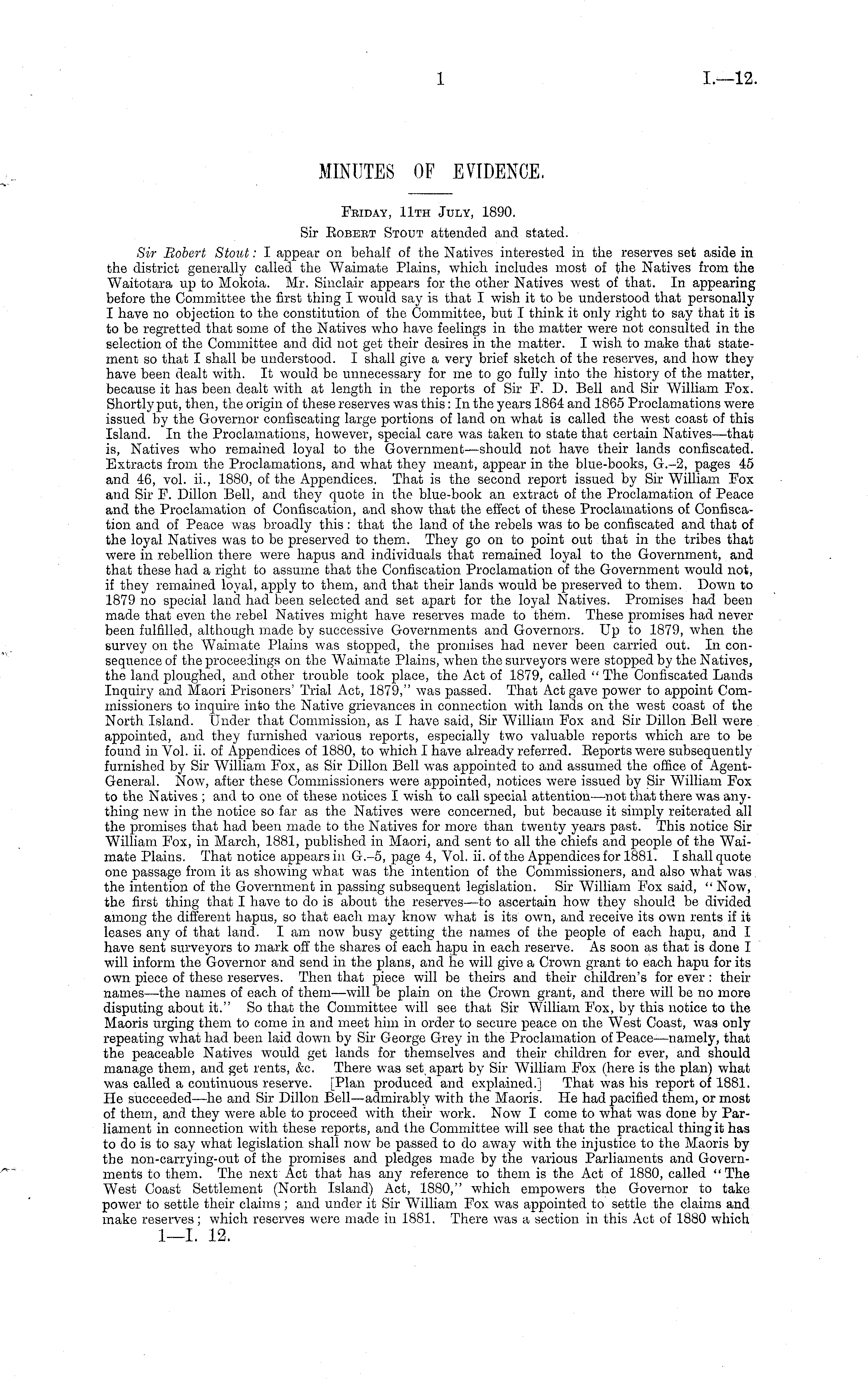 Friday, 11th July, 1890. Sir Robert Stout attended and stated. Sir Robert Stout: I appear on behalf of the Natives interested in the reserves set aside in the district generally called the Waimate Plains, which includes most of the Natives from the Waitotara up to Mokoia. Mr. Sinclair appears for the other Natives west of that. In appearing before the Committee the first thing I would say is that I wish it to be understood that personally I have no objection to the constitution of the Committee, but I think it only right to say that it is to be regretted that some of the Natives who have feelings in the matter were not consulted in the selection of the Committee and did not get their desires in the matter. I wish to make that statement so that I shall be understood. I shall give a very brief sketch of the reserves, and how they have been dealt with. It would be unnecessary for me to go fully into the history of the matter, because it has been dealt with at length in the reports of Sir F. D. Bell and Sir William Fox. Shortly put, then, the origin of these reserves was this: In the years 1864 and 1865 Proclamations were issued by the Governor confiscating large portions of land on what is called the west coast of this Island. In the Proclamations, however, special care was taken to state that certain Natives—that is, Natives who remained loyal to the Government—should not have their lands confiscated. Extracts from the Proclamations, and what they meant, appear in the blue-books, G.-2, pages 45 and 46, vol. ii., 1880, of the Appendices. That is the second report issued by Sir William Fox and Sir F. Dillon Bell, and they quote in the blue-book an extract of the Proclamation of Peace and the Proclamation of Confiscation, and show that the effect of these Proclamations of Confiscation and of Peace was broadly this: that the land of the rebels was to be confiscated and that of the loyal Natives was to be preserved to them. They go on to point out that in the tribes that were in rebellion there were hapus and individuals that remained loyal to the Government, and that these had a right to assume that the Confiscation Proclamation of the Government would not, if they remained loyal, apply to them, and that their lands would be preserved to them. Down to 1879 no special land, had been selected and set apart for the loyal Natives. Promises had been made that even the rebel Natives might have reserves made to them. These promises had never been fulfilled, although made by successive Governments and Governors. Up to 1879, when the survey on the Waimate Plains was stopped, the promises had never been carried out. In consequence of the proceedings on the Waimate Plains, when the surveyors were stopped by the Natives, the land ploughed, and other trouble took place, the Act of 1879, called " The Confiscated Lands Inquiry and Maori Prisoners' Trial Act, 1879," was passed. That Act gave power to appoint Commissioners to inquire into the Native grievances in connection with lands on the west coast of the North Island. Under that Commission, as I have said, Sir William Fox and Sir Dillon Bell were appointed, and they furnished various reports, especially two valuable reports which are to be found in Vol. ii. of Appendices of 1880, to which I have already referred. Reports were subsequently furnished by Sir William Fox, as Sir Dillon Bell was appointed to and assumed the office of AgentGeneral. Now, after these Commissioners were appointed, notices were issued by Sir William Fox to the Natives ; and to one of these notices I wish to call special attention—not that there was anything new in the notice so far as the Natives were concerned, but because it simply reiterated all the promises that had been made to the Natives for more than twenty years past. This notice Sir William Fox, in March, 1881, published in Maori, and sent to all the chiefs and people of the Waimate Plains. That notice appears in G.-5, page 4, Vol. ii. of the Appendices for 1881. I shall quote one passage from it as showing what was the intention of the Commissioners, and also what was. the intention of the Government in passing subsequent legislation. Sir William Fox said, " Now, the first thing that I have to do is about the reserves—to ascertain how they should be divided among the different hapus, so that each may know what is its own, and receive its own rents if it leases any of that land. lam now busy getting the names of the people of each hapu, and I have sent surveyors to mark off the shares of each hapu in each reserve. As soon as that is done I will inform the Governor and send in the plans, and he will give a Crown grant to each hapu for its own piece of these reserves. Then that piece will be theirs and their children's for ever : their names—the names of each of them—will be plain on the Crown grant, and there will be no more disputing about it." So that the Committee will see that Sir William Fox, by this notice to the Maoris urging them to come in and meet him in order to secure peace on the West Coast, was only repeating what had been laid down by Sir George Grey in the Proclamation of Peace—namely, that the peaceable Natives would get lands for themselves and their children for ever, and should manage them, and get rents, &c. There was set apart by Sir William Fox (here is the plan) what was called a continuous reserve. [Plan produced and explained.] That was his report of 1881. He succeeded—he and Sir Dillon Bell—admirably with the Maoris. He had pacified them, or most of them, and they were able to proceed with their work. Now I come to what was done by Parliament in connection with these reports, and the Committee will see that the practical thing it has to do is to say what legislation, shall now be passed to do away with the injustice to the Maoris by the non-carrying-out of the promises and pledges made by the various Parliaments and Governments to them. The next Act that has any reference to the