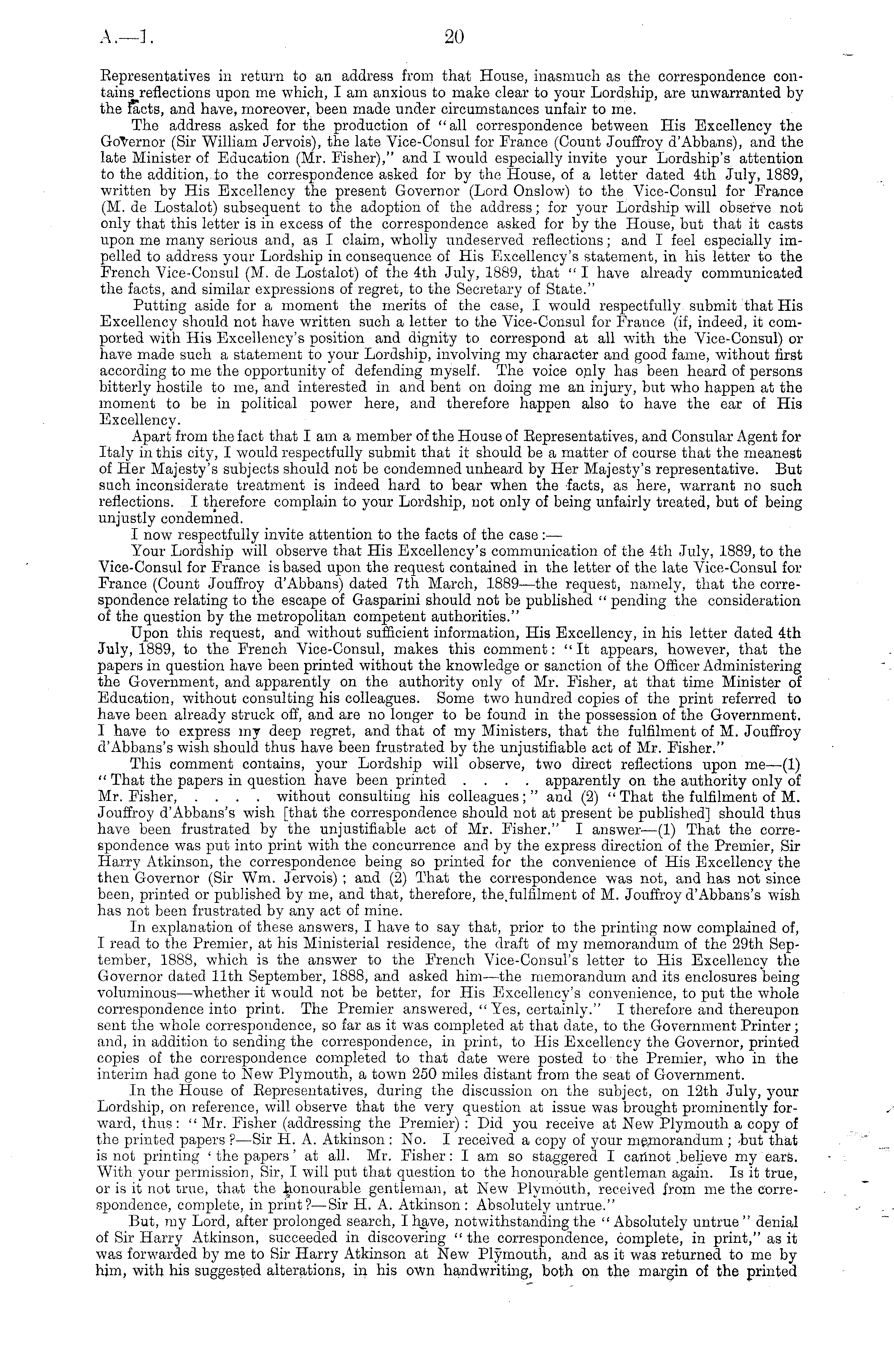 Representatives in return to an address from that House, inasmuch as the correspondence contains reflections upon me which, I am anxious to make clear to your Lordship, are unwarranted by the facts, and have, moreover, been made under circumstances unfair to me. The address asked for the production of "all correspondence between His Excellency the Governor (Sir William Jervois), the late Vice-Consul for France (Count Jouffroy d'Abbans), and the late Minister of Education (Mr. Fisher)," and I would especially invite your Lordship's attention to the addition, to the correspondence asked for by the House, of a letter dated 4th July, 1889, written by His Excellency the present Governor (Lord Onslow) to the Vice-Consul for France (M. de Lostalot) subsequent to the adoption of the address; for your Lordship will observe not only that this letter is in excess of the correspondence asked for by the House, but that it casts upon me many serious and, as I claim, wholly undeserved reflections; and I feel especially impelled to address your Lordship in consequence of His Excellency's statement, in his letter to the French Vice-Consul (M. de Lostalot) of the 4th July, 1889, that " I have already communicated the facts, and similar expressions of regret, to the Secretary of State." Putting aside for a moment the merits of the case, I would respectfully submit that His Excellency should not have written such a letter to the Vice-Consul for France (if, indeed, it comported with His Excellency's position and dignity to correspond at all with the Vice-Consul) or have made such a statement to your Lordship, involving my character and good fame, without first according to me the opportunity of defending myself. The voice only has been heard of persons bitterly hostile to me, and interested in. and bent on doing me an injury, but who happen at the moment to be in political power here, and therefore happen also to have the ear of His Excellency. Apart from the fact that I am a member of the House of Representatives, and Consular Agent for Italy in this city, I would respectfully submit that it should be a matter of course that the meanest of Her Majesty's subjects should not be condemned unheard by Her Majesty's representative. But such inconsiderate treatment is indeed hard to bear when the facts, as here, warrant no such reflections. I therefore complain to your Lordship, not only of being unfairly treated, but of being unjustly condemned. I now respectfully invite attention to the facts of the case: — Your Lordship will observe that His Excellency's communication of the 4th July, 1889, to the Vice-Consul for France is based upon the request contained in the letter of the late Vice-Consul for France (Count Jouffroy d'Abbans) dated 7th March, 1889—the request, namely, that the correspondence relating to the escape of Gasparini should not be published " pending the consideration of the question by the metropolitan competent authorities." Upon this request, and without sufficient information, His Excellency, in his letter dated 4th July, 1889, to the French Vice-Consul, makes this comment: "It appears, however, that the papers in question have been printed without the knowledge or sanction of the Officer Administering the Government, and apparently on the authority only of Mr. Fisher, at that time Minister of Education, without consulting his colleagues. Some two hundred copies of the print referred to have been already struck off, and are no longer to be found in the possession of the Government. I have to express my deep regret, and that of my Ministers, that the fulfilment of M. Jouffroy d'Abbans's wish should thus have been frustrated by the unjustifiable act of Mr. Fisher." This comment contains, your Lordship will observe, two direct reflections upon me—{l) " That the papers in question have been printed .... apparently on the authority only of Mr. Fisher, .... without consulting his colleagues; " and (2) " That the fulfilment of M. Jouffroy d'Abbans's wish [that the correspondence should not at present be published] should thus have been frustrated by the unjustifiable act of Mr. Fisher." I answer —(1) That the correspondence was put into print with the concurrence and. by the express direction of the Premier, Sir Harry Atkinson, the correspondence being so printed for the convenience of His Excellency the then Governor (Sir Wm. Jervois) ; and (2) That the correspondence was not, and has not since been, printed or published by me, and that, therefore, the.fulfilment of M. Jouffroy d'Abbans's wish has not been frustrated by any act of mine. In explanation of these answers, I have to say that, prior to the printing now complained of, I read to the Premier, at his Ministerial residence, the draft of my memorandum of the 29th September, 1888, which is the answer to the French Vice-Consul's letter to His Excellency the Governor dated 11th September, 1888, and asked him—the memorandum and its enclosures being voluminous—whether it would not be better, for His Excellency's convenience, to put the whole correspondence into print. The Premier answered, " Yes, certainly." I therefore and thereupon sent the whole correspondence, so far as it was completed at that date, to the Government Printer; and, in addition to sending the correspondence, in print, to His Excellency the Governor, printed copies of the correspondence completed to that date were posted to the Premier, who in the interim had gone to New Plymouth, a town 250 miles distant from the seat of Government. In the House of Representatives, during the discussion on the subject, on 12th July, your Lordship, on reference, will observe that the very question at issue was brought prominently forward, thus : " Mr. Fisher (addressing the Premier) : Did you receive at New Plymouth a copy of the printed papers ?—Sir H. A. Atkinson : No. I received a copy of your memorandum ; but that is not printing ' the papers' at all. Mr. Fisher: I am so staggere