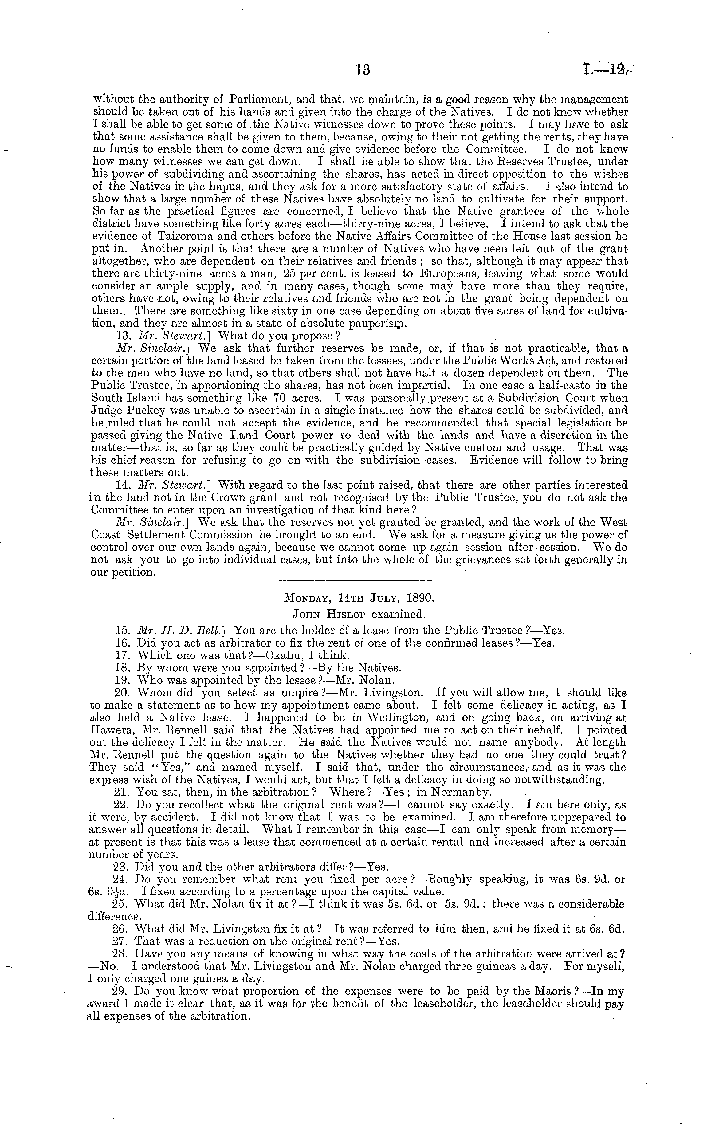 Monday, 14th July, 1890. John Hislop examined. 15. Mr. H. D. Bell.] You are the holder of a lease from the Public Trustee ?—Yes. 16. Did you act as arbitrator to fix the rent of one of the confirmed leases ?—Yes. 17. Which one was that?—Okahu, I think. 18. By whom were you appointed ? —By the Natives. 19. Who was appointed by the lessee ? —Mr. Nolan. 20. Whom did you select as umpire ?—Mr. Livingston. If you will allow me, I should like to make a statement as to how my appointment came about. I felt some delicacy in acting, as I also held a Native lease. I happened to be in Wellington, and on going back, on arriving at Hawera, Mr. Rennell said that the Natives had appointed me to act on their behalf. I pointed out the delicacy I felt in the matter. He said the Natives would not name anybody. At length Mr. Rennell put the question again to the Natives whether they had no one they could trust ? They said "Yes," and named myself. I said that, under the circumstances, and as it was the express wish of the Natives, I would act, but that I felt a delicacy in doing so notwithstanding. 21. You sat, then, in the arbitration? Where? —Yes ; in Normanby. 22. Do you recollect what the original rent was?—l cannot say exactly. lam here only, as it were, by accident. I did not know that I was to be examined. lam therefore unprepared to answer all questions in detail. What I remember in this case—l can only speak from memory— at present is that this was a lease that commenced at a certain rental and increased after a certain number of years. 23. Did you and the other arbitrators differ?— Yes. 24. Do you remember what rent you fixed per acre ? —Roughly speaking, it was 6s. 9d. or 6s. 9-Jd. I fixed according to a percentage upon the capital value. 25. What did Mr. Nolan fix it at ?—I think it was ss. 6d. or ss. 9d.: there was a considerable difference. 26. What did Mr. Livingston fix it at ?—lt was referred to him then, and he fixed it at 6s. 6d. 27. That was a reduction on the original rent? —Yes. 28. Have you any means of knowing in what way the costs of the arbitration were arrived at? —No. I understood that Mr. Livingston and Mr. Nolan charged three guineas a day. For myself, I only charged one guinea a day. 29. Do you know what proportion of the expenses were to be paid by the Maoris ?—ln my award I made it clear that, as it was for the benefit of the leaseholder, the leaseholder should pay all expenses of the arbitration.