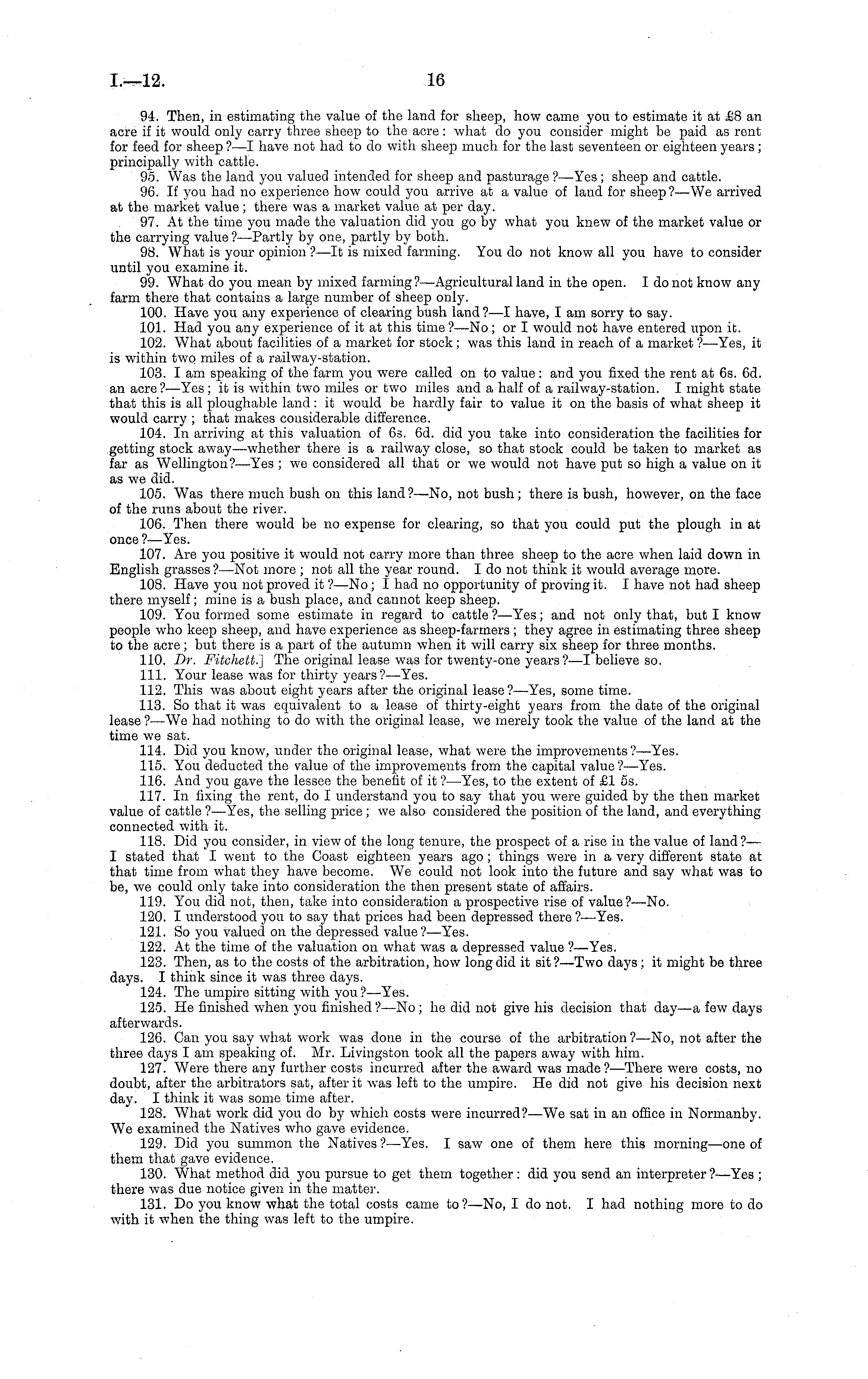 94. Then, in estimating the value of the land for sheep, how came you to estimate it at £8 an acre if it would only carry three sheep to the acre: what do you consider might be paid as rent for feed for sheep ?—I have not had to do with sheep much for the last seventeen or eighteen years; principally with cattle. 95. Was the land you valued intended for sheep and pasturage ? —Yes; sheep and cattle. 96. If you had no experience how could you arrive at a value of land for sheep?—We arrived at the market value; there was a market value at per day. 97. At the time you made the valuation did you go by what you knew of the market value or the carrying value? —Partly by one, partly by both. 98. What is your opinion ? —lt is mixed farming. You do not know all you have to consider until you examine it. 99. What do you mean by mixed farming?— Agricultural land in the open. Ido not know any farm there that contains a large number of sheep only. 100. Have you any experience of clearing bush land ?—I have, lam sorry to say. 101. Had you any experience of it at this time ?—No; or I would not have entered upon it. 102. What about facilities of a market for stock; was this land in reach of a market ?—Yes, it is within two miles of a railway-station. 103. I am speaking of the farm you were called on to value : and you fixed the rent at 6s. 6d. an acre ?—Yes; it is within two miles or two miles and a half of a railway-station. I might state that this is all ploughable land : it would be hardly fair to value it on the basis of what sheep it would carry ; that makes considerable difference. 104. In arriving at this valuation of 6s. 6d. did you take into consideration the facilities for getting stock away—whether there is a railway close, so that stock could be taken to market as far as Wellington?— Yes ; w 7 e considered all that or we would not have put so high a value on it as we did. 105. Was there much bush on this land?—No, not bush; there is bush, however, on the face of the runs about the river. 106. Then there would be no expense for clearing, so that you could put the plough in at once ?—Yes. 107. Are you positive it would not carry more than three sheep to the acre when laid down in English grasses?— Not more ; not all the year round. Ido not think it would average more. 108. Have you not proved it ?—No ; I had no opportunity of proving it. I have not had sheep there myself; mine is a bush place, and cannot keep sheep. 109. You formed some estimate in regard to cattle ?—Yes; and not only that, but I know people who keep sheep, and have experience as sheep-farmers ; they agree in estimating three sheep to the acre; but there is a part of the autumn when it will carry six sheep for three months. 110. Dr. Fitchett.] The original lease was for twenty-one years? —I believe so. 111. Your lease was for thirty years?— Yes. 112. This was about eight years after the original lease?—-Yes, some time. 113. So that it was equivalent to a lease of thirty-eight years from the date of the original lease ?—We had nothing to do with the original lease, we merely took the value of the land at the time we sat. 114. Did you know, under the original lease, w 7 hat were the improvements ?—-Yes. 115. You deducted the value of the improvements from the capital value ?—Yes. 116. And you gave the lessee the benefit of it ?—Yes, to the extent of £1 ss. 117. In fixing the rent, do I understand you to say that you were guided by the then market value of cattle ?—Yes, the selling price; we also considered the position of the land, and everything connected with it. 118. Did you consider, in view of the long tenure, the prospect of a rise in the value of land?— I stated that I went to the Coast eighteen years ago; things were in a very different state at that time from what they have become. W T e could not look into the future and say what was to be, we could only take into consideration the then present state of affairs. 119. You did not, then, take into consideration a prospective rise of value?— No. 120. I understood you to say that prices had been depressed there ?—Yes. 121. So you valued on the depressed value?— Yes. 122. At the time of the valuation on what was a depressed value ?—Yes. 123. Then, as to the costs of the arbitration, how long did it sit?— Two days ; it might be three days. I think since it was three days. 124. The umpire sitting with you?— Yes. 12-5. He finished when you finished?—-No; he did not give his decision that day—a few days afterwards. 126. Can you say what work was done in the course of the arbitration ?—No, not after the three days lam speaking of. Mr. Livingston took all the papers away with him. 127. Were there any further costs incurred after the award was made ?—There were costs, no doubt, after the arbitrators sat, after it was left to the umpire. He did not give his decision next day. I think it was some time after. 128. What work did you do by which costs were incurred?—We sat in an office in Normanby. We examined the Natives who gave evidence. 129. Did you summon the Natives ? —Yes. I saw one of them here this morning—one of them that gave evidence. 130. What method did you pursue to get them together : did you send an interpreter ?—Yes ; there was due notice given in the matter. 131. Do you know what the total costs came to?—No, I do not. I had. nothing more to do with it when the thing was left to the umpire.