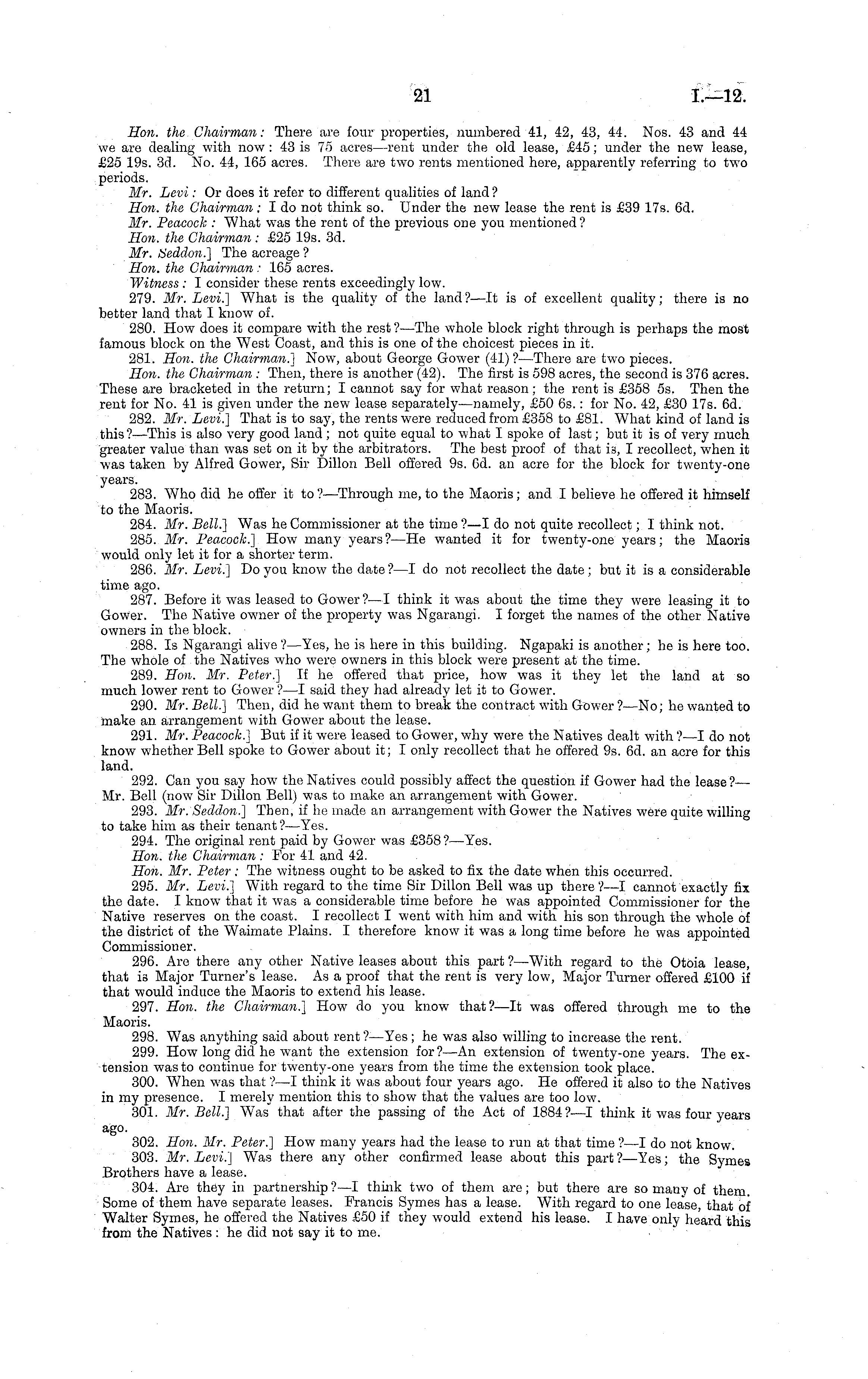 Hon. the Chairman: There are four properties, numbered 41, 42, 43, 44. Nos. 43 and 44 we are dealing with now : 43 is 75 acres —rent under the old lease, £45; under the new lease, £25 19s. 3d. No. 44, 165 acres. There are two rents mentioned here, apparently referring to two periods. Mr. Levi: Or does it refer to different qualities of land? Hon. the Chairman; Ido not think so. Under the new lease the rent is £39 17s. 6d. Mr. Peacock : What was the rent of the previous one you mentioned? Hon. the Chairman : £25 19s. 3d. Mr. Seddon.] The acreage ? Hon. the Chairman : 165 acres. Witness : I consider these rents exceedingly low 7 . 279. Mr. Levi.] What is the quality of the land?—lt is of excellent quality; there is no better land that I know of. 280. How does it compare with the rest ?—The whole block right through is perhaps the most famous block on the West Coast, and this is one of the choicest pieces in it. 281. Hon. the Chairman.] Now, about George Gower (41) ? —There are two pieces. Hon. the Chairman : Then, there is another (42). The first is 598 acres, the second is 376 acres. These are bracketed in the return; I cannot say for what reason; the rent is £358 ss. Then the rent for No. 41 is given under the new lease separately—namely, £50 65.: for No. 42, £30 17s. 6d. 282. Mr. Levi.] That is to say, the rents were reduced from £358 to £81. What kind of land is this?— This is also very good land ; not quite equal to what I spoke of last; but it is of very much greater value than was set on it by the arbitrators. The best proof of that is, I recollect, when it was taken by Alfred Gower, Sir Dillon Bell offered 9s. 6d. an acre for the block for twenty-one years. 283. Who did he offer it to ?—Through me, to the Maoris; and I believe he offered it himself to the Maoris. 284. Mr. Bell.] Was he Commissioner at the time ?—I do not quite recollect; I think not. 285. Mr. Peacock.] How many years?—He wanted it for tw 7 enty-one years; the Maoris w 7 ould only let it for a shorter term. 286. Mr. Levi.] Do you know the date ? —I do not recollect the date ; but it is a considerable time ago. 287. Before it was leased to Gower?—l think it was about the time they were leasing it to Gower. The Native owner of the property was Ngarangi. I forget the names of the other Native owners in the block. 288. Is Ngarangi alive ?—Yes, he is here in this building. Ngapaki is another; he is here too. The whole of the Natives who w 7 ere owners in this block were present at the time. 289. Hon. Mr. Peter.] If he offered that price, how was it they let the land at so much lower rent to Gower ?—I said they had already let it to Gower. 290. Mr. Bell.] Then, did he want them to break the contract with Gower ?—No; he wanted to make an arrangement with Gower about the lease. 291. Mr. Peacock.] But if it were leased to Gower, why were the Natives dealt with ? —I do not know whether Bell spoke to Gower about it; I only recollect that he offered 9s. 6d. an acre for this land. 292. Can you say how the Natives could possibly affect the question if Gower had the lease?— Mr. Bell (now 7 Sir Dillon Bell) was to make an arrangement with Gower. 293. Mr. Seddon.] Then, if ho made an arrangement with Gow 7 er the Natives were quite willing to take him as their tenant? —Yes. 294. The original rent paid by Gower was £358?— Yes. Hon. the Chairman : For 41 and 42. Hon. Mr. Peter ; The witness ought to be asked to fix the date when this occurred. 295. Mr. Levi.] With regard to the time Sir Dillon Bell was up there ?—I cannot exactly fix the date. I know that it was a considerable time before he was appointed Commissioner for the Native reserves on the coast. I recollect I went with him and with his son through the wdiole of the district of the Waimate Plains. I therefore know 7 it was a long time before he was appointed Commissioner. 296. Are there any other Native leases about this part ? —With regard to the Otoia lease, that i 3 Major Turner's lease. As a proof that the rent is very low, Major Turner offered £100 if that would induce the Maoris to extend his lease. 297. Hon. the Chairman.] How 7 do you know that?—lt was offered through me to the Maoris. 298. Was anything said about rent ?—Yes ; he was also willing to increase the rent. 299. How long did he want the extension for?—An extension of twenty-one years. The extension was to continue for twenty-one years from the time the extension took place. 300. When was that ?—I think it was about four years ago. He offered it also to the Natives in my presence. I merely mention this to show that the values are too low. 301. Mr. Bell.] Was that after the passing of the Act of 1884?-—I think it was four years ago. 302. Hon. Mr. Peter.] How many years had the lease to run at that time ?—I do not know. 303. Mr. Levi.] Was there any other confirmed lease about this part ?—Yes; the Symes Brothers have a lease. 304. Are they in partnership?—l think two of them are; but there are so many of them. Some of them have separate leases. Francis Symes has a lease. With regard to one lease, that of Walter Symes, he offered the Natives £50 if they would extend his lease. I have only heard this from the Natives : he did not say it to me.