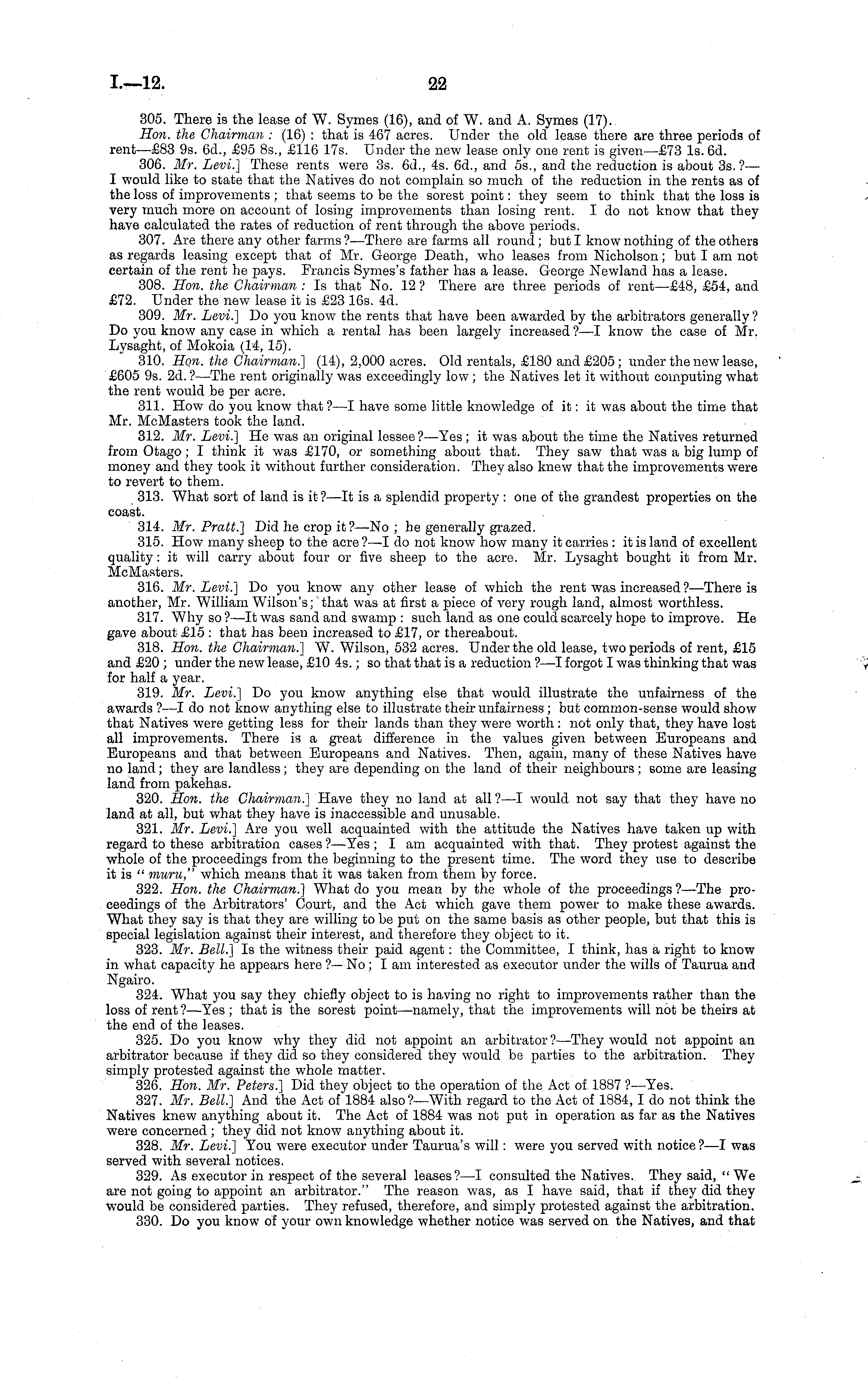 305. There is the lease of W. Symes (16), and of W. and A. Symes (17). Hon. the Chairman : (16) : that is 467 acres. Under the old lease there are three periods of rent—£B3 9s. 6d., £95 Bs., £116 17s. Under the new lease only one rent is given—£73 Is. 6d. 306. Mr. Levi.] These rents were 3s. 6d., 4s. 6d., and 55., and the reduction is about 3s.?— I would like to state that the Natives do not complain so much of the reduction in the rents as of the loss of improvements ; that seems to be the sorest point: they seem to think that the loss is very much more on account of losing improvements than losing rent. I do not know that they have calculated the rates of reduction of rent through the above periods. 307. Are there any other farms?— There are farms all round; but I know nothing of the others as regards leasing except that of Mr. George Death, who leases from Nicholson; but lam not certain of the rent he pays. Francis Symes's father has a lease. George Newland has a lease. 308. Hon. the Chairman : Is that No. 12 ? There are three periods of rent—£4B, £54, and £72. Under the new lease it is £23 16s. 4d. 309. Mr. Levi.] Do you know the rents that have been awarded by the arbitrators generally ? Do you know any case in which a rental has been largely increased ? —I know the case of Mr. Lysaght, of Mokoia (14,15). 310. Hon. the Chairman.] (14), 2,000 acres. Old rentals, £180 and £205; under the new lease, £605 9s. 2d. ?—The rent originally was exceedingly low; the Natives let it wuthout computing what the rent would be per acre. 311. How do you know that ? —I have some little knowledge of it: it was about the time that Mr. McMasters took the land. 312. Mr. Levi.] He was an original lessee?— Yes; it was about the time the Natives returned from Otago; I think it was £170, or something about that. They saw that was a big lump of money and they took it without further consideration. They also knew that the improvements were to revert to them. 313. What sort of land is it? —It is a splendid property : one of the grandest properties on the coast. 314. Mr. Pratt.] Did he crop it ?—No ; he generally grazed. 315. How many sheep to the acre ?—I do not know how many it carries :it is land of excellent quality: it will carry about four or five sheep to the acre. Mr. Lysaght bought it from Mr. McMasters. 316. Mr. Levi.] Do you know any other lease of which the rent was increased ?—There is another, Mr. William Wilson's; that was at first a piece of very rough land, almost worthless. 317. Why so ?—lt was sand and swamp : such land as one could scarcely hope to improve. He gave about £15 : that has been increased to £17, or thereabout. 318. Hon. the Chairman.] W. Wilson, 532 acres. Under the old lease, two periods of rent, £15 and £20 ; under the new lease, £10 45.; so that that is a reduction ? —I forgot I was thinking that was for half a year. 319. Mr. Levi.] Do you know anything else that would illustrate the unfairness of the awards ?—I do not know anything else to illustrate their unfairness; but common-sense would show that Natives were getting less for their lands than they were worth : not only that, they have lost all improvements. There is a great difference in the values given between Europeans and Europeans and that between Europeans and Natives. Then, again, many of these Natives have no land; they are landless; they are depending on the land of their neighbours; some are leasing land from pakehas. 320. Hon. the Chairman.] Have they no land at all ? —I would not say that they have no land at all, but what they have is inaccessible and unusable. 321. Mr. Levi.] Are you well acquainted with the attitude the Natives have taken up with regard to these arbitration cases?— Yes; I am acquainted with that. They protest against the whole of the proceedings from the beginning to the present time. The word they use to describe it is " muru," which means that it was taken from them by force. 322. Hon. the Chairman.] What do you mean by the whole of the proceedings ?—The proceedings of the Arbitrators' Court, and the Act which gave them power to make these awards. What they say is that they are willing to be put on the same basis as other people, but that this is special legislation against their interest, and therefore they object to it. 323. Mr. Bell.] Is the witness their paid agent: the Committee, I think, has a right to know in what capacity he appears here ?— No; lam interested as executor under the wills of Taurua and Ngairo. 324. What you say they chiefly object to is having no right to improvements rather than the loss of rent ?—Yes ; that is the sorest pomt —namely, that the improvements will not be theirs at the end of the leases. 325. Do you know why they did not appoint an arbitrator?— They would not appoint an arbitrator because if they did so they considered they would be parties to the arbitration. They simply protested against the whole matter. 326. Hon. Mr. Peters.] Did they object to the operation of the Act of 1887 ?—Yes. 327. Mr. Bell] And the Act of 1884 also?— With regard to the Act of 1884,1 do not think the Natives knew anything about it. The Act of 1884 was not put in operation as far as the Natives were concerned ; they did not know anything about it. 328. Mr. Levi.] You were executor under Taurua's will: were you served with notice?—l was served with several notices. 329. As executor in respect of the several leases? —I consulted the Natives. They said, "We are not going to appoint an arbitrator." The reason was, as I have said, that if they did they would be considered parties. They refused, therefore, and simply protested against the arbitration. 330. Do you know of your own knowledge whether notice was served on the Natives, and that