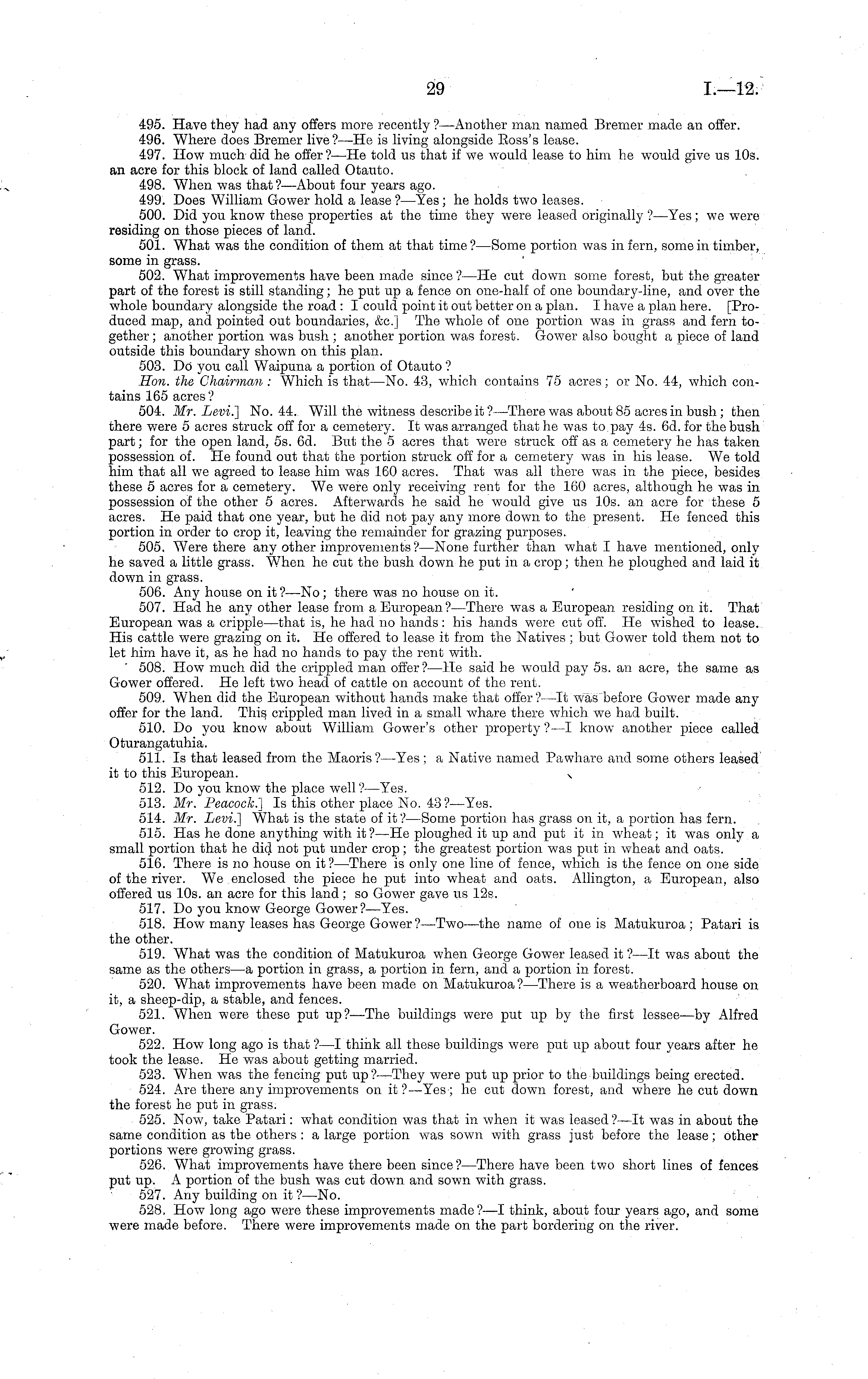 495. Have they had any offers more recently ? —Another man named Bremer made an offer. 496. Where does Bremer live?—He is living alongside Ross's lease. 497. How much did he offer?—He told us that if we would lease to him he would give us 10s. an acre for this block of land called Otauto. 498. When was that? —About four years ago. 499. Does William Gower hold a lease ? —Yes; he holds two leases. 500. Did you know these properties at the time they were leased originally ? —Yes ; we were residing on those pieces of land. 501. What was the condition of them at that time?— Some portion was in fern, some in timber, some in grass. 502. What improvements have been made since? —He cut down some forest, but the greater part of the forest is still standing; he put up a fence on. one-half of one boundary-line, and over the whole boundary alongside the road : I could point it out better on a plan. I have a plan here. [Produced map, and pointed out boundaries, &c] The whole of one portion was in grass and fern together ; another portion was bush ; another portion was forest. Gower also bought a piece of land outside this boundary shown on this plan. 503. Do you call Waipuna a portion of Otauto ? Hon. the Chairman : Which is that —No. 43, which contains 75 acres; or No. 44, which contains 165 acres? 504. Mr. Levi.] No. 44. Will the witness describe it ?—There was about 85 acres in bush; then there were 5 acres struck off for a cemetery. It was arranged that he was to.pay 4s. 6d. for the bush part; for the open land, ss. 6d. But the 5 acres that were struck off as a cemetery he has taken possession of. He found out that the portion struck off for a cemetery was in his lease. We told him that all we agreed to lease him was 160 acres. That was all there was in the piece, besides these 5 acres for a cemetery. We were only receiving rent for the 160 acres, although he was in possession of the other 5 acres. Afterwards he said he would give us 10s. an acre for these 5 acres. He paid that one year, but he did not pay any more down to the present. He fenced this portion in order to crop it, leaving the remainder for grazing purposes. 505. Were there any other improvements?— None further than what I have mentioned, only he saved a little grass. When he cut the bush down he put in a crop; then he ploughed and laid it down in grass. 506. Any house on it ?—No ; there was no house on it. 507. Had he any other lease from a European?— There was a European residing on it. That European was a cripple—that is, he had no hands : his hands were cut off. He wished to lease. His cattle were grazing on it. He offered to lease it from the Natives ; but Gower told them not to let him have it, as he had no hands to pay the rent with. 508. How much did the crippled man offer ? —He said he -would pay ss. an acre, the same as Gower offered. He left two head of cattle on account of the rent. 509. When did the European without hands make that offer ?—lt was before Gower made any offer for the land. This crippled man lived in a small whare there which we had built. 510. Do you know about William Gower's other property ?—I know another piece called Oturangatuhia. 511. Is that leased from the Maoris? —Yes; a Native named Pawhare and some others leased it to this European. s 512. Do you know the place well?— Yes. 513. Mr. Peacock.] Is this other place No. 43 ? —Yes. 514. Mr. Levi.] What is the state of it ?—Some portion has grass on it, a portion has fern. 515. Has he done anything with it ?—He ploughed it up and put it in wheat; it was only a small portion that he did not put under crop; the greatest portion was put in wheat and oats. 516. There is no house on it ?—There is only one line of fence, which is the fence on one side of the river. We enclosed the piece he put into wheat and oats. Allington, a European, also offered us 10s. an acre for this land; so Gower gave us 12s. 517. Do you know 7 George Gower?—Yes. 518. How many leases has George Gower ? —Two—the name of one is Matukuroa ; Patari is the other. 519. What was the condition of Matukuroa when George Gower leased it ?—lt was about the same as the others —a portion in grass, a portion in fern, and a portion in forest. 520. What improvements have been made on Matukuroa?—There is a weatherboard house on it, a sheep-dip, a stable, and fences. 521. When were these put up?— The buildings were put up by the first lessee —by Alfred Gower. 522. How long ago is that ?—I think all these buildings were put up about four years after he took the lease. He was about getting married. 523. When was the fencing put up?— They were put up prior to the buildings being erected. 524. Are there any improvements on it?— Yes; he cut down forest, and where he cut down the forest he put in grass. 525. Now, take Patari: what condition was that in when it was leased?—lt was in about the same condition as the others : a large portion was sown with grass just before the lease; other portions were growing grass. 526. What improvements have there been since? —There have been two short lines of fences put up. A portion of the bush was cut down and sown with grass. 527. Any building on it ?—No. 528. How long ago were these improvements made?—l think, about four years ago, and some were made before. There were improvements made on the part bordering on the river.