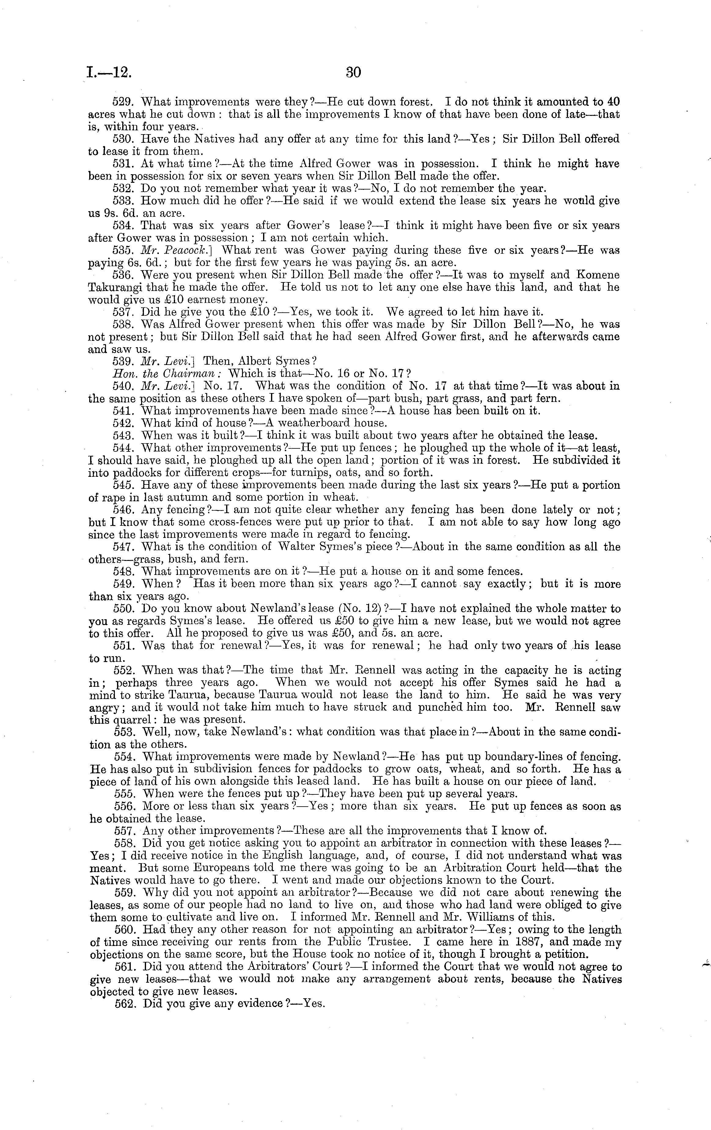 529. What improvements were they?—He cut down forest. Ido not think it amounted to 40 acres what he cut down : that is all the improvements I know of that have been done of late—that is, within four years. 530. Have the Natives had any offer at any time for this land ?—Yes ; Sir Dillon Bell offered to lease it from them. 531. At w 7 hat time ?—At the time Alfred Gower was in possession. I think he might have been in possession for six or seven years when Sir Dillon Bell made the offer. 532. Do you not remember what year it was ?—No, I do not remember the year. 533. How much did he offer ? —He said if we would extend the lease six years he would give us 9s. 6d. an acre. 534. That was six years after Gower's lease ?—I think it might have been five or six years after Gower was in possession ; I am not certain which. 535. Mr. Peacock.] What rent was Gower paying during these five or six years?—He was paying 6s. 6d.; but for the first few years he was paying ss. an acre. 536. Were you present when Sir Dillon Bell made the offer ?—lt was to myself and Komene Takurangi that he made the offer. He told us not to let any one else have this land, and that he would give us £10 earnest money. 537. Did he give you the £10 ?—Yes, we took it. We agreed to let him have it. 538. Was Alfred Gower present when this offer was made by Sir Dillon Bell ?—No, he was not present; but Sir Dillon Bell said that he had seen Alfred Gower first, and he afterwards came and saw us. 539. Mr. Levi.] Then, Albert Symes? Hon. the Chairman : Which is that —No. 16 or No. 17 ? 540. Mr. Levi.] No. 17. What was the condition of No. 17 at that time?—lt was about in the same position as these others I have spoken of—part bush, part grass, and part fern. 541. What improvements have been made since?—A house has been built on it. 542. What kind of house? —A weatherboard house. 543. When was it built ? —I think it was built about two years after he obtained the lease. 544. What other improvements?—He put up fences; he ploughed up the whole of it—at least, I should have said, he ploughed up all the open land; portion of it was in forest. He subdivided it into paddocks for different crops—for turnips, oats, and so forth. 545. Have any of these improvements been made during the last six years ? —He put a portion of rape in last autumn and some portion in wheat. 546. Any fencing ? —I am not quite clear whether any fencing has been done lately or not; but I know that some cross-fences were put up prior to that. lam not able to say how long ago since the last improvements were made in regard to fencing. 547. What is the condition of Walter Symes's piece ?—About in the same condition as all the others —grass, bush, and fern. 548. What improvements are on it ?—He put a house on it and some fences. 549. When ? Has it been more than six years ago ? —I cannot say exactly; but it is more than six years ago. 550. Do you know about Newland's lease (No. 12) ?—I have not explained the whole matter to you as regards Symes's lease. He offered us £50 to give him a new lease, but we would not agree to this offer. All he proposed to give us was £50, and ss. an acre. 551. Was that for renewal ? —Yes, it was for renewal; he had only two years of his lease to run. 552. When was that? —The time that Mr. Rennell was acting in the capacity he is acting in; perhaps three years ago. When we would not accept his offer Symes said he had a mind to strike Taurua, because Taurua would not lease the land to him. He said he was very angry; and it would not take him much to have struck and punched him too. Mr. Rennell saw this quarrel: he was present. 553. Well, now, take Newland's : what condition was that place in? —About in the same condition as the others. 554. What improvements were made by Newland ? —He has put up boundary-lines of fencing. He has also put in subdivision fences for paddocks to grow oats, wheat, and so forth. He has a piece of land of his own alongside this leased land. He has built a house on our piece of land. 555. When were the fences put up ?—They have been put up several years. 556. More or less than six years ?—Yes ; more than six years. He put up fences as soon as he obtained the lease. 557. Any other improvements ? —These are all the improvements that I know of. 558. Did you get notice asking you to appoint an arbitrator in connection with these leases ? — Yes; I did receive notice in the English language, and, of course, I did not understand what was meant. But some Europeans told me there was going to be an Arbitration Court held—that the Natives would have to go there. I went and made our objections known to the Court. 559. Why did you not appoint an arbitrator ? —Because we did not care about renewing the leases, as some of our people had no land to live on, and those who had land were obliged to give them some to cultivate and live on. I informed Mr. Rennell and Mr. Williams of this. 560. Had they any other reason for not appointing an arbitrator?— Yes; owing to the length of time since receiving our rents from the Public Trustee. I came here in 1887, and made my objections on the same score, but the House took no notice of it, though I brought a petition. 561. Did you attend the Arbitrators' Court ?—I informed the Court that w 7 e would not agree to give new leases —that we would not make any arrangement about rents, because the Natives objected to give new leases. 562. Did you give any evidence ?—Yes.