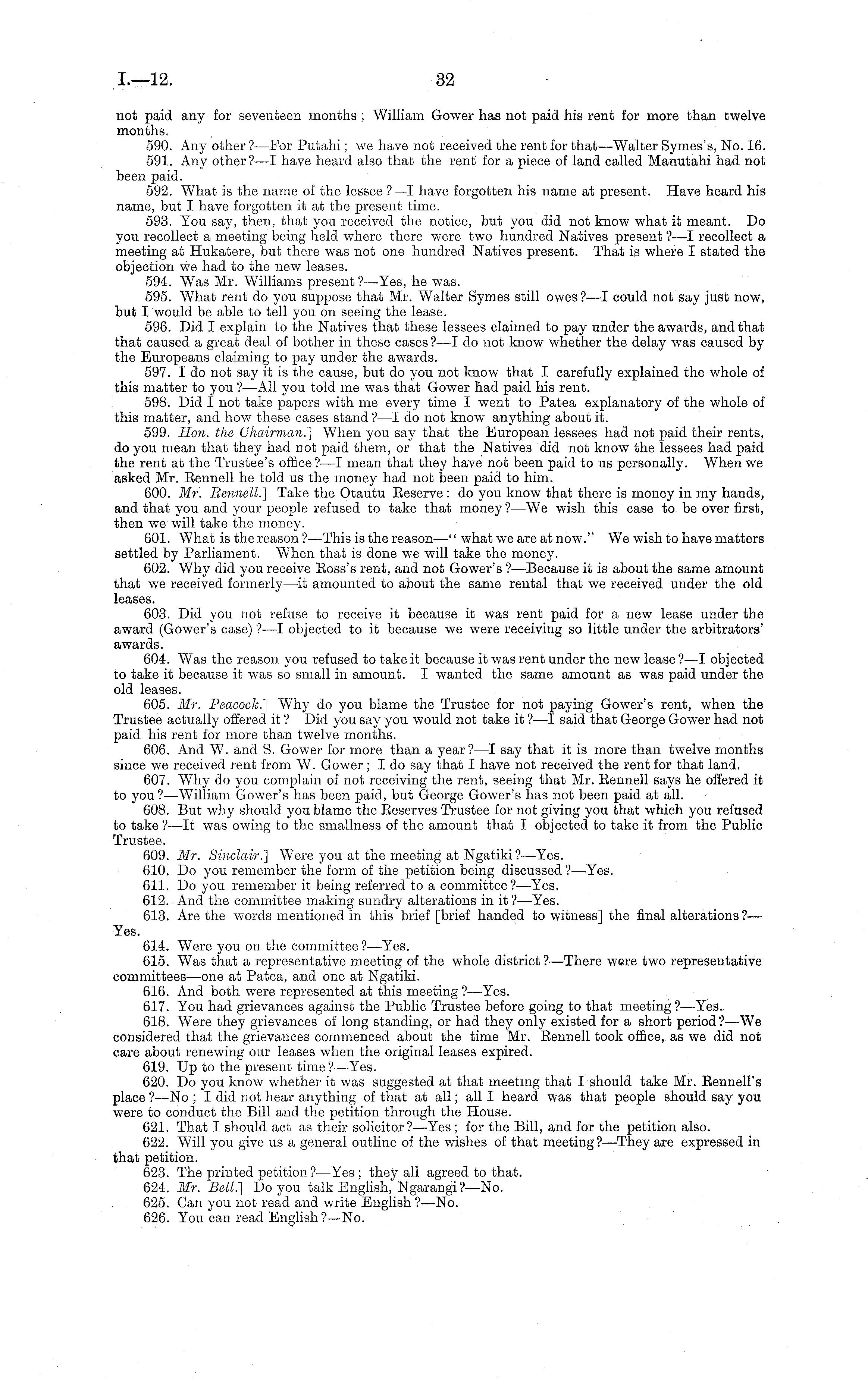 not paid any for seventeen months ; William Gower has not paid his rent for more than twelve months. 590. Any other ?—For Putahi; we have not received the rent for that—Walter Symes's, No. 16. 591. Any other?—l have heard also that the rent for a piece of land called Manutahi had not been paid. 592. W T hat is the name of the lessee ?—I have forgotten his name at present. Have heard his name, but I have forgotten it at the present time. 593. You say, then, that you received the notice, but you did not know what it meant. Do you recollect a meeting being held where there were two hundred Natives present ?—I recollect a meeting at Hukatere, but there was not one hundred Natives present. That is where I stated the objection we had to the new leases. 594. Was Mr. Williams present?— Yes, he was. 595. What rent do you suppose that Mr. Walter Symes still owes?—l could not say just now, but I would be able to tell you on seeing the lease. 596. Did I explain to the Natives that these lessees claimed to pay under the awards, and that that caused a great deal of bother in these cases ?—I do not know whether the delay was caused by the Europeans claiming to pay under the awards. 597. I do not say it is the cause, but do you not know that I carefully explained the whole of this matter to you ?—All you told me was that Gower had paid his rent. 598. Did I not take papers with me every time I went to Patea explanatory of the whole of this matter, and how these cases stand ?—I do not know anything about it. 599. Hon. the Chairman.] When you say that the European lessees had not paid their rents, do you mean that they had not paid them, or that the Natives did not know the lessees had paid the rent at the Trustee's office?—l mean that they have not been paid to us personally. When we asked Mr. Rennell he told us the money had not been paid to him. 600. Mr. Bennett.] Take the Otautu Reserve :do you know that there is money in my hands, and that you and your people refused to take that money ?—We wish this case to be over first, then we will take the money. 601. What is the reason ?—This is the reason —" what we are at now." We wish to have matters settled by Parliament. When that is done we will take the money. 602. Why did you receive Ross's rent, and not Gower's ? —Because it is about the same amount that we received formerly—it amounted to about the same rental that we received under the old leases. 603. Did you not refuse to receive it because it was rent paid for a new lease under the award (Gower's case) ?—I objected to it because we were receiving so little under the arbitrators' awards. 604. Was the reason you refused to take it because it was rent under the new lease ?—I objected to take it because it was so small in amount. I wanted the same amount as was paid under the old leases. 605. Mr. Peacock. \ Why do you blame the Trustee for not paying Gower's rent, when the Trustee actually offered it ? Did you say you would not take it ? —I said that George Gower had not paid his rent for more than twelve months. 606. And W. and S. Gower for more than a year?—l say that it is more than twelve months since we received rent from W. Gower; Ido say that I have not received the rent for that land. 607. Why do you complain of not receiving the rent, seeing that Mr. Rennell says he offered it to you? —William Gower's has been paid, but George Gower's has not been paid at all. 608. But why should you blame the Reserves Trustee for not giving you that which you refused to take ?—lt was owing to the smallness of the amount that I objected to take it from the Public Trustee. 609. Mr. Sinclair.] Were you at the meeting at Ngatiki ? —Yes. 610. Do you remember the form of the petition being discussed ? —Yes. 611. Do you remember it being referred to a committee?— Yes. 612. And the committee making sundry alterations in it?— Yes. 613. Are the words mentioned in this brief [brief handed to witness] the final alterations ?— Yes. 614. Were you on the committee ?—Yes. 615. Was that a representative meeting of the whole district?— There were two representative committees—one at Patea, and one at Ngatiki. 616. And both were represented at this meeting ?—Yes. 617. You had grievances against the Public Trustee before going to that meeting? —Yes. 618. Were they grievances of long standing, or had they only existed for a short period?—We considered that the grievances commenced about the time Mr. Rennell took office, as we did not care about renewing our leases when the original leases expired. 619. Up to the present time? —Yes. 620. Do you know whether it was suggested at that meeting that I should take Mr. Rennell's place ? —No ; I did not hear anything of that at all; all I heard was that people should say you were to conduct the Bill and the petition through the House. 621. That I should act as their solicitor?— Yes; for the Bill, and for the petition also. 622. Will you give us a general outline of the wishes of that meeting?— They are expressed in that petition. 623. The printed petition?— Yes; they all agreed to that. 624. Mr. Bell] Do you talk English, Ngarangi?—No. . . 625. Can you not read and write English?— No. 626. You can read English ?—No.