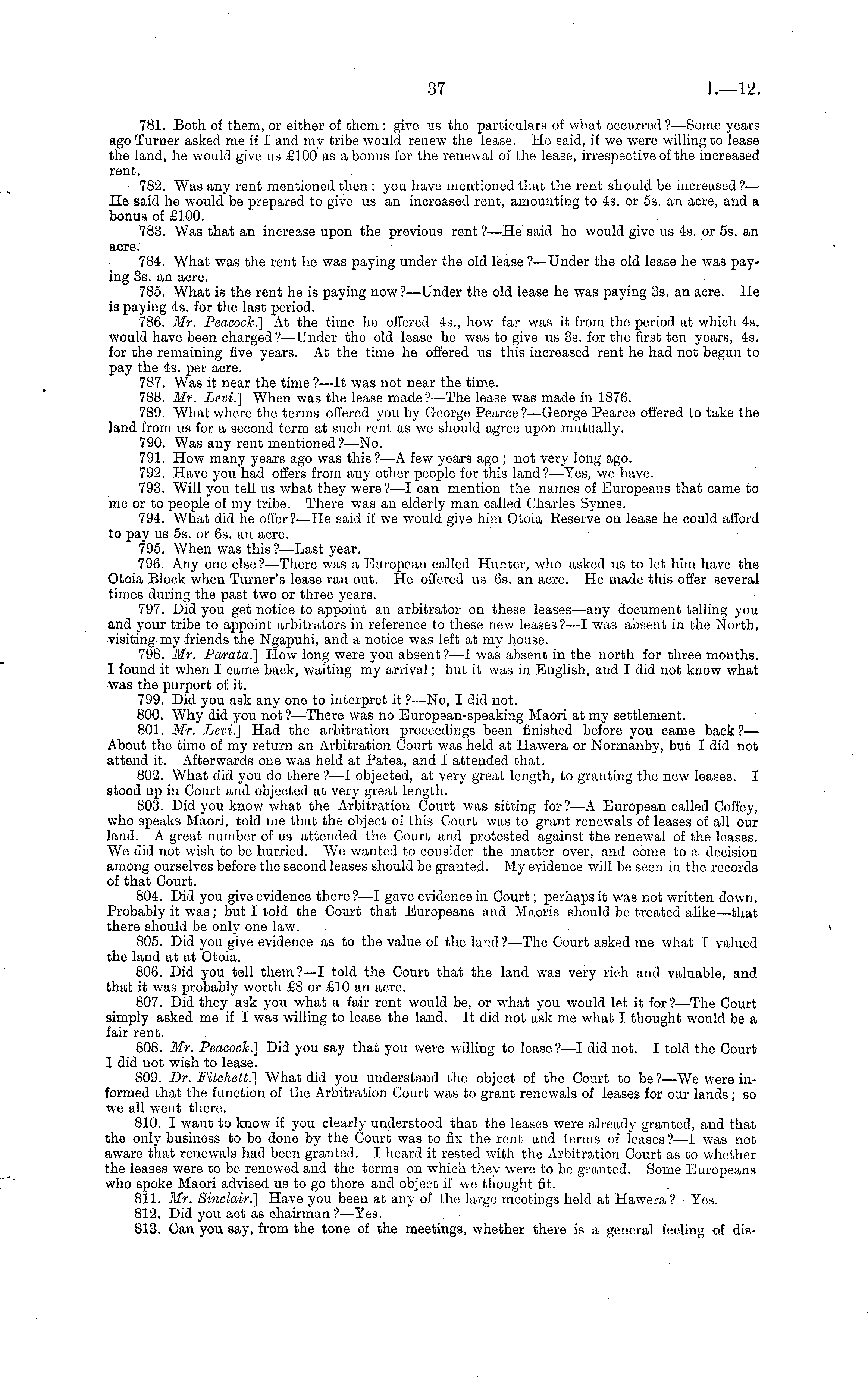 781. Both of them, or either of them : give us the particulars of what occurred ?—Some years ago Turner asked me if I and my tribe would renew the lease. He said, if we were willing to lease the land, he would give us £100 as a bonus for the renewal of the lease, irrespective of the increased rent. 782. Was any rent mentioned then : you have mentioned that the rent should be increased? — He said he would be prepared to give us an increased rent, amounting to 4s. or ss. an acre, and a bonus of £100. 783. Was that an increase upon the previous rent ?—He said he would give us 4s. or ss. an acre. 784. What was the rent he was paying under the old lease ?—Under the old lease he was paying 3s. an acre. 785. What is the rent he is paying now? —Under the old lease he was paying 3s. an acre. He is paying 4s. for the last period. 786. Mr. Peacock.] At the time he offered 45., how far was it from the period at which 4s. would have been charged ?—Under the old lease he was to give us 3s. for the first ten years, 4s. for the remaining five years. At the time he offered us this increased rent he had not begun to pay the 4s. per acre. 787. Was it near the time ?—lt was not near the time. 788. Mr. Levi.] When was the lease made? —The lease was made in 1876. 789. What where the terms offered you by George Pearce?—George Pearce offered to take the land from us for a second term at such rent as we should agree upon mutually. 790. Was any rent mentioned ?—No. 791. How many years ago was this ?—A few years ago ; not very long ago. 792. Have you had offers from any other people for this land?— Yes, we have. 793. Will you tell us what they were? —I can mention the names of Europeans that came to me or to people of my tribe. There was an elderly man called Charles Symes. 794. What did he offer?-—He said if we would give him Otoia Reserve on lease he could afford to pay us ss. or 6s. an acre. 795. When was this?— Last year. 796. Any one else ?—There was a European called Hunter, who asked us to let him have the Otoia Block when Turner's lease ran out. He offered us 6s. an acre. He made this offer several times during the past two or three years. 797. Did you get notice to appoint an arbitrator on these leases —any document telling you and your tribe to appoint arbitrators in reference to these new leases ?—I was absent in the North, visiting my friends the Ngapuhi, and a notice was left at my house. 798. Mr. Parata.] How long were you absent?—l was absent in the north for three months. I found it when I came back, waiting my arrival; but it was in English, and I did not know what was the purport of it. 799. Did you ask any one to interpret it ?—No, I did not. 800. Why did you not ? —There was no European-speaking Maori at my settlement. 801. Mr. Levi.] Had the arbitration proceedings been finished before you came back?— About the time of my return an Arbitration Court was held at Hawera or Normanby, but I did not attend it. Afterwards one was held at Patea, and I attended that. 802. What did you do there ?—I objected, at very great length, to granting the new leases. I stood up in Court and objected at very great length. 803. Did you know what the Arbitration Court was sitting for?—A European called Coffey, who speaks Maori, told me that the object of this Court was to grant renewals of leases of all our land. A great number of us attended the Court and protested against the renewal of the leases. We did not wish to be hurried. We wanted to consider the matter over, and come to a decision among ourselves before the second leases should be granted. My evidence will be seen in the records of that Court. 804. Did you give evidence there ?—I gave evidence in Court; perhaps it was not written down. Probably it was; but I told the Court that Europeans and Maoris should be treated alike—that there should be only one law. 805. Did you give evidence as to the value of the land ?—The Court asked me what I valued the land at at Otoia. 806. Did you tell them?—l told the Court that the land was very rich and valuable, and that it was probably worth £8 or £10 an acre. 807. Did they ask you what a fair rent would be, or what you would let it for?— The Court simply asked me if I was willing to lease the land. It did not ask me what I thought would be a fair rent. 808. Mr. Peacock.] Did you say that you were willing to lease ?—I did not. I told the Court I did not wish to lease. 809. Dr. Fitchetl] What did you understand the object of the Court to be?—We were informed that the function of the Arbitration Court was to grant renewals of leases for our lands; so we all went there. 810. I want to know if you clearly understood that the leases were already granted, and that the only business to be done by the Court was to fix the rent and terms of leases ?—I was not aware that renewals had been granted. I heard it rested with the Arbitration Court as to whether the leases were to be renewed and the terms on which they were to be granted. Some Europeans who spoke Maori advised us to go there and object if we thought fit. 811. Mr. Sinclair.] Have you been at any of the large meetings held at Hawera?—Yes. 812. Did you act as chairman ?—Yes. 813. Can you say, from the tone of the meetings, whether there is a general feeling of dis-