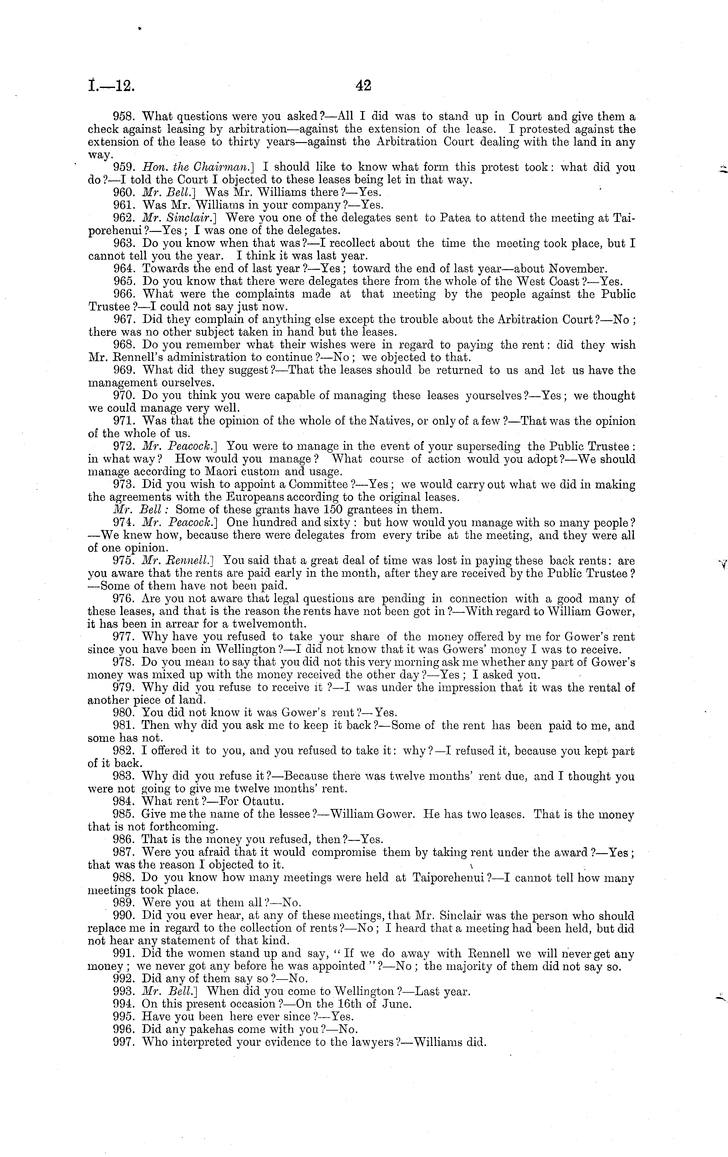958. What questions were you asked? —All I did was to stand up in Court and give them a check against leasing by arbitration—against the extension of the lease. I protested against the extension of the lease to thirty years—against the Arbitration Court dealing with the land in any way. 959. Hon. the Chairman.] I should like to know what form this protest took: what did you do ?—I told the Court I objected to these leases being let in that way. 960. Mr. Bell] Was Mr. Williams there?— Yes. 961. Was Mr. Williams in your company?— Yes. 962. Mr. Sinclair.] Were you one of the delegates sent to Patea to attend the meeting at Taiporehenui ? —Yes ; I was one of the delegates. 963. Do you know when that was? —I recollect about the time the meeting took place, but I cannot tell you the year. I think it was last year. 964. Towards the end of last year ? —Yes ; toward the end of last year—about November. 965. Do you know that there were delegates there from the whole of the West Coast ? —Yes. 966. What were the complaints made at that meeting by the people against the Public Trustee ?—I could not say just now. 967. Did they complain of anything else except the trouble about the Arbitration Court?—No ; there was no other subject taken in hand but the leases. 968. Do you remember what their wishes were in regard to paying the rent: did they wish Mr. Rennell's administration to continue ? —No ; we objected to that. 969. What did they suggest? —That the leases should be returned to us and let us have the management ourselves. 970. Do you think you were capable of managing these leases yourselves? —Yes; we thought we could manage very well. 971. Was that the opinion of the whole of the Natives, or only of a few ?—That was the opinion of the whole of us. 972. Mr. Peacock.] You were to manage in the event of your superseding the Public Trustee : in what way ? How would you manage ? What course of action would you adopt ?—We should manage according to Maori custom and usage. 973. Did you wish to appoint a Committee ?—Yes ; we would carry out what we did in making the agreements with the Europeans according to the original leases. Mr. Bell: Some of these grants have 150 grantees in them. 974. Mr. Peacock.] One hundred and sixty : but how would you manage with so many people ? —We knew how, because there were delegates from every tribe at the meeting, and they were all of one opinion. 975. Mr. Bennett.] You said that a great deal of time was lost in paying these back rents: are you aw 7 are that the rents are paid early in the month, after they are received by the Public Trustee ? —Some of them have not been paid. 976. Are you not aware that legal questions are pending in connection with a good many of these leases, and that is the reason the rents have not been got in ? —With regard to William Gower, it has been in arrear for a twelvemonth. 977. Why have you refused to take your share of the money offered by me for Gower's rent since you have been in Wellington ?—I did not know that it was Gowers' money I was to receive. 978. Do you mean to say that you did not this very morning ask me whether any part of Gower's money was mixed up with the money received the other day ?—Yes ; I asked you. 979. Why did you refuse to receive it ?—I was under the impression that it was the rental of another piece of land. 980. You did not know it was Gower's rent?— Yes. 981. Then why did you ask me to keep it back?— Some of the rent has been paid to me, and some has not. 982. I offered it to you, and you refused to take it: why?—l refused it, because you kept part of it back. 983. Why did you refuse it ?—Because there was twelve months' rent due, and I thought you were not going to give me twelve months' rent. 984. What rent ?—For Otautu. 985. Give me the name of the lessee ?—William Gower. He has two leases. That is the money that is not forthcoming. 986. That is the money you refused, then?— Yes. 987. Were you afraid that it would compromise them by taking rent under the award ?—Yes ; that was the reason I objected to it. . 988. Do you know how many meetings were held at Taiporehenui ? —I cannot tell how many meetings took place. 989. Were you at them all?— No. 990. Did you ever hear, at any of these meetings, that Mr. Sinclair was the person who should replace me in regard to the collection of rents ?—No ; I heard that a meeting had been held, but did not hear any statement of that kind. 991. Did the women stand up and say, " If we do away with Rennell we will never get any money ; we never got any before he was appointed " ? —No ; the majority of them did not say so. 992. Did any of them say so ? —No. 993. Mr. Bell.] When did you come to Wellington ?—Last year. 994. On this present occasion ?—On the 16th of June. 995. Have you been here ever since ?—Yes. 996. Did any pakehas come with you?— No. 997. Who interpreted your evidence to the lawyers?— Williams did.