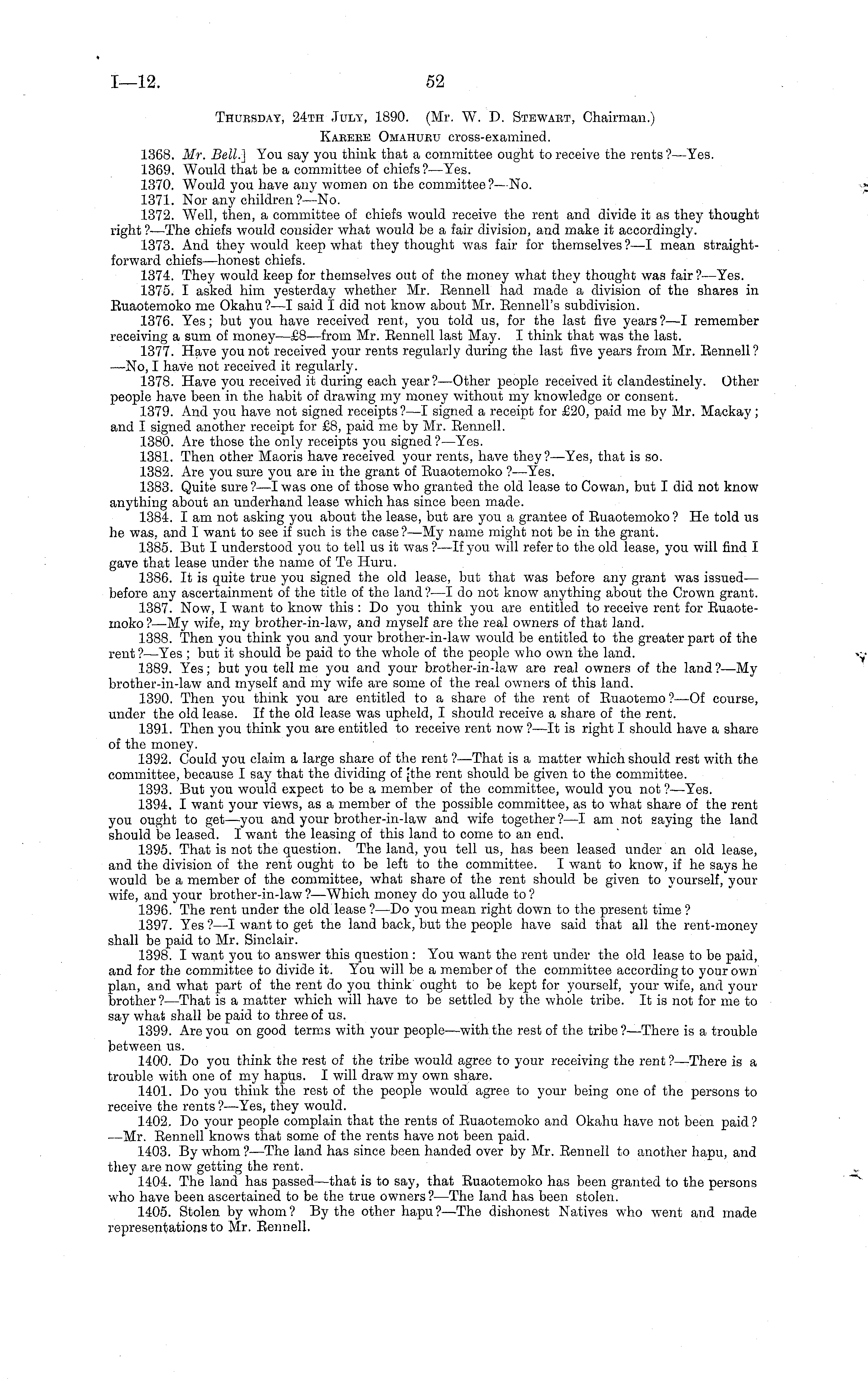 Thursday, 24th July, 1890. (Mr. W. D. Stewart, Chairman.) Karere Omahueu cross-examined. 1368. Mr. Bell] You say you think that a committee ought to receive the rents? —Yes. 1369. Would that be a committee of chiefs?— Yes. 1370. Would you have any women on the committee?— No. 1371. Nor any children ?—No. 1372. Well, then, a committee of chiefs would receive the rent and divide it as they thought right ?—The chiefs would consider what would be a fair division, and make it accordingly. 1373. And they would keep what they thought was fair for themselves?—l mean straightforward chiefs —honest chiefs. 1374. They would keep for themselves out of the money what they thought was fair ?—Yes. 1375. I asked him yesterday whether Mr. Rennell had made a division of the shares in Ruaotemoko me Okahu?—l said I did not know about Mr. Rennell's subdivision. 1376. Yes; but you have received rent, you told us, for the last five years ? —I remember receiving a sum of money —£B—from8 —from Mr. Rennell last May. I think that was the last. 1377. Have you not received your rents regularly during the last five years from Mr. Rennell ? —No, I have not received it regularly. 1378. Have you received it during each year?— Other people received it clandestinely. Other people have been in the habit of drawing my money without my knowledge or consent. 1379. And you have not signed receipts? —I signed a receipt for £20, paid me by Mr. Mackay; and I signed another receipt for £8, paid me by Mr. Rennell. 1380. Are those the only receipts you signed ?—Yes. 1381. Then other Maoris have received your rents, have they?— Yes, that is so. 1382. Are you sure you are in the grant of Ruaotemoko ?—Yes. 1383. Quite sure ?—I was one of those who granted the old lease to Cowan, but I did not know anything about an underhand lease which has since been made. 1384. lam not asking you about the lease, but are you a grantee of Ruaotemoko ? He told us he was, and I want to see if such is the case?—My name might not be in the grant. 1385. But I understood you to tell us it was ?—lf you will refer to the old lease, you will find I gave that lease under the name of Te Huru. 1386. It is quite true you signed the old lease, but that was before any grant was issued— before any ascertainment of the title of the land?—l do not know anything about the Crown grant. 1387. Now, I want to know this : Do you think you are entitled to receive rent for Ruaotemoko ?—My wife, my brother-in-law, and myself are the real owners of that land. 1388. Then you think you and your brother-in-law would be entitled to the greater part of the rent ?—Yes ; but it should be paid to the whole of the people who own the land. 1389. Yes; but you tell me you and your brother-in-law are real owners of the land ?—My brother-in-law and myself and my wife are some of the real owners of this land. 1390. Then you think you are entitled to a share of the rent of Ruaotemo ?—Of course, under the old lease. If the old lease was upheld, I should receive a share of the rent. 1391. Then you think you are entitled to receive rent now ? —lt is right I should have a share of the money. 1392. Could you claim a large share of the rent ?—That is a matter which should rest with the committee, because I say that the dividing of -the rent should be given to the committee. 1393. But you would expect to be a member of the committee, w 7 ould you not ? —Yes. 1394. I want your views, as a member of the possible committee, as to what share of the rent you ought to get—you and your brother-in-law and wife together?—l am not saying the land should be leased. I want the leasing of this land to come to an end. 1395. That is not the question. The land, you tell us, has been leased under an old lease, and the division of the rent ought to be left to the committee. I want to know, if he says he w 7 ould be a member of the committee, what share of the rent should be given to yourself, your wife, and your brother-in-law ?—Which money do you allude to ? 1396. The rent under the old lease ?—Do you mean right down to the present time ? 1397. Yes ? —I want to get the land back, but the people have said that all the rent-money shall be paid to Mr. Sinclair. 1398. I want you to answer this question : You want the rent under the old lease to be paid, and for the committee to divide it. You will be a member of the committee according to your own plan, and what part of the rent do you think ought to be kept for yourself, your wife, and your brother ? —That is a matter which will have to be settled by the whole tribe. It is not for me to say what shall be paid to three of us. 1399. Are you on good terms with your people—with the rest of the tribe?— There is a trouble between us. 1400. Do you think the rest of the tribe would agree to your receiving the rent?— There is a trouble with one of my hapus. I will draw my own share. 1401. Do you think the rest of the people would agree to your being one of the persons to receive the rents ?—Yes, they would. 1402. Do your people complain that the rents of Ruaotemoko and Okahu have not been paid? —Mr. Rennell knows that some of the rents have not been paid. 1403. By whom ? —The land has since been handed over by Mr. Rennell to another hapu, and they are now getting the rent. 1404. The land has passed—that is to say, that Ruaotemoko has been granted to the persons who have been ascertained to be the true owners ? —The land has been stolen. 1405. Stolen by whom? By the other hapu?—The dishonest Natives who went and made representations to Mr. Rennell.