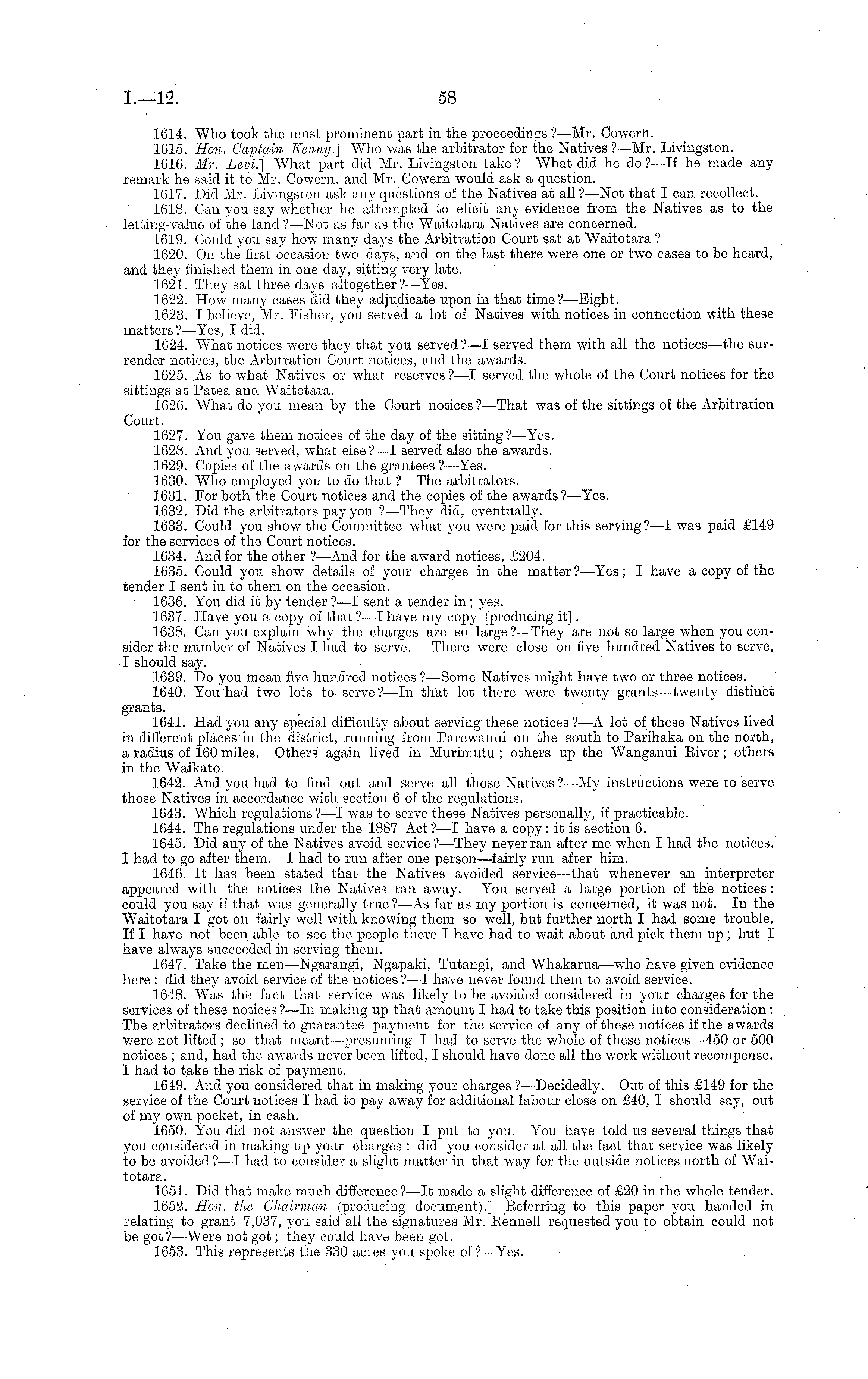 1614. Who took the most prominent part in the proceedings ?—Mr. Cowern. 1615. Hon. Captain Kenny.] Who was the arbitrator for the Natives ?—Mr. Livingston. 1616. Mr. Levi.] What part did Mr. Livingston take ? What did he do ?—lf he made any remark he said it to Mr. Cowern, and Mr. Cowern would ask a question. 1617. Did Mr. Livingston ask any questions of the Natives at all ?—Not that I can recollect. 1618. Can you say whether he attempted to elicit any evidence from the Natives as to the letting-value of the land? —Not as far as the Waitotara Natives are concerned. 1619. Could you say how many days the Arbitration Court sat at Waitotara ? 1620. On the first occasion two days, and on the last there w r ere one or two cases to be heard, and they finished them in one day, sitting very late. 1621. They sat three days altogether?— Yes. 1622. How many cases did they adjudicate upon in that time?— Eight. 1623. I believe, Mr. Fisher, you served a lot of Natives with notices in connection with these matters? —Yes, I did. 1624. What notices were they that you served? —I served them with all the notices —the surrender notices, the Arbitration Court notices, and the awards. 1625. .As to what Natives or what reserves?—l served the whole of the Court notices for the sittings at Patea and W T aitotara. 1626. What do you mean by the Court notices?— That was of the sittings of the Arbitration Court. 1627. You gave them, notices of the day of the sitting?— Yes. 1628. And you served, what else ?—I served also the awards. 1629. Copies of the awards on the grantees ? —Yes. 1630. Who employed you to do that ? —The arbitrators. 1631. For both the Court notices and the copies of the awards? —Yes. 1632. Did the arbitrators pay you ?—They did, eventually. 1633. Could you show the Committee what you were paid for this serving?—l was paid £149 for the services of the Court notices. 1634. And for the other ? —And for the award notices, £204. 1635. Could you show details of your charges in the matter? —Yes; I have a copy of the tender I sent in to them on the occasion. 1636. You did it by tender ? —I sent a tender in; yes. 1637. Have you a copy of that?—l have my copy [producing it]. 1638. Can you explain why the charges are so large ?—They are not so large when you consider the number of Natives I had to serve. There were close on five hundred Natives to serve, I should say. 1639. Do you mean five hundred notices ?—Some Natives might have two or three notices. 1640. You had two lots to serve ? —ln that lot there were twenty grants —twenty distinct grants. 1641. Had you any special difficulty about serving these notices ?—A lot of these Natives lived in different places in the district, running from Parewanui on the south to Parihaka on the north, a radius of 160 miles. Others again lived in Murimutu ; others up the Wanganui River; others in the Waikato. 1642. And you had to find out and serve all those Natives ?—My instructions were to serve those Natives in accordance with section 6 of the regulations. 1643. Which regulations ? —I was to serve these Natives personally, if practicable. 1644. The regulations under the 1887 Act ? —I. have a copy: it is section 6. 1645. Did any of the Natives avoid service?— They never ran after me when I had the notices. I had to go after them. I had to run after one person—fairly run after him. 1646. It has been stated that the Natives avoided service—that whenever an interpreter appeared with the notices the Natives ran away. You served a large portion of the notices: could you say if that was generally true ?—As far as my portion is concerned, it was not. In the Waitotara I got on fairly well with knowing them so well, but further north I had some trouble. If I have not been able to see the people there I have had to wait about and pick them up; but I have always succeeded in serving them. 1647. Take the men—Ngarangi, Ngapaki, Tutangi, and Whakarua —who have given evidence here : did they avoid service of the notices ?—I have never found them to avoid service. 1648. Was the fact that service was likely to be avoided considered in your charges for the services of these notices ?—ln making up that amount I had to take this position into consideration : The arbitrators declined to guarantee payment for the service of any of these notices if the awards Were not lifted ; so that meant —presuming I had to serve the whole of these notices—4so or 500 notices ; and, had the awards never been lifted, I should have done all the work without recompense. I had to take the risk of payment. 1649. And you considered that in making your charges ?—Decidedly. Out of this £149 for the service of the Court notices I had to pay away for additional labour close on £40, I should say, out of my own pocket, in cash. 1650. You did not answer the question I put to you. You have told us several things that you considered in making up your charges : did you consider at all the fact that service was likely to be avoided ?—I had to consider a slight matter in that way for the outside notices north of Waitotara. 1651. Did that make much difference?—lt made a slight difference of £20 in the whole tender. 1652. Hon. the Chairman (producing document).] Referring to this paper you handed in relating to grant 7,037, you said all the signatures Mr. Rennell requested you to obtain could not be got? —Were not got; they could have been got. 1653. This represents the 330 acres you spoke of?— Yes.