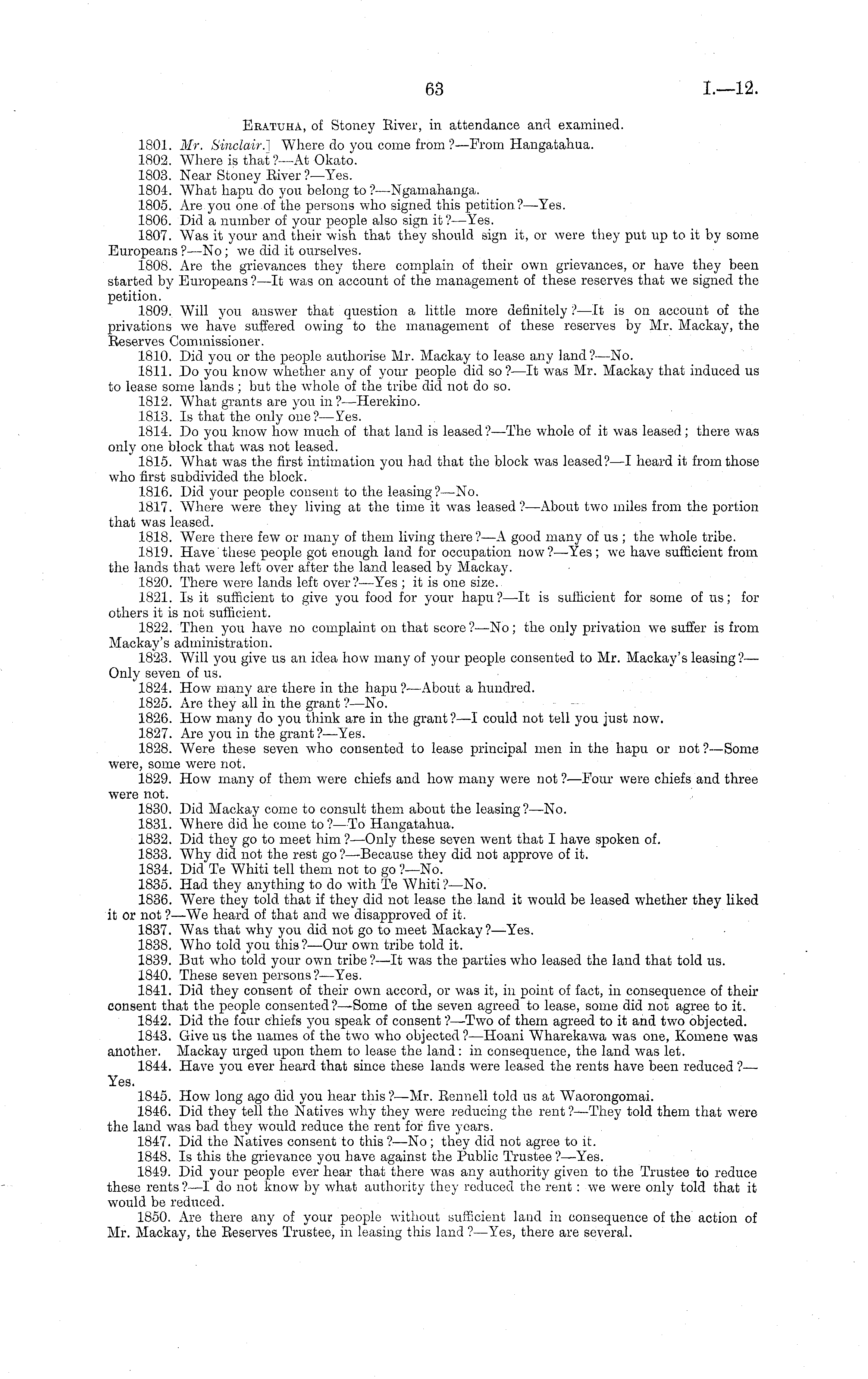 Eratuha, of Stoney River, in attendance and examined. 1801. Mr. Sinclair.'] Where do you come from ?—From Hangatahua. 1802. Where is that ?—At Okato. 1803. Near Stoney River ?—Yes. 1804. What hapu do you belong to?—Ngainahauga. 1805. Are you one of the persons who signed this petition?— Yes. 1806. Did a number of your people also sign it ?—Yes. 1807. Was it your and their wish that they should sign it, or were they put up to it by some Europeans ? —No ; we did it ourselves. 1808. Are the grievances they there complain of their own grievances, or have they been started by Europeans ?—lt was on account of the management of these reserves that we signed the petition. 1809. Will you answer that question a little more definitely ? —lt is on account of the privations we have suffered owing to the management of these reserves by Mr. Mackay, the Reserves Commissioner. 1810. Did you or the people authorise Mr. Mackay to lease any land?— No. 1811. Do you know whether any of your people did so? —It was Mr. Mackay that induced us to lease some lands ; but the whole of the tribe did not do so. 1812. W r hat grants are you in?—Herekino. 1813. Is that the only one?— Yes. 1814. Do you know how much of that land is leased?— The whole of it was leased; there was only one block that was not leased. 1815. What was the first intimation you had that the block was leased?—l heard it from those who first subdivided the block. 1816. Did your people consent to the leasing?— No. 1817. Where were they living at the time it was leased? —About two miles from the portion that was leased. 1818. Were there few or many of them living there?—A good many of us ; the whole tribe. 1819. Have these people got enough land for occupation now?— Yes; we have sufficient from the lands that were left over after the land leased by Mackay. 1820. There were lands left over? —Yes ; it is one size. 1821. Is it sufficient to give you food for your hapu?—lt is sufficient for some of us; for others it is not sufficient. 1822. Then you have no complaint on that score? —No; the only privation we suffer is from Mackay's administration. 1823. Will you give us an idea how many of your people consented to Mr. Mackay's leasing?— Only seven of us. 1824. How many are there in the hapu ? —About a hundred. 1825. Are they all in the grant ?—No. 1826. How many do you think are in the grant ? —I could not tell you just now. 1827. Are you in the grant ?—Yes. 1828. Were these seven who consented to lease principal men in the hapu or not?— Some were, some were not. 1829. How many of them were chiefs and how many were not ?—Four were chiefs and three were not. 1830. Did Mackay come to consult them about the leasing?— No. 1831. Where did he come to? —To Hangatahua. 1832. Did they go to meet him ?—Only these seven went that I have spoken of. 1833. Why did. not the rest go ?—Because they did not approve of it. 1834. Did Te Whiti tell them not to go ?—No. 1835. Had they anything to do with Te Whiti?—No. 1836. Were they told that if they did not lease the land it would be leased whether they liked it or not ?—We heard of that and we disapproved of it. 1837. Was that why you did not go to meet Mackay?—Yes. 1838. Wno told you this? —Our own tribe told it. 1839. But who told your own tribe ?—lt was the parties who leased the land that told us. 1840. These seven persons?— Yes. 1841. Did they consent of their own accord, or was it, in point of fact, in consequence of their consent that the people consented? —-Some of the seven agreed to lease, some did not agree to it. 1842. Did the four chiefs you speak of consent ? —Two of them agreed to it and two objected. 1843. Give us the names of the two who objected ? —Hoani Wharekawa was one, Komene was another. Mackay urged upon them to lease the land :in consequence, the land was let. 1844. Have you ever heard that since these lands were leased the rents have been reduced ?—■ Yes. 1845. How long ago did you hear this ?—Mr. Rennell told us at Waorongomai. 1846. Did they tell the Natives why they were reducing the rent ? —They told them that were the land was bad they would reduce the rent for five years. 1847. Did the Natives consent to this ?—No; they did not agree to it. 1848. Is this the grievance you have against the Public Trustee ? —Yes. 1849. Did your people ever hear that there was any authority given to the Trustee to reduce these rents ?—I do not know by what authority they reduced the rent :we were only told that it would be reduced. 1850. Are there any of your people without sufficient land in consequence of the action of Mr. Mackay, the Reserves Trustee, in leasing this land ? —Yes, there are several.