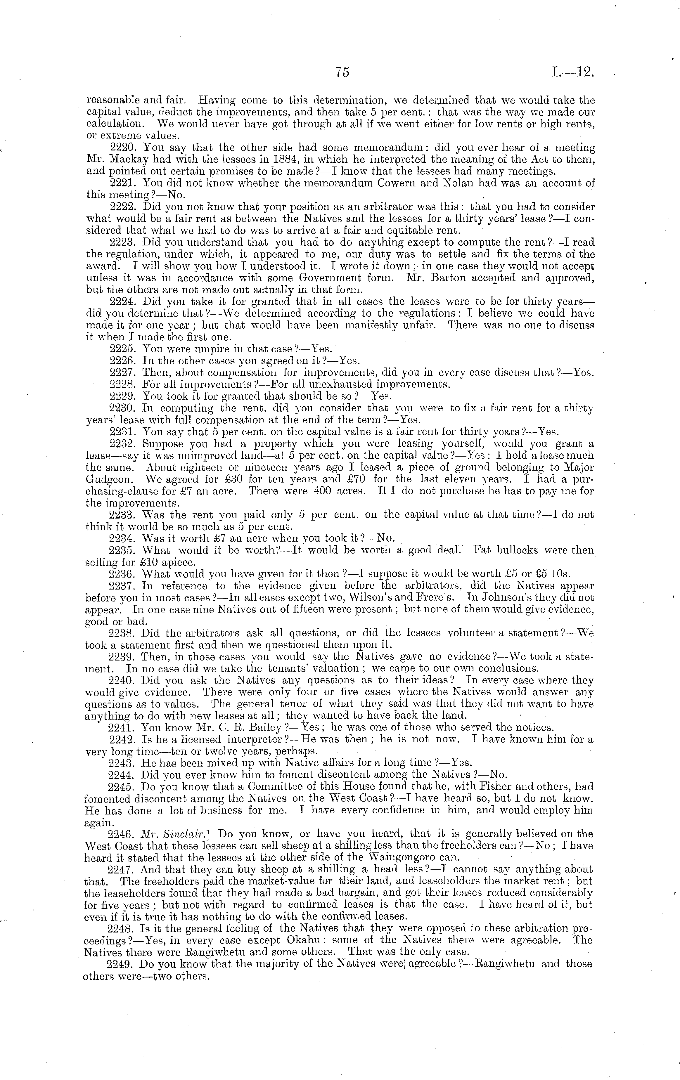 reasonable and fair. Having come to this determination, we determined that we would take the capital value, deduct the improvements, and then take 5 per cent.: that was the way we made our calculation. We would never have got through at all if we went either for low rents or high rents, or extreme values. 2220. say that the other side had some memorandum : did you ever hear of a meeting Mr. Mackay had with the lessees in 1884, in which he interpreted the meaning of the Act to them, and pointed out certain promises to be made?—l know that the lessees had many meetings. 2221. You did not know whether the memorandum Cowern and Nolan had was an account of this meeting?— No. 2222. Did you not know that your position as an arbitrator was this: that you had to consider what would be a fair rent as between the Natives and the lessees for a thirty years' lease ?—I considered that what we had to do was to arrive at a fair and equitable rent. 2223. Did you understand that you had to do anything except to compute the rent ?—I read the regulation, under which, it appeared to me, our duty was to settle and fix the terms of the award. I will show you how I understood it. I wrote it down;- in one case they would not accept unless it was in accordance with some Government form. Mr. Barton accepted and approved, but the others are not made out actually in that form. 2224. Did you take it for granted that in all cases the leases were to be for thirty years— did you determine that ? —We determined according to the regulations : I believe we could have made it for one year ; but that would have been manifestly unfair. There was no one to discuss it when I made the first one. 2225. You were umpire in that case?— Yes. 2226. In the other cases you agreed on it?— Yes. 2227. Then, about compensation for improvements, did you in every case discuss that?— Yes. 2228. For all improvements? —For all unexhausted improvements. 2229. You took it for granted that should be so ? —Yes. 2230. In computing the rent, did you consider that you were to fix a fair rent for a thirty years' lease with full compensation at the end of the term ?—Yes. 2231. You say that 5 per cent, on the capital value is a fair rent for thirty years?— Yes. 2232. Suppose you had a property which you were leasing yourself, would you grant a lease—say it was unimproved laud—at 5 per cent, on the capital value ? —Yes : I hold a lease much the same. About eighteen or nineteen years ago I leased a piece of ground belonging to Major Gudgeon. We agreed for £30 for ten years and £70 for the last eleven years. I had a pur-chasing-clause for £7 an acre. There were 400 acres. If 1 do not purchase lie has to pay me for the improvements. 2233. Was the rent you paid only 5 per cent, on the capital value at that time?—l do not think it would be so much as 5 per cent. 2234. Was it worth £7 an acre when you took it? —No. 2235. What would it be worth? —It would be worth a good deal. Fat bullocks were then selling for £10 apiece. 2236. What would you have given for it then ? —I suppose it would be worth £5 or £5 10s. 2237. In reference to the evidence given before the arbitrators, did the Natives appear before you in most cases ?—ln all cases except two, Wilson's and Frere's. In Johnson's they did not appear. In one case nine Natives out of fifteen were present; but none of them would give evidence, good or bad. 2238. Did the arbitrators ask all questions, or did the lessees volunteer a statement ?—We took a statement first and then we questioned them upon it. 2239. Then, in those cases you would say the Natives gave no evidence ?—We took a statement. In no case did we take the tenants' valuation ; we came to our own conclusions. 2240. Did you ask the Natives any questions as to their ideas?—ln every case where they would give evidence. There were only four or five cases where the Natives would answer any questions as to values. The general tenor of what they said was that they did not want to have anything to do with new leases at all; they wanted to have back the land. 2241. You know Mr. C. R. Bailey ? —Yes ; he was one of those who served the notices. 2242. Is he a licensed interpreter?—He was then; he is not now. I have known him for a very long time —ten or twelve years, perhaps. 2243. He has been mixed up with Native affairs for a long time ?—Yes. 2244. Did you ever know him to foment discontent among the Natives ?—No. 2245. Do you know that a Committee of this House found that he, with Fisher and others, had fomented discontent among the Natives on the West Coast ?—I have heard so, but Ido not know. He has done a lot of business for me. I have every confidence in him, and would employ him again. 2246. Mr. Sinclair.] Do you know, or have you heard, that it is generally believed on the West Coast that these lessees can sell sheep at a shilling less than the freeholders can ?—No ; I have heard it stated that the lessees at the other side of the Waingongoro can. 2247. And that they can buy sheep at a shilling a head less? —I cannot say anything about that. The freeholders paid the market-value for their land, and leaseholders the market rent; but the leaseholders found that they had made a bad bargain, and got their leases reduced considerably for five years ; but not with regard to confirmed leases is that the case. I have heard of it, but even if it is true it has nothing to do with the confirmed leases. 2248. Is it the general feeling of the Natives that they were opposed to these arbitration proceedings ? —Yes, in every case except Okahu : some of the Natives there were agreeable. The Natives there were Rangiwhetu and some others. That was the only case. 2249. Do you know that the majority of the Natives yvere) agreeable ? —Rangiwhetu and those others were—two others,