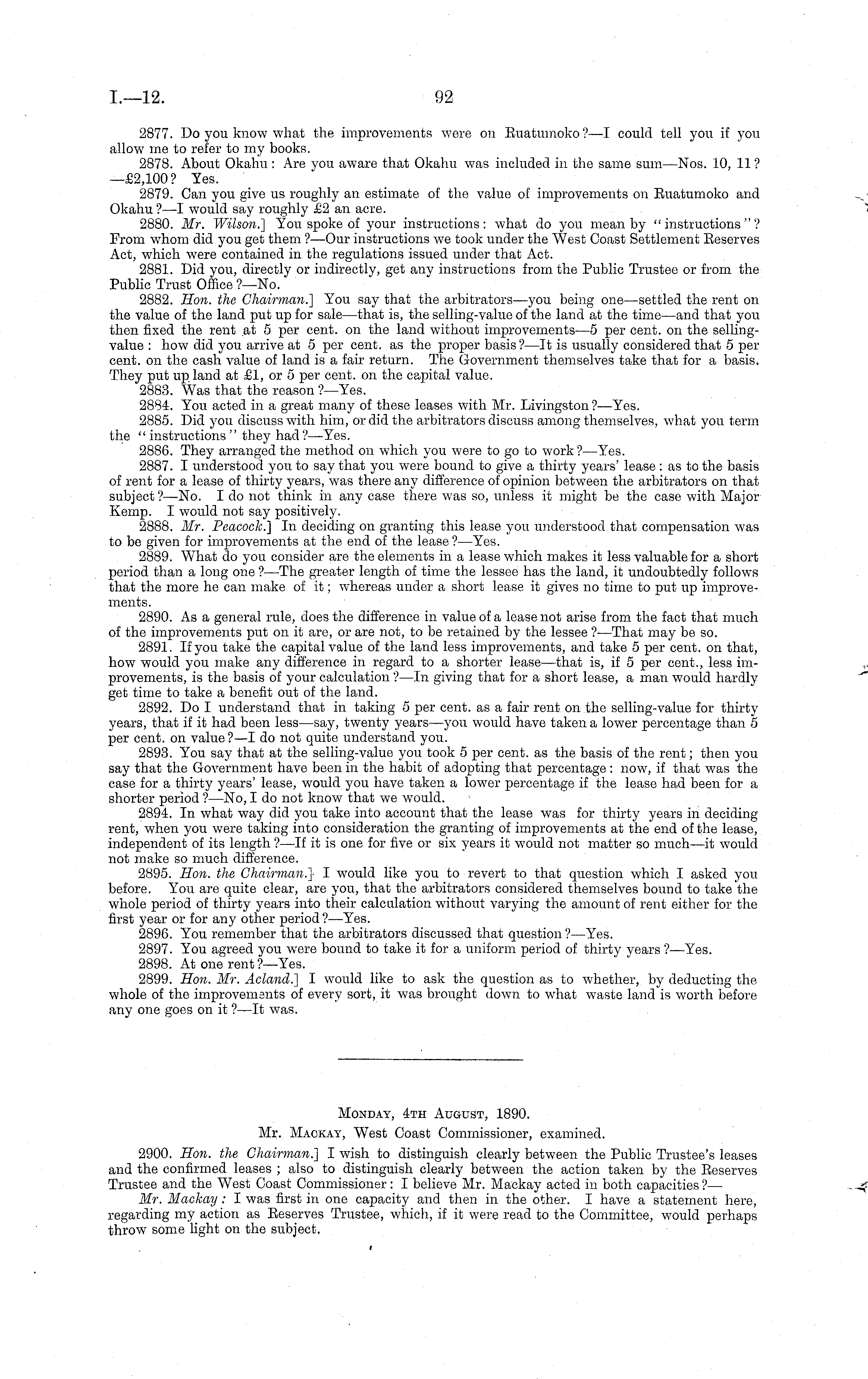 2877. Do you know what the improvements were on Ruatumoko? —I could tell you if you allow me to refer to my books. 2878. About Okahu : Are you aware that Okahu was included in the same sum —Nos. 10, 11? —£2,100? Yes. 2879. Can you give us roughly an estimate of the value of improvements on Ruatumoko and Okahu ? —I would say roughly £2 an acre. 2880. Mr. Wilson.] You spoke of your instructions: what do you mean by "instructions"? From yvhom did you get them ?—Our instructions we took under the West Coast Settlement Reserves Act, which were contained in the regulations issued under that Act. 2881. Did you, directly or indirectly, get any instructions from the Public Trustee or from the Public Trust Office ?—No. 2882. Hon. the Chairman.] You say that the arbitrators—you being one —settled the rent on the value of the land put up for sale —that is, the selling-value of the land at the time—and that you then fixed the rent at 5 per cent, on the land without improvements—s per cent, on the sellingvalue : how did you arrive at 5 per cent, as the proper basis? —It is usually considered that 5 per cent, on the cash value of land is a fair return. The Government themselves take that for a basis. They put up land at £1, or 5 per cent, on the capital value. 2883. Was that the reason ?—Yes. 2884. You acted in a great many of these leases with Mr. Livingston ? —Yes. 2885. Did you discuss with him, or did the arbitrators discuss among themselves, what you term the "instructions" they had?— Yes. 2886. They arranged the method on which you were to go to work ? —Yes. 2887. I understood you to say that you were bound to give a thirty years' lease : as to the basis of rent for a lease of thirty years, was there any difference of opinion between the arbitrators on that subject?— No. I do not think in any case there was so, unless it might be the case with Major Kemp. I would not say positively. 2888. Mr. Peacock.] In deciding on granting this lease you understood that compensation was to be given for improvements at the end of the lease ? —Yes. 2889. What do you consider are the elements in a lease which makes it less valuable for a short period than a long one ? —The greater length of time the lessee has the land, it undoubtedly follows that the more he can make of it; whereas under a short lease it gives no time to put up improvements. 2890. As a general rule, does the difference in value of a lease not arise from the fact that much of the improvements put on it are, or are not, to be retained by the lessee ? —That may be so. 2891. If you take the capital value of the land less improvements, and take 5 per cent, on that, how would you make any difference in regard to a shorter lease—that is, if 5 per cent., less improvements, is the basis of your calculation ? —ln giving that for a short lease, a man yvould hardly get time to take a benefit out of the land. 2892. Do I understand that in taking 5 per cent, as a fair rent on the selling-value for thirty years, that if it had been less —say, twenty years—you would have taken a lower percentage than 5 per cent, on value ?—I do not quite understand you. 2893. You say that at the selling-value you took 5 per cent, as the basis of the rent; then you say that the Government have been in the habit of adopting that percentage : now, if that was the case for a thirty years' lease, would you have taken a lower percentage if the lease had been for a shorter period ?—No, I do not know that we would. 2894. In what way did you take into account that the lease was for thirty years in deciding rent, when you were taking into consideration the granting of improvements at the end of the lease, independent of its length ?—lf it is one for five or six years it would not matter so much—it would not make so much difference. 2895. Hon. the Chairman.} I would like you to revert to that question which I asked you before. You are quite clear, are you, that the arbitrators considered themselves bound to take the whole period of thirty years into their calculation without varying the amount of rent either for the first year or for any other period ?—Yes. 2896. You remember that the arbitrators discussed that question?— Yes. 2897. You agreed you were bound to take it for a uniform period of thirty years ?—Yes. 2898. At one rent?— Yes. 2899. Hon. Mr. Acland.] I would like to ask the question as to whether, by deducting the whole of the improvements of every sort, it was brought down to what waste land is worth before any one goes on it ?—lt was.