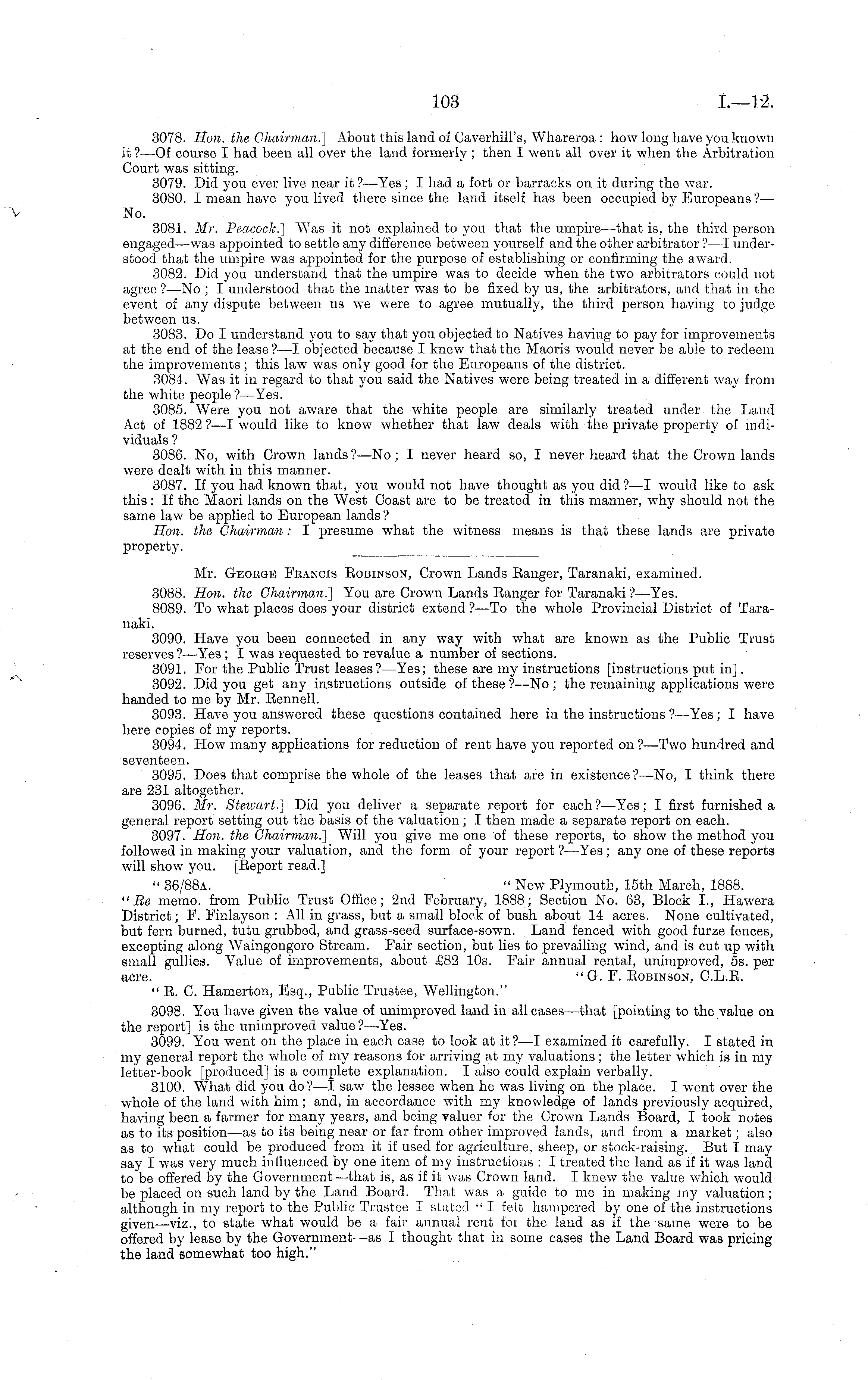 Mr. Geobge Feancis Robinson, Crown Lands Ranger, Taranaki, examined. 3088. Hon. the Chairman.] You are Crown Lands Ranger for Taranaki ?—Yes. 8089. To what places does your district extend ?—To the whole Provincial District of Taranaki. 3090. Have you been connected in any way with what are known as the Public Trust reserves ?—Yes ; I was requested to revalue a number of sections. 3091. For the Public Trust leases?— Yes; these are my instructions [instructions put in]. 3092. Did you get any instructions outside of these ?—No ; the remaining applications were handed to me by Mr. Rennell. 3093. Have you answered these questions contained here in the instructions ?—Yes; I have here copies of my reports. 3094. How many applications for reduction of rent have you reported on ?—-Two hundred and seventeen. 3095. Does that comprise the whole of the leases that are in existence?—No, I think there are 231 altogether. 3096. Mr. Stewart.] Did you deliver a separate report for each?— Yes; I first furnished a general report setting out the basis of the valuation; I then made a separate report on each. 3097. Hon. the Chairman.'] Will you give me one of these reports, to show the method you followed in making your valuation, and the form of your report? —Yes; any one of these reports will show you. [Report read.] " 36/88 A. " New Plymouth, 15th March, 1888. "Be memo, from Public Trust Office; 2nd February, 1888; Section No. 63, Block 1., Hawera District; F. Finlayson : All in grass, but a small block of bush about 14 acres. None cultivated, but fern burned, tutu grubbed, and grass-seed surface-sown. Land fenced yvith good furze fences, excepting along Waingongoro Stream. Fair section, but lies to prevailing wind, and is cut up with small gullies. Value of improvements, about £82 10s. Fair annual rental, unimproved, ss. per acre. " G. F. Robinson, C.L.R. " R. C. Hamerton, Esq., Public Trustee, Wellington." 3098. You have given the value of unimproved land in all cases—that [pointing to the value on the report] is the unimproved value ?—-Yes. 3099. You went on the place in each case to look at it?—l examined it carefully. I stated in my general report the whole of my reasons for arriving at my valuations; the letter which is in my letter-book [produced] is a complete explanation. I also could explain verbally. 3100. What did you do?—I saw the lessee when he was living on the place. I went over the whole of the land with him ; and, in accordance with my knowledge of lands previously acquired, having been a farmer for many years, and being valuer for the Crown Lands Board, I took notes as to its position —as to its being near or far from other improved lands, and from a market; also as to what could be produced from it if used for agriculture, sheep, or stock-raising. But I may say I yvas very much influenced by one item of my instructions : I treated the land as if it was land to be offered by the Government—that is, as if it was Crown land. I knew the value which would be placed on such land by the Land Board. That was a guide to me in making my valuation; although in my report to the Public Trustee I stated " I felt hampered by one of the instructions given—viz., to state what would be a fair annual rent foi the land as if the same were to be offered by lease by the Government- -as I thought that in some cases the Land Board was pricing the land somewhat too high."