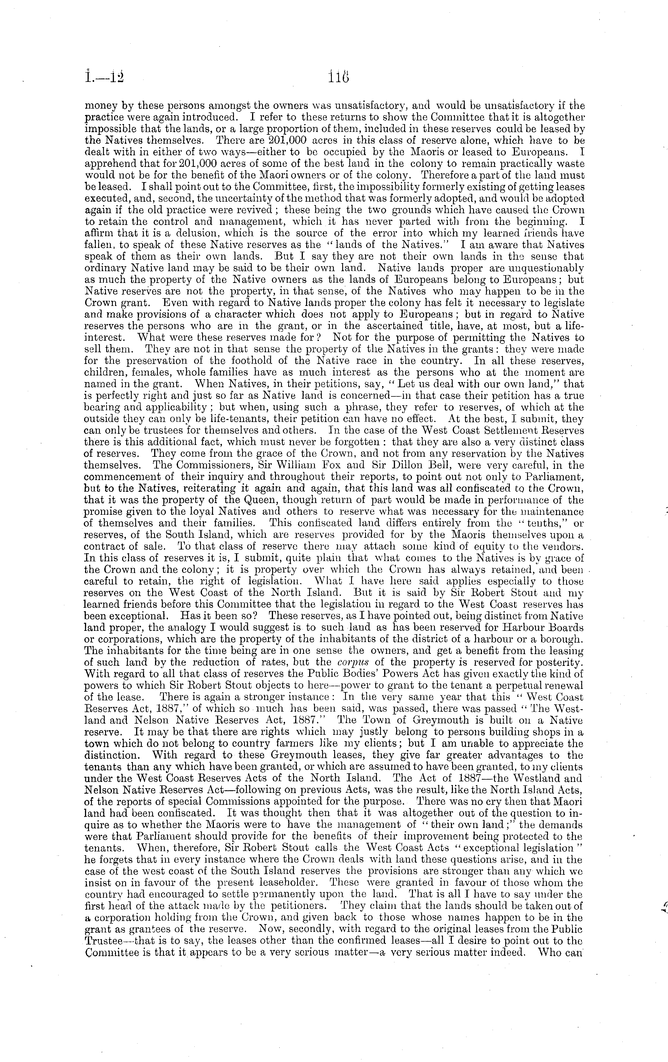 money by these persons amongst the owners was unsatisfactory, and would be unsatisfactory if the practice were again introduced. I refer to these returns to show the Committee that it is altogether impossible that the lands, or a large proportion of them, included in these reserves could be leased by the Natives themselves. There are 201,000 acres in this class of reserve alone, which have to be dealt with in either of two ways—either to be occupied by the Maoris or leased to Europeans. I apprehend that for 201,000 acres of some of the best land in the colony to remain practically waste would not be for the benefit of the Maori owners or of the colony. Therefore a part of the land must be leased. I shall point out to the Committee, first, the impossibility formerly existing of getting leases executed, and, second, the uncertainty of the method that was formerly adopted, and would be adopted again if the old practice were revived ; these being the two grounds which have caused the Crown to retain the control and management, which it has never parted with from the beginning. I affirm that it is a delusion, which is the source of the error into which my learned friends have fallen, to speak of these Native reserves as the " lauds of the Natives." lam aware that Natives speak of them as their own lands. But I say they are not their own lands in the sense that ordinary Native land may be said to be their own land. Native lands proper are unquestionably as much the property of the Native owners as the lands of Europeans belong to Europeans; but Native reserves are not the property, in that sense, of the Natives who may happen to be in the Crown grant. Even with regard to Native lands proper the colony has felt it necessary to legislate and make provisions of a character which does not apply to Europeans ; but in regard to Native reserves the persons who are in the grant, or in the ascertained title, have, at most, but a lifeinterest. What were these reserves made for ? Not for the purpose of permitting the Natives to sell them. They are not in that sense the property of the Natives in the grants : they wore made for the preservation of the foothold of the Native race in the country. In all these reserves, children, females, whole families have as much interest as the persons who at the moment are named in the grant. When Natives, in their petitions, say, " Let us deal with our own land," that is perfectly right and just so far as Native land is concerned—in that case their petition has a true bearing and applicability ; but when, using such a phrase, they refer to reserves, of which at the outside they can only be life-tenants, their petition can have no effect. At the best, I submit, they can only be trustees for themselves and others. In the case of the West Coast Settlement Beserves there is this additional fact, which must never be forgotten : that they are also a very distinct class of reserves. They come from the grace of the Crown, and not from any reservation by the Natives themselves. The Commissioners, Sir William Fox and Sir Dillon Bell, were very careful, in the commencement of their inquiry and throughout their reports, to point out not only to Parliament, but to the Natives, reiterating it again and again, that this land was all confiscated to the Crown, that it was the property of the Queen, though return of part would be made in performance of the promise given to the loyal Natives and others to reserve what was necessary for the maintenance of themselves and their families. This confiscated land differs entirely from the " tenths," or reserves, of the South Island, which are reserves provided for by the Maoris themselves upon a contract of sale. To that class of reserve there may attach some kind of equity to the vendors. In this class of reserves it is, I submit, quite plain that what comes to the Natives is by grace of the Crown and the colony ; it is property over which the Crown has always retained, and been careful to retain, the right of legislation. What I have here said applies especially to those reserves on the West Coast of the North Island. But it is said by Sir Bobert Stout and my learned friends before this Committee that the legislation in regard to the West Coast reserves has been exceptional. Has it been so? These reserves, as I have pointed out, being distinct from Native land proper, the analogy I would suggest is to such land as has been reserved for Harbour Boards or corporations, which are the property of the inhabitants of the district of a harbour or a borough. The inhabitants for the time being are in one sense the owners, and get a benefit from the leasing of such land by the reduction of rates, but the corpus of the property is reserved for posterity. With regard to all that class of reserves the Public Bodies' Powers Act has given exactly the kind of powers to which Sir Bobert Stout objects to hero —power to grant to the tenant a perpetual renew"al of the lease. There is again a stronger instance :In the very same year that this " West Coast Beserves Act, 1887," of which so much has been said, was passed, there was passed " The Westland and Nelson Native Beserves Act, 1887." The Town of Greymouth is built on a Native reserve. It may be that there are rights which may justly belong to persons building shops in a town which do not belong to country farmers like my clients; but I am unable to appreciate the distinction. With regard to these Greymouth leases, they give far greater advantages to the tenants than any which have been granted, or which are assumed to have been granted, to my clients under the West Coast Beserves Acts of the North Island. The Act of 1887—the Westland and Nelson Native Beserves Act—following on previous Acts, was the result, like the North Island Acts, of the reports of special Commissions appointed for the purpose. There was no cry then that Maori land had been confiscated. It was thought then that it was altogethe