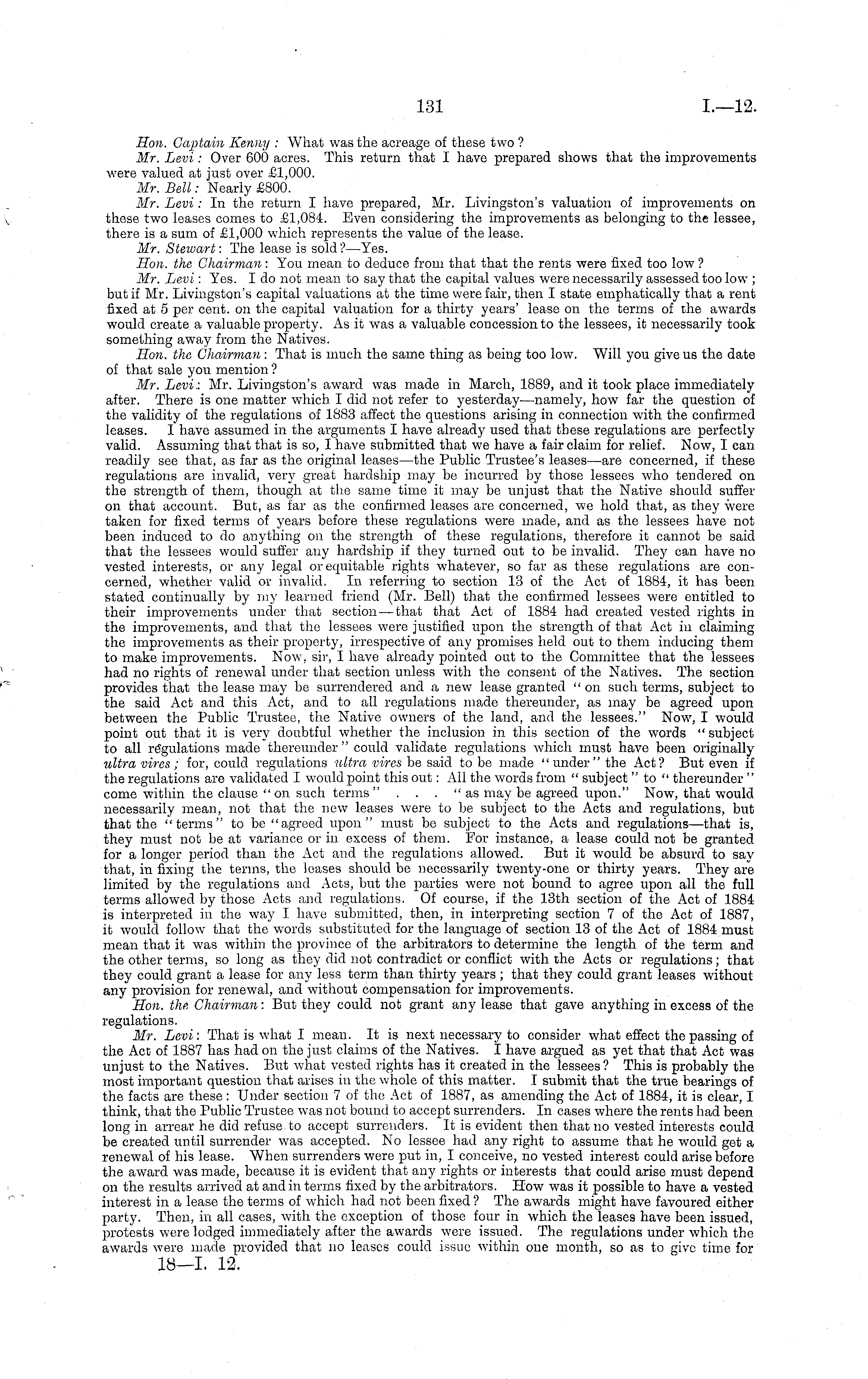 Hon. Captain Kenny : What was the acreage of these two ? Mr. Levi: Over 600 acres. This return that I have prepared shows that the improvements were valued at just over £1,000. Mr. Bell: Nearly £800. Mr. Levi: In the return I have prepared, Mr. Livingston's valuation of improvements on these two leases comes to £1,084. Even considering the improvements as belonging to the lessee, there is a sum of £1,000 which represents the value of the lease. Mr. Stewart : The lease is sold ?—Yes. Hon. the Chairman: You mean to deduce from that that the rents were fixed too low ? Mr. Levi: Yes. Ido not mean to say that the capital values were necessarily assessed too low ; but if Mr. Livingston's capital valuations at the time were fair, then I state emphatically that a rent fixed at 5 per cent, on the capital valuation for a thirty years' lease on the terms of the awards would create a valuable property. As it yvas a valuable concession to the lessees, it necessarily took something away from the Natives. Hem. the Chairman : That is much the same thing as being too low. Will you give us the date of that sale you mention ? Mr. Levi:. Mr. Livingston's award was made in March, 1889, and it took place immediately after. There is one matter which I did not refer to yesterday—namely, how far the question of the validity of the regulations of 1883 affect the questions arising in connection with the confirmed leases. I have assumed in the arguments I have already used that these regulations are perfectly valid. Assuming that that is so, I have submitted that w 7 e have a fair claim for relief. Now, I can readily see that, as far as the original leases—the Public Trustee's leases—are concerned, if these regulations are invalid, very great hardship may be incurred by those lessees who tendered on the strength of them, though at the same time it may be unjust that the Native should suffer on that account. But, as far as the confirmed leases are concerned, we hold that, as they were taken for fixed terms of years before these regulations were made, and as the lessees have not been induced to do anything on the strength of these regulations, therefore it cannot be said that the lessees would suffer any hardship if they turned out to be invalid. They can have no vested interests, or any legal or equitable rights whatever, so far as these regulations are concerned, whether valid or invalid. In referring to section 13 of the Act of 1884, it has been stated continually by my learned friend (Mr. Bell) that the confirmed lessees were entitled to their improvements under that section —that that Act of 1884 had created vested rights in the improvements, and that the lessees were justified upon the strength of that Act in claiming the improvements as their property, irrespective of any promises held out to them inducing them to make improvements. Now, sir, I have already pointed out to the Committee that the lessees had no rights of renewal under that section unless with the consent of the Natives. The section provides that the lease may be surrendered and a new lease granted " on such terms, subject to the said Act and this Act, and to all regulations made thereunder, as may be agreed upon between the Public Trustee, the Native owners of the land, and the lessees." Now, I would point out that it is very doubtful whether the inclusion in this section of the words " subject to all regulations made thereunder " could validate regulations which must have been originally ultra vires; for, could regulations ultra vires be said to be made "under" the Act? But even if the regulations are validated I would point this out: All the yvords from " subject "to " thereunder " come within the clause "on such terms " . . . "as may be agreed upon." Now, that would necessarily mean, not that the new leases were to be subject to the Acts and regulations, but that the "terms" to be "agreed upon" must be subject to the Acts and regulations—that is, they must not be at variance or in excess of them. For instance, a lease could not be granted for a longer period than the Act and the regulations allowed. But it would be absurd to say that, in fixing the terms, the leases should be necessarily twenty-one or thirty years. They are limited by the regulations and Acts, but the parties were not bound to agree upon all the full terms allowed by those Acts and regulations. Of course, if the 13th section of the Act of 1884 is interpreted in the way I have submitted, then, in interpreting section 7 of the Act of 1887, it would follow that the words substituted for the language of section 13 of the Act of 1884 must mean that it was within the province of the arbitrators to determine the length of the term and the other terms, so long as they did not contradict or conflict with the Acts or regulations; that they could grant a lease for any less term than thirty years ; that they could grant leases without any provision for renewal, and without compensation for improvements. Hon. the Chairman : But they could not grant any lease that gave anything in excess of the regulations. Mr. Levi: That is what I mean. It is next necessary to consider what effect the passing of the Act of 1887 has had on the just claims of the Natives. I have argued as yet that that Act was unjust to the Natives. But what vested rights has it created in the lessees? This is probably the most important question that arises in the whole of this matter. I submit that the true bearings of the facts are these : Under section 7 of the Act of 1887, as amending the Act of 1884, it is clear, I think, that tho Public Trustee was not bound to accept surrenders. In cases where the rents had been long in arrear he did refuse to accept surrenders. It is evident then that no vested interests could be created until surrender was accepted. No lessee had any right to assume that he would get a renewal of his lease. When surrenders were put in, I conceive, no vested interest could arise bef