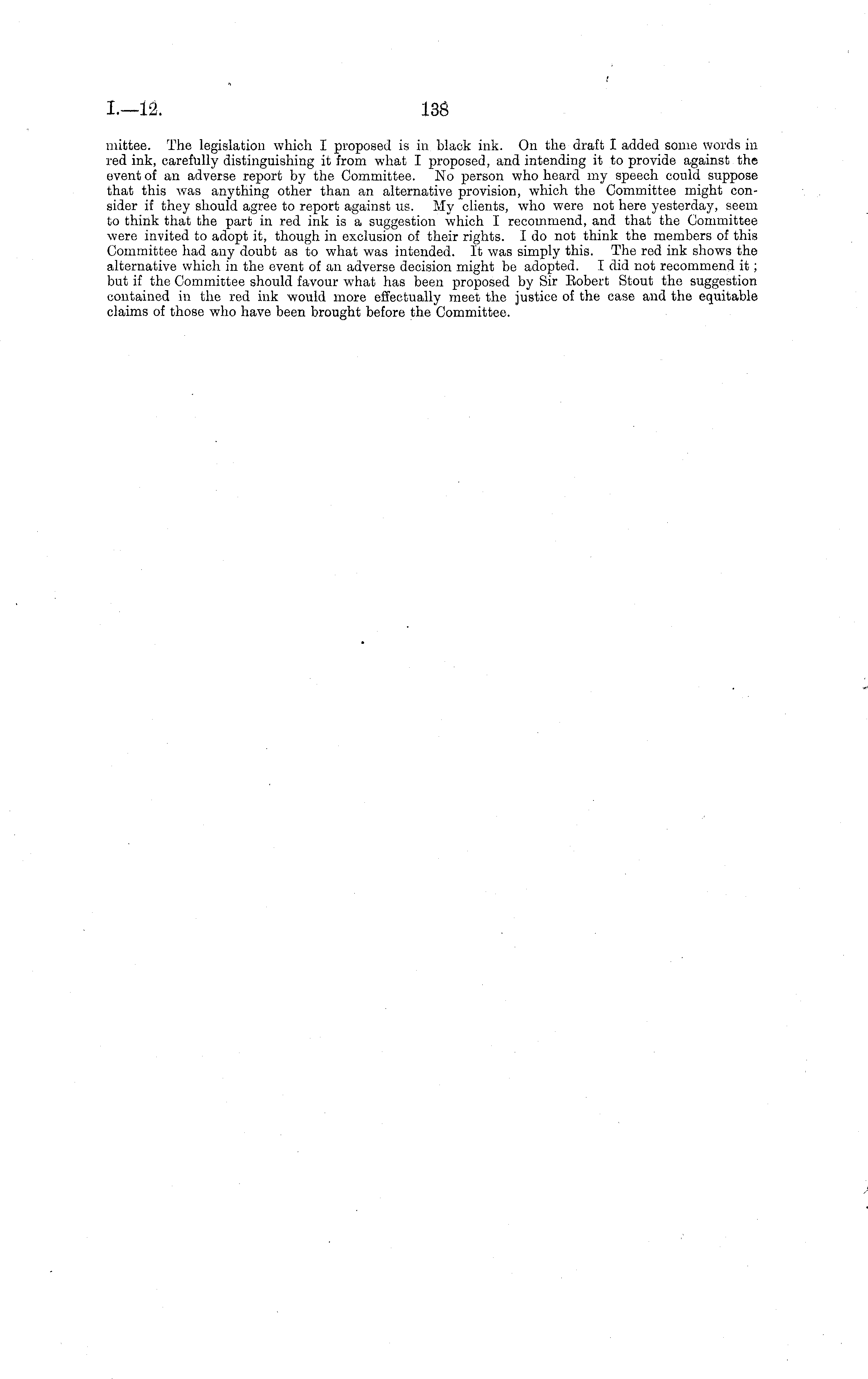 niittee. The legislation which I proposed is in black ink. On the draft I added some words in red ink, carefully distinguishing it from what I proposed, and intending it to provide against the event of an adverse report by the Committee. No person who heard my speech could suppose that this was anything other than an alternative provision, which the Committee might consider if they should agree to report against us. My clients, who were not here yesterday, seem to think that the part in red ink is a suggestion which I recommend, and that the Committee were invited to adopt it, though in exclusion of their rights. Ido not think the members of this Committee had any doubt as to what was intended. It was simply this. The red ink shows the alternative which in the event of an adverse decision might be adopted. I did not recommend it; but if the Committee should favour what has been proposed by Sir Bobert Stout the suggestion contained in the red ink would more effectually meet the justice of the case and the equitable claims of those who have been brought before the Committee.