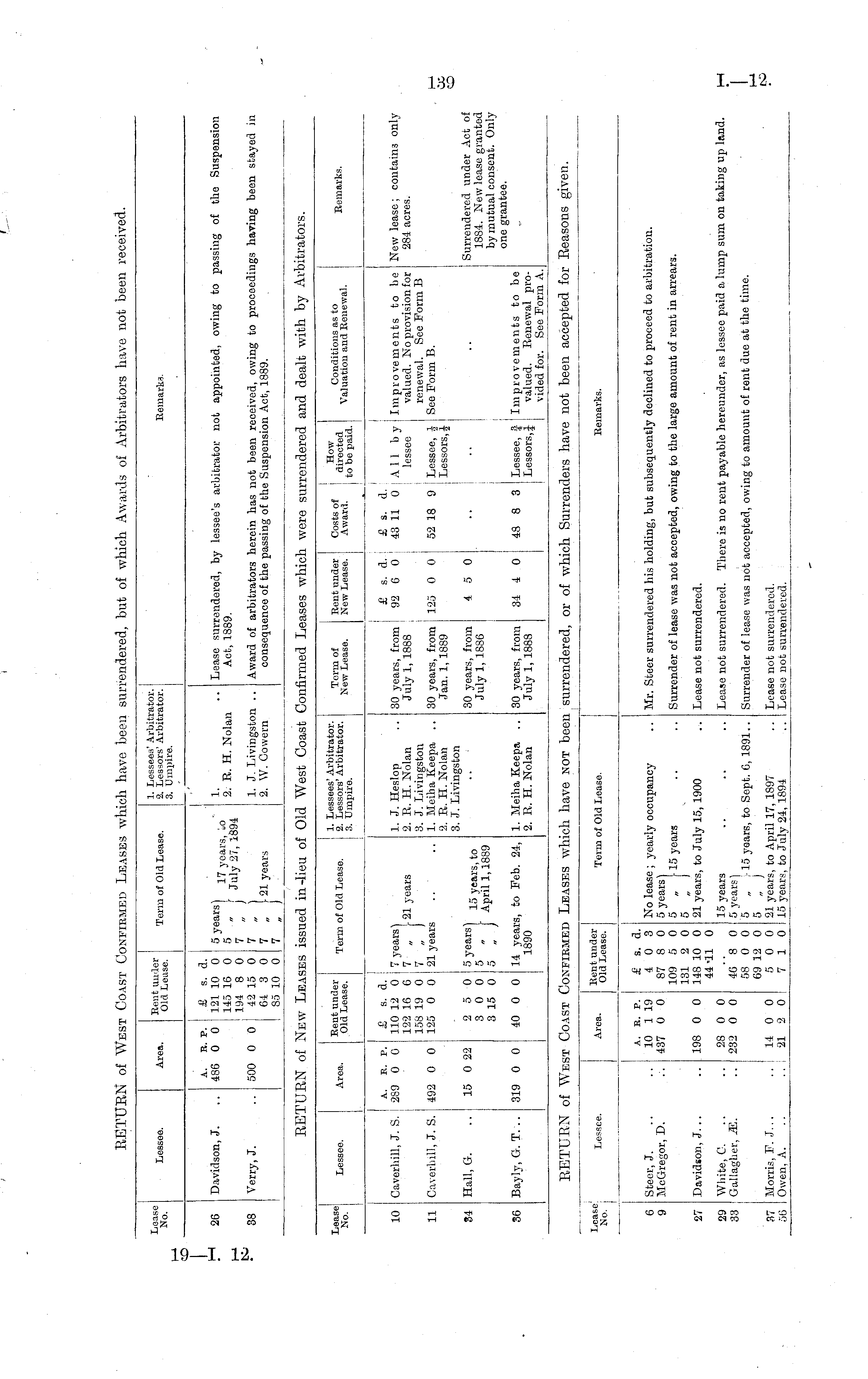 Lease No. Lessee. Area. Bent under Old Lease. Term of Old Lease. 1. Lessees' Arbitrator. 2. Lessors' Arbitrator. I 3. Umpire. Term of New Lease. Bent under New Lease. Costs of Award. How directed to be x>aid. j Conditions as to Valuation and Benewal. Bemarks. 10 Caverhill, J. S. A. E. P. 289 0 0 £ b. a. 110 12 0 7 years') 122 16 6 7 „ 121 years 158 19 0 7 „ ) 125 0 0 21 years 1. J. Heslop 2. R. H. Nolan 3. J. Livingston 1. Meiha Keepa .. 2. R. H. Nolan 3. J. Livingston 30 years, from July 1, 1888 £ a. a. 92 6 0 £ s. d. 43 11 0 All by Improvements to be lessee valued. No provision for renewal. See Form B 52 18 9 Lessee, J See Form B. Lessors, J New lease; contains only 284 acres. 11 Caverhill, J. S. 492 0 0 30 years, from Jan. 1, 1889 125 0 0 | 84 Hall, G. 15 0 22 2 5 0 5 years) ,~ 3 15 0 5 I j April 1,1889 30 years, from July 1, 1886 4 5 0 Surrendered under Act oi 1884. New lease granted by mutual consent. Onl) one grantee. Bayly, G. T. .. 319 0 0 40 0 0 14 years, to Feb. 24, 1890 1. Meiha Keepa .. 2. R. H. Nolan 30 years, from July 1, 1888 34 4 0 48 8 3 Lessee, f Improvements to be Lessors, J valued. Renewal provided for. See Form A. 36