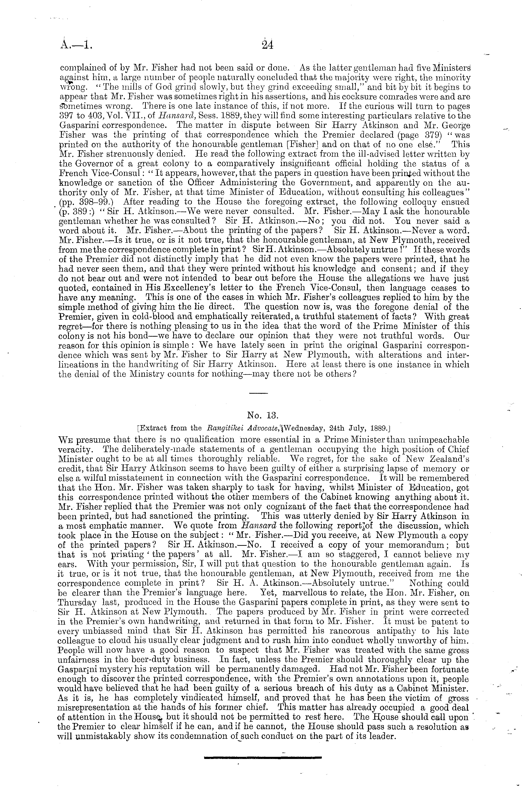 No. 13. [Extract from the Bangitikei Advocate^\WeAnesda.j, 24th July, 1889.J We presume that there is no qualification more essential in a Prime Minister than unimpeachable veracity. The deliberately-made statements of a gentleman occupying the high position of Chief Minister ought to be at all times thoroughly reliable. We regret, for the sake of New Zealand's credit, that Sir Harry Atkinson seems to have been guilty of either a surprising lapse of memory or else a wilful misstatement in connection with the Gasparini correspondence. It will be remembered that the Hon. Mr. Fisher was taken sharply to task for having, whilst Minister of Education, got this correspondence printed without the other members of the Cabinet knowing anything about it. Mr. Fisher replied that the Premier was not only cognizant of the fact that the correspondence had been printed, but had sanctioned the printing. This was utterly denied by Sir Harry Atkinson in a most emphatic manner. We quote from Hansard the following report^of the discussion, which took place in the House on the subject: " Mr. Fisher. —Did you receive, at New Plymouth a copy of the printed papers? Sir H. Atkinson.—No. I received a copy of your memorandum; but that is not printing ' the papers' at all. Mr. Fisher.—l am so staggered, I cannot believe my ears. With your permission, Sir, I will put that question to the honourable gentleman again. Is it true, or is it not true, that the honourable gentleman, at New Plymouth, received from me the correspondence complete in print? Sir H. A. Atkinson.—Absolutely untrue." Nothing could be clearer than the Premier's language here. Yet, marvellous to relate, the Hon. Mr. Fisher, on Thursday last, produced in the House the Gasparini papers complete in print, as they were sent to Sir H. Atkinson at New Plymouth. . The papers produced by Mr. Fisher in print were corrected in the Premier's own handwriting, and returned in that form to Mr. Fisher. It must be patent to every unbiassed mind that Sir H. Atkinson has permitted his rancorous antipathy to his late colleague to cloud his usually clear judgment and to rush him into conduct wholly unworthy of him. People will now have a good reason to suspect that Mr. Fisher was treated with the same gross unfairness in the beer-duty business. In fact, unless the Premier should thoroughly clear up the Gasparini mystery his reputation will be permanently damaged. Had not Mr. Fisher been fortunate enough to discover the printed correspondence, with the Premier's own annotations upon it, people would have believed that he had been guilty of a serious breach of his duty as a Cabinet Minister. As it is, he has completely vindicated himself, and proved that he has been the victim of gross misrepresentation at the hands of his former chief. This matter has already occupied a good deal of attention in the House^ but it should not be permitted to rest here. The House should call upon the Premier to clear himself if he can, and if he cannot, the House should pass such a resolution as will unmistakably show its condemnation of such conduct on the part of its leader.