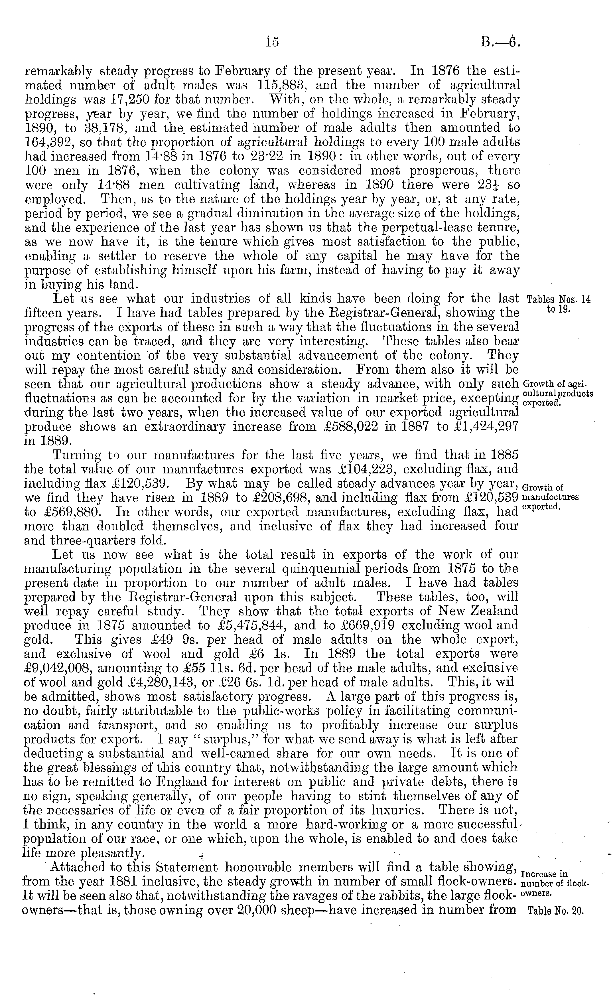 remarkably steady progress to February of the present year. In 1876 the estimated number of adult males was 115,883, and the number of agricultural holdings was 17,250 for that number. With, on the whole, a remarkably steady progress, year by year, we find the number of holdings increased in February, 1890, to 38,178, and the estimated number of male adults then amounted to 164,392, so that the proportion of agricultural holdings to every 100 male adults had increased from 14-88 in 1876 to 23-22 in 1890 : in other words, out of every 100 men in 1876, w Then the colony was considered most prosperous, there were only 14-88 men cultivating land, whereas in 1890 there were 23£ so employed. Then, as to the nature of the holdings year by year, or, at any rate, period by period, we see a gradual diminution in the average size of the holdings, and the experience of the last year has shown us that the perpetual-lease tenure, as we now have it, is the tenure which gives most satisfaction to the public, enabling a settler to reserve the whole of any capital he may have for the purpose of establishing himself upon his farm, instead of having to pay it away in buying his land. Let us see what our industries of all kinds have been doing for the last fifteen years. I have had tables prepared by the Kegistrar-Greneral, showing the progress of the exports of these in such a way that the fluctuations in the several industries can be traced, and they are very interesting. These tables also bear out my contention of the very substantial advancement of the colony. They will repay the most careful study and consideration. From them also it will be seen that our agricultural productions show a steady advance, with only such fluctuations as can be accounted for by the variation in market price, excepting •during the last two years, when the increased value of our exported agricultural produce shows an extraordinary increase from £588,022 in 1887 to £1,424,297 in 1889. Turning to our manufactures for the last five years, we find that in 1885 the total value of our manufactures exported was £104,223, excluding flax, and including flax £120,539. By what may be called steady advances year by year, we find they have risen in 1889 to £208,698, and including flax from £120,539 to £569,880. In other words, our exported manufactures, excluding flax, had more than doubled themselves, and inclusive of flax they had increased four and three-quarters fold. Let us now see what is the total result in exports of the work of our manufacturing population in the several quinquennial periods from 1875 to the present date in proportion to our number of adult males. I have had tables prepared by the Registrar-General upon this subject. These tables, too, will well repay careful study. They show that the total exports of New Zealand produce in 1875 amounted to £5,475,844, and to £669,919 excluding wool and gold. This gives £49 9s. per head of male adults on the whole export, and exclusive of wool and gold £6 Is. In 1889 the total exports were £9,042,008, amounting to £55 11s. 6d. per head of the male adults, and exclusive of wool and gold £4,280,143, or £26 6s. Id. per head of male adults. This, it wil be admitted, shows most satisfactory progress. A large part of this progress is, no doubt, fairly attributable to the public-works policy in facilitating communication and transport, and so enabling us to profitably increase our surplus products for export. I say " surplus," for what we send away is what is left after deducting a substantial and well-earned share for our own needs. It is one of the great blessings of this country that, notwithstanding the large amount which has to be remitted to England for interest on public and private debts, there is no sign, speaking generally, of our people having to stint themselves of any of the necessaries of life or even of a fair proportion of its luxuries. There is not, I think, in any country in the world a more hard-working or a more successful population of our race, or one which, upon the whole, is enabled to and does take life more pleasantly. Attached to this Statement honourable members will find a table showing, from the year 1881 inclusive, the steady growth in number of small flock-owners. It will be seen also that, notwithstanding the ravages of the rabbits, the large flockowners—that is, those owning over 20,000 sheep—have increased in number from