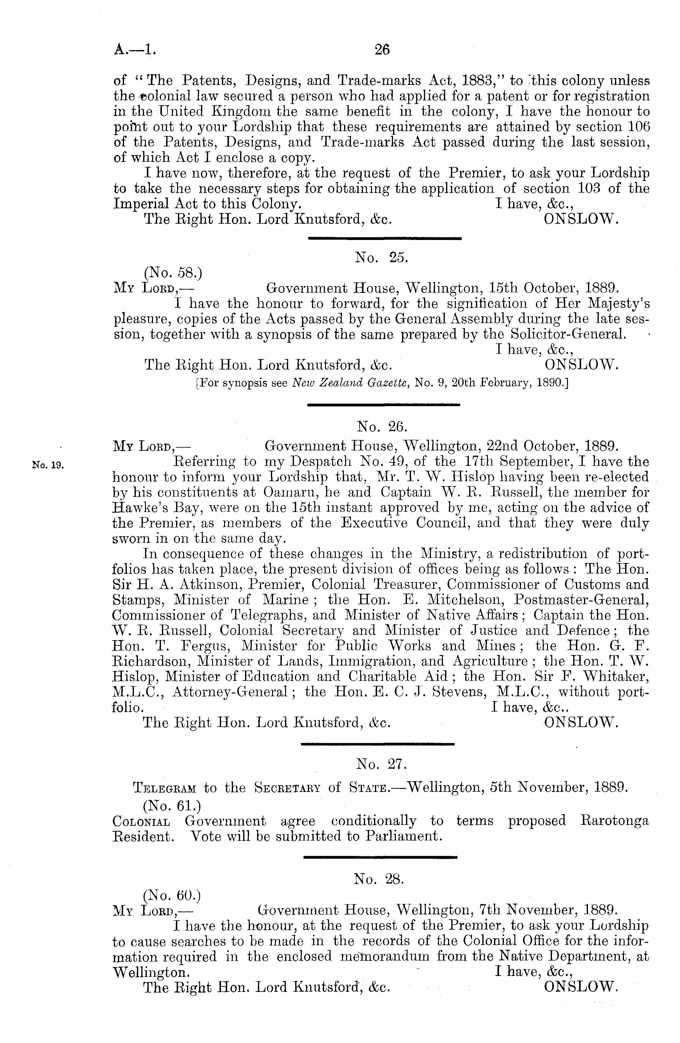 No. 26. My Loed, — Government House, Wellington, 22nd October, 1889. Eeferring to my Despatch No. 49, of the 17th September, I have the honour to inform your Lordship that, Mr. T. W. Hislop having been re-elected by his constituents at Oamaru, he and Captain W. E. Eussell, the member for Hawke's Bay, were on the 15th instant approved by me, acting on the advice of the Premier, as members of the Executive Council, and that they were duly sworn in on the same day. In consequence of these changes in the Ministry, a redistribution of portfolios has taken place, the present division of offices being as follows : The Hon. Sir H. A. Atkinson, Premier, Colonial Treasurer, Commissioner of Customs and Stamps, Minister of Marine ; the Hon. E. Mitchelson, Postmaster-General, Commissioner of Telegraphs, and Minister of Native Affairs ; Captain the Hon. W. E. Eussell, Colonial Secretary and Minister of Justice and Defence; the Hon. T. Fergus, Minister for Public Works and Mines; the Hon. G. F. Eichardson, Minister of Lands, Immigration, and Agriculture ; the Hon. T. W. Hislop, Minister of Education and Charitable x\id ; the Hon. Sir F. Whitaker, M.L.C., Attorney-General; the Hon. E. C. J. Stevens, M.L.C., without portfolio. I have, &c. The Eight Hon. Lord Knutsford, &c. ONSLOW T.