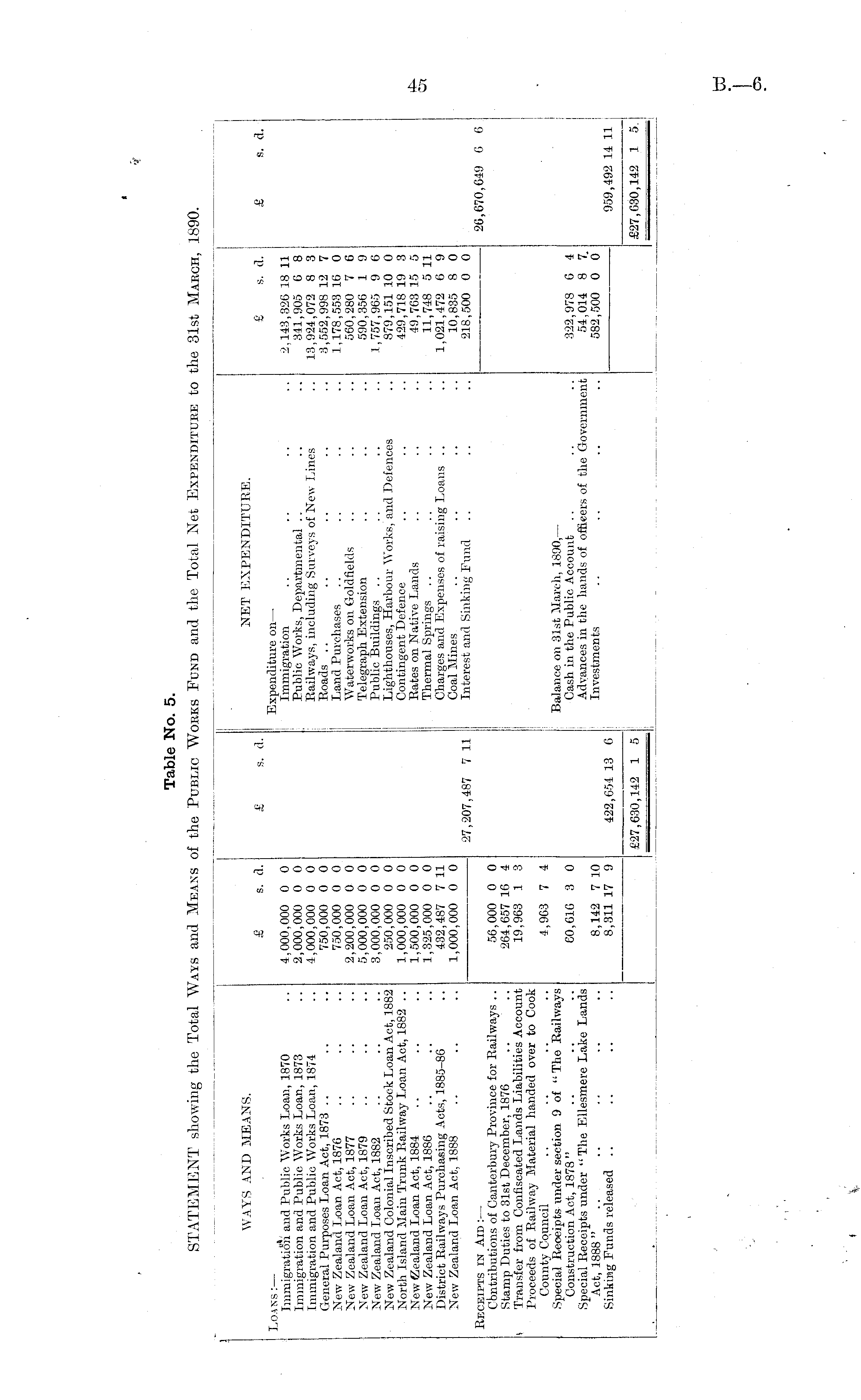 Table No. 5. STATEMENT showing the Total Ways and Means of the Public Works Fund and the Total Net Expenditure to the 31st March, 1890.