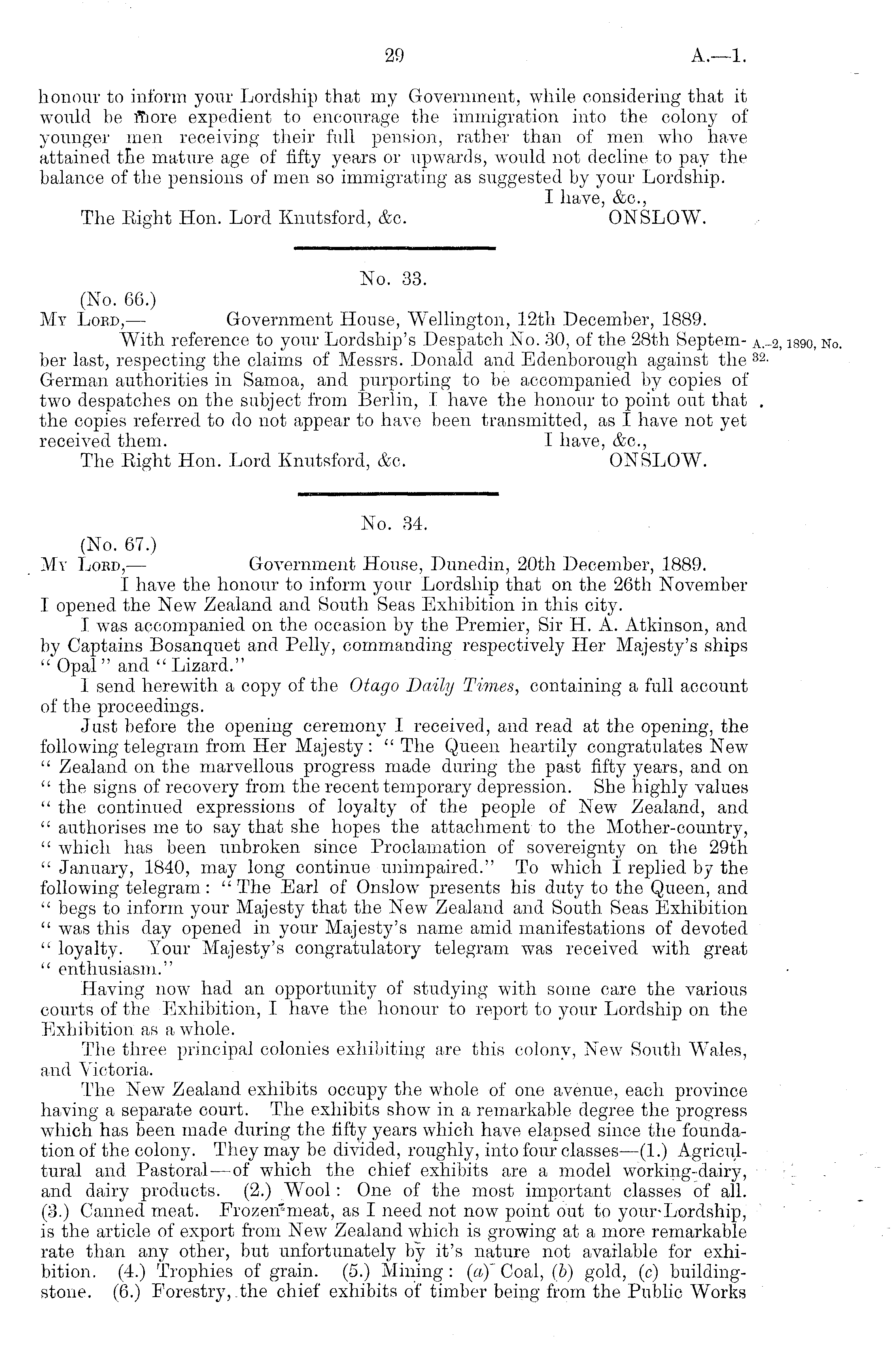 No. 34. (No. 67.) My Loed, — Government House, Dunedin, 20th December, 1889. I have the honour to inform your Lordship that on the 26th November I opened the New Zealand and South Seas Exhibition in this city. I was accompanied on the occasion by the Premier, Sir H. A. Atkinson, and by Captains Bosanquet and Pelly, commanding" respectively Her Majesty's ships " Opal" and "Lizard." 1 send herewith a copy of the Otago Daily Times, containing a full account of the proceedings. Just before the opening ceremony I received, and read at the opening, the following telegram from Her Majesty: "The Queen heartily congratulates New " Zealand on the marvellous progress made during the past fifty years, and on " the signs of recovery from the recent temporary depression. She highly values " the continued expressions of loyalty of the people of New Zealand, and " authorises me to say that she hopes the attachment to the Mother-country, " which has been unbroken since Proclamation of sovereignty on the 29th " January, 1840, may long continue unimpaired." To which I replied by the following telegram: " The Earl of Onslow presents his duty to the Queen, and " begs to inform your Majesty that the New Zealand and South Seas Exhibition " was this day opened in your Majesty's name amid manifestations of devoted " loyalty. Your Majesty's congratulatory telegram was received with great " enthusiasm." Having now had an opportunity of studying with some care the various courts of the Exhibition, I have the honour to report to your Lordship on the Exhibition as a whole. The three principal colonies exhibiting are this colony, New South Wales, and Victoria. The New Zealand exhibits occupy the whole of one avenue, each province having a separate court. The exhibits show in a remarkable degree the progress which has been made during the fifty years which have elapsed since the foundation of the colony. They may be divided, roughly, into four classes—(l.) Agricultural and Pastoral —of which the chief exhibits are a model working-dairy, and dairy products. (2.) Wool : One of the most important classes of all. (3.) Canned meat. Frozeirmeat, as I need not now point out to your-Lordship, is the article of export from New Zealand which is growing at a more remarkable rate than any other, but unfortunately by it's nature not available for exhibition. (4.) Trophies of grain. (5.) Mining : (a)' Coal, (b) gold, (c) buildingstone. (6.) Forestry, the chief exhibits of timber being from the Public Works