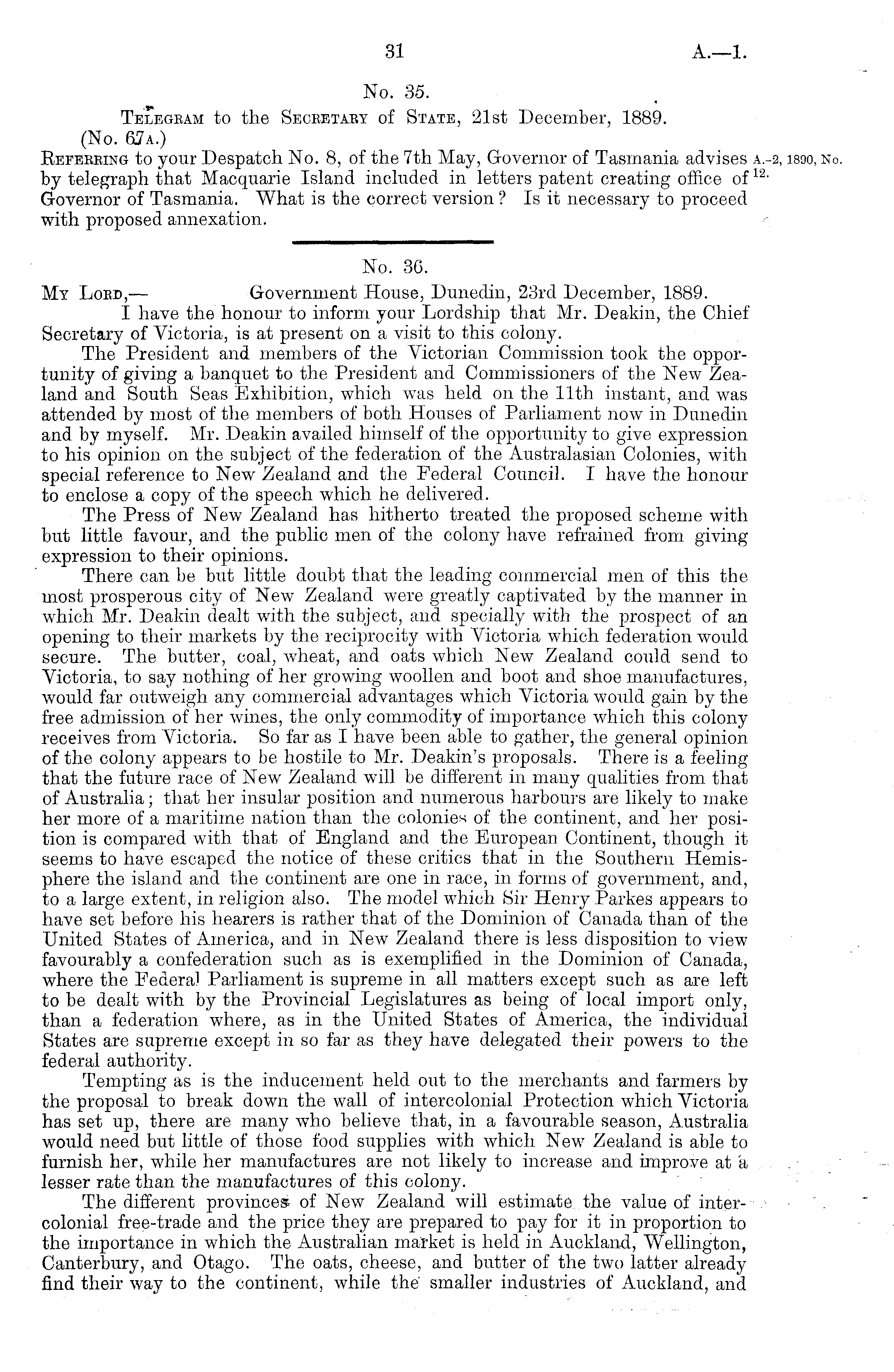 No. 35. Telegbam to the Secretary of State, 21st December, 1889. (No. 67a.) Referring to your Despatch No. 8, of the 7th May, Governor of Tasmania advises by telegraph that Macquarie Island included in letters patent creating office of Governor of Tasmania. What is the correct version ? Is it necessary to proceed with proposed annexation.