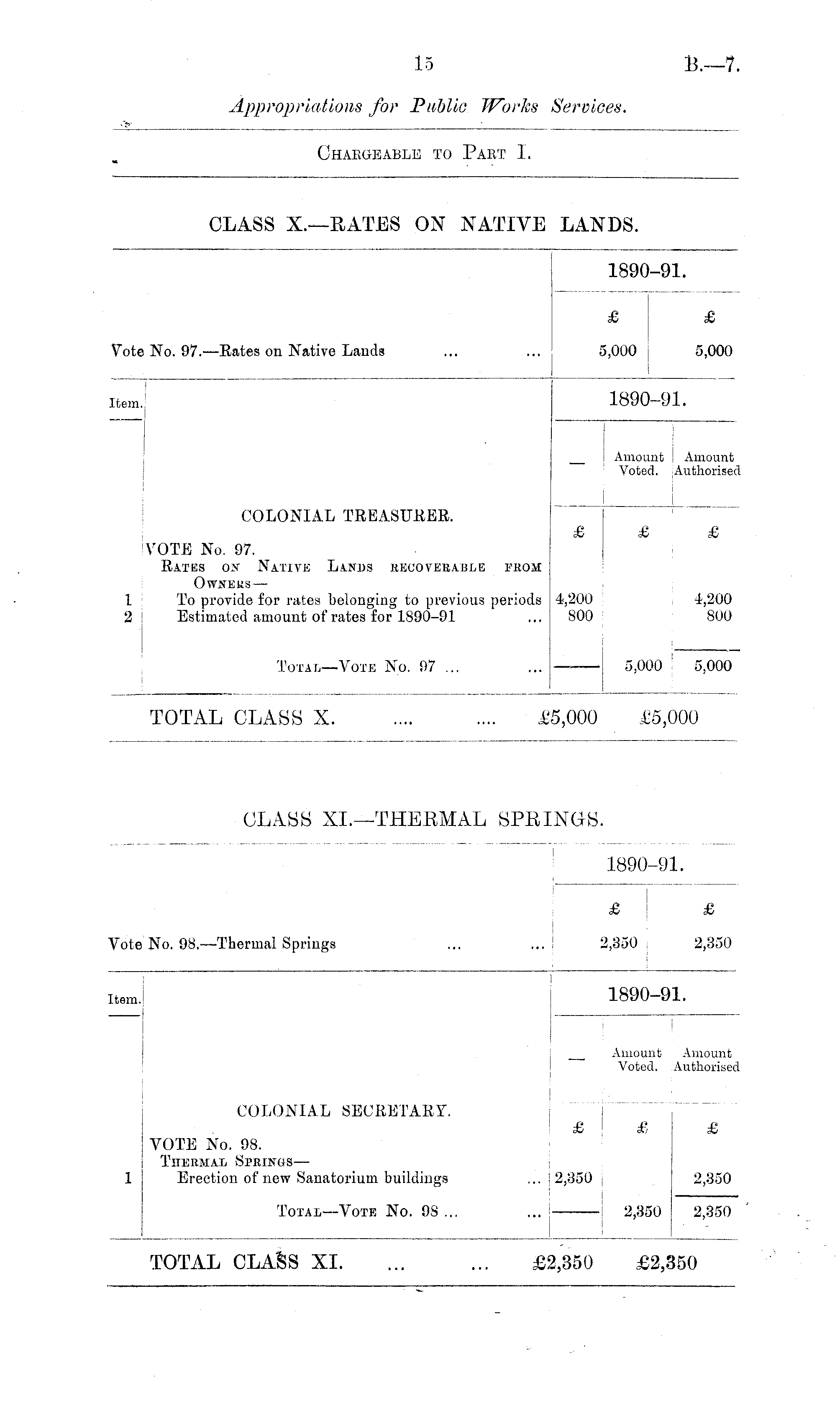 1890-91. £ £ Vote No. 97. —Rates on Native Lands 5,000 5,000 l .. 1890-91. Item. Amount ! Amount Voted. Authorise* j - COLONIAL TREASURER. I 1 _> 3J VOTE No. 97. Rates on Native Lands recoverable from Owneus — 1 To provide for rates belonging to previous periods 2 Estimated amount of rates for 1890-91 . 4,200 4,200 800 800 Total—Vote No. 97 ... — 5,000 ! 5,000 TOTAL CLASS X .... i '5,000 £5,000