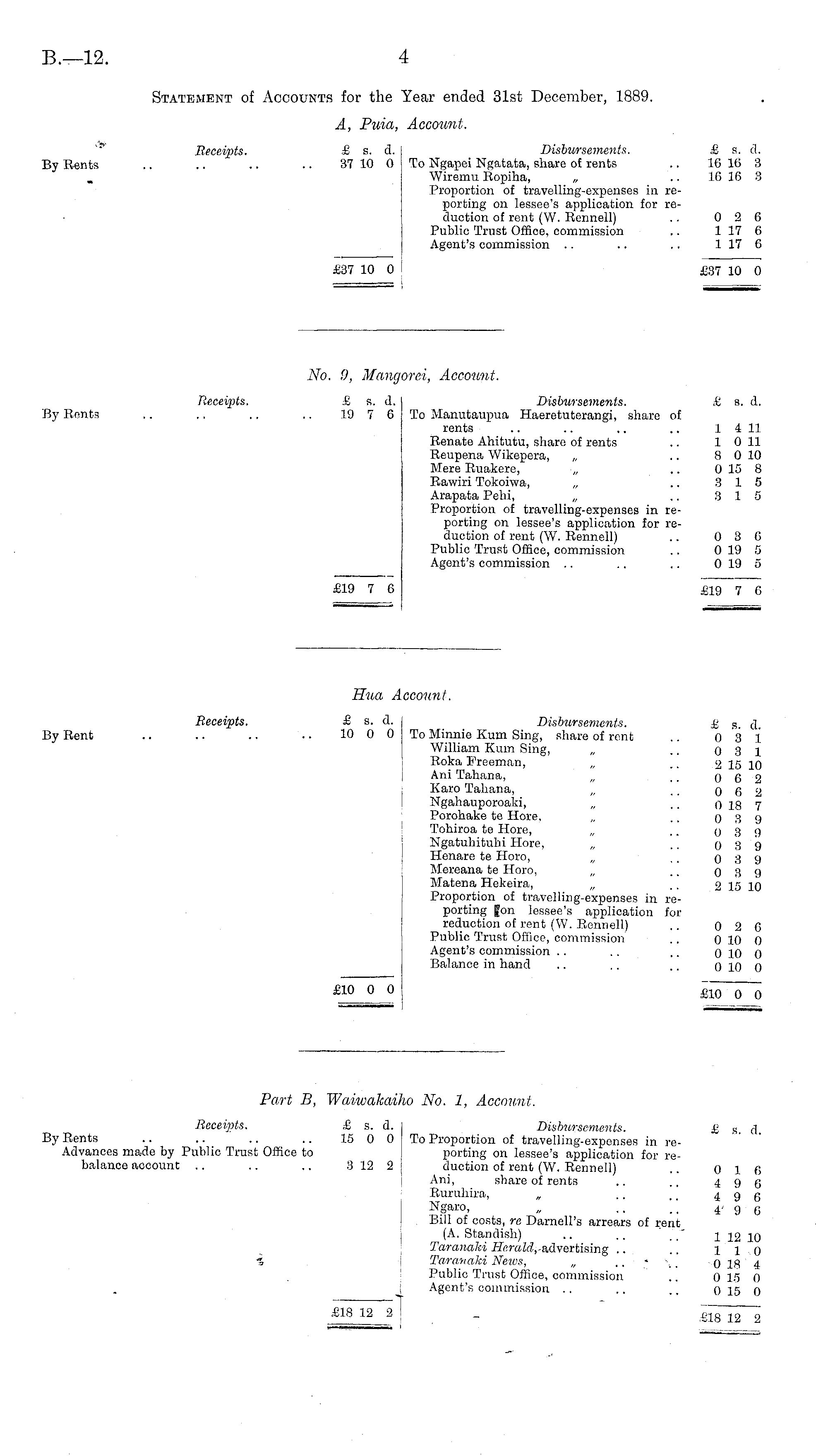 Statement of Accounts for the Year ended 31st December, 1889. A, Puia, Account. Receipts. £ s. d. j Disbursements. & s. d. By Rents .. .. .. 37 10 0I To Ngapei Ngatata, share of rents .. 16 16 3 Wiremu Ropiha, „ .. 16 16 3 Proportion of travelling-expenses in reporting on lessee's application for reduction of rent (W. Rennell) .. 0 2 6 Public Trust Office, commission .. 1 17 6 I Agent's commission .. .. .. 1 17 6 £37 10 0 £37 10 0
