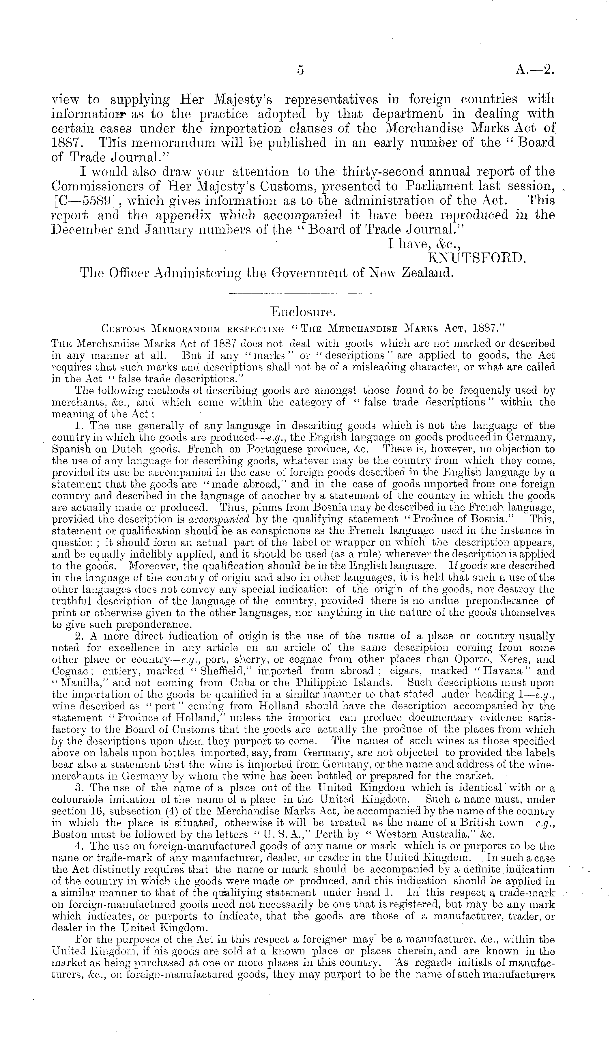 view to supplying Her Majesty's representatives in foreign countries with information- as to the practice adopted by that department in dealing with certain cases under the importation clauses of the Merchandise Marks Act of 1887. This memorandum will be published in an early number of the " Board of Trade Journal." I would also draw your attention to the thirty-second annual report of the Commissioners of Her Majesty's Customs, presented to Parliament last session, [C—ssß9], which gives information as to the administration of the Act. This report and the appendix which accompanied it have been reproduced in the December and January numbers of the " Board of Trade Journal." I have, &c, KNUTSFOEI). The Officer Administering the Government of New Zealand.