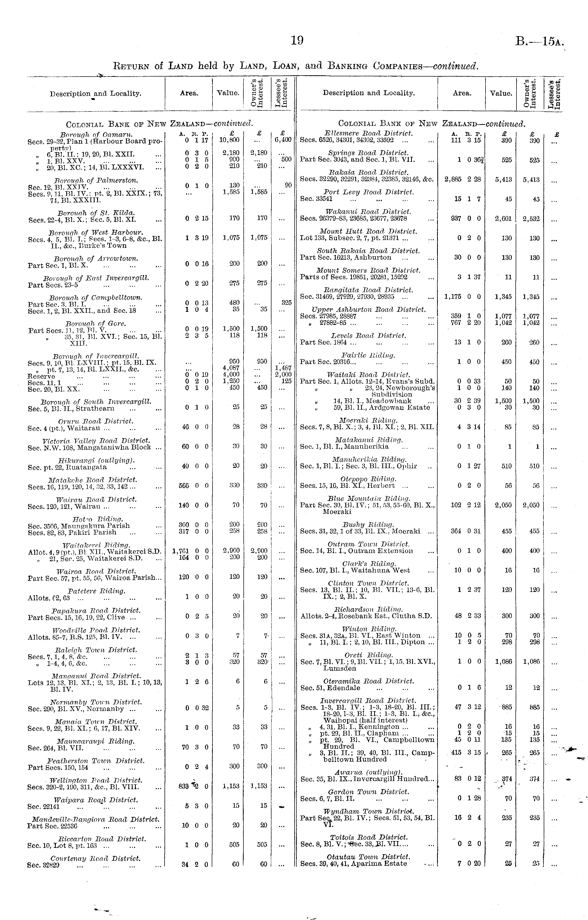 Description and Locality. Area. «J 4_ "_• ""> Value. S & o_ _ j_ '<■> g o . w _ W _ ___! Colonial Bank op _!_■. Borough of Oamaru. Sees. 29-32, Plan 1 (Harbour Board property) „ 6, BI.'II.; 19,20, Bl. XXII. „ 1, Bl.XXV „ 20, Bl. XC.; 14, Bl. LXXXVI. ... Zealand--continio 111. £ 0,400 A. B. P. 0 1 17 £ 10,800 £ 0 3 0 0 15 0 2 0 2,180 900 210 2,180 "310 "500 Porouah of Pahnerston. Sec. 12, Bl. XXIV Sees. 9,11. Bl. IV.: pt. 2, Bl. XXIX.; 73, 74, Bl. XXXIII. 0 10 130 1,585 1,586 90 Borouah of St. Kilda. Sees. 22-4, Bl. X.; Sec. 5, Bl. XI. 0 2 15 170 170 Borough of West Harbour. Sees. 4, 5, BJ. I.; Fees. 1-3, 6-8, Sec, Bl. II., Sec, Burke's Town 1 3 19 1,075 1,075 Borough of Arrowtown. Part Sec. 1,B1.X 0 0 10 200 200 Borouah of Hast Invercargill. Part Sees. 23-5 0 2 20 275 275 Borouah of Campbclltown. Part See. 3, Bl. I Sees. 1, 2, Bl. XXII., and See. 18 0 0 13 10 4 480 35 "35 325 Borouah, of Gore. Part Sees. 11,12, Bl. V. 35,31, Bl. XVI.; See. 15, Bl. XIII. 0 0 19 2 3 5 1.500 118 1,500 118 Borough of Invercargill. Sees. 9,10, Bl. LXVIII.; pt. 15. Bl. IX. „ pt. 7,13,14, Bl. LXXII., Sec. Keserve Sees. 11,1 Sec. 20, Bl. XX. 950 4,087 4,000 1.250 450 950 1,467 2,000 125 0 0 19 0 2 0 0 10 "450 Borouah of South Invercargill. Sec. 5, BI.'II., Strati-earn 0 10 25 25 Oruru Boad District. Sec. 4 (pt.), Waitarau ... 40 0 0 28 28 Victoria, Valley Boad District. Sec. N.W.108, Mangataniwha Block ... 00 0 0 30 30 Hikurangi (outlying). See. pt. 22, Euatangata 40 0 0 20 20 Matakche Boad District. Sees. 10,119, 120, 14, 32, 33, 142 566 0 0 830 330 Wairau Boad District. Sees. 120,121, Wairau 140 0 0 70 70 Hot'o Biding. Sec. 3500, Maiing..]. ra Parish Sees. 82, 83, Pakiri Parish 300 0 0 317 0 0 200 258 200 258 Waitakerei Biding. Allot. 4.9 (pt.), Bl. XII., Waitakerei S.D. „ 21, See. 25, Waitakerei S.D. 1,701 0 0 104 0 0 2,900 300 2,900 200 Wairoa Boad District. Part Sec. 57, pt. 55, 56, Wairoa Parish... 120 0 0 120 120 Patetere Biding. Allots. 02, 63 1 0 0 20 20 Papakura Boad District. Part Sees. 15,16,19, 22, Clive 0 2 5 20 20 Woodrille Boad, District. Allots. 85-7, U.S. 125, Bl. IV 0 3 0 7Raleigh Town District. Sees. 7,1, 4, 8,' Sec. „ 1-4, 4,6, &e 2 1 3 3 0 0 57 320 57 320 Manaanui Boad, District. Lots 12,13, Bl. XL; 2, 13, Bl. I.; 10,13, Bl. IV. 1 2 6 6 6 Normanby Town District. See. 290, Bl. XV., Normanby 0 0 32 5 5 Mavaia Town District. Sees. 9, 22, Bl. XI.; 6,17, Bl. XIV. 1 0 0 33 33 Maunaaraupi Biding. Sec. 264, Bl. VII 70 3 0 70 70 Heatherston Town District. Part Sees. 150,154 0 2 4 300 300 Wellington Boad District. Sees. 320-2,190, 311, &c, Bl. VIII. 833 _! 0 1,153 1,153 Waipara Boad, District. See. 22141 5 3 0 15 15 Mandeville-Bangiora Boad District. Part Sec. 22530 10 0 0 20 20 Biecarion Boad District. Sec. 10, Lot 8, pt. 163 10 0 505 505 Courtenay Boad District. Sec. 32829 34 2 0 00 60