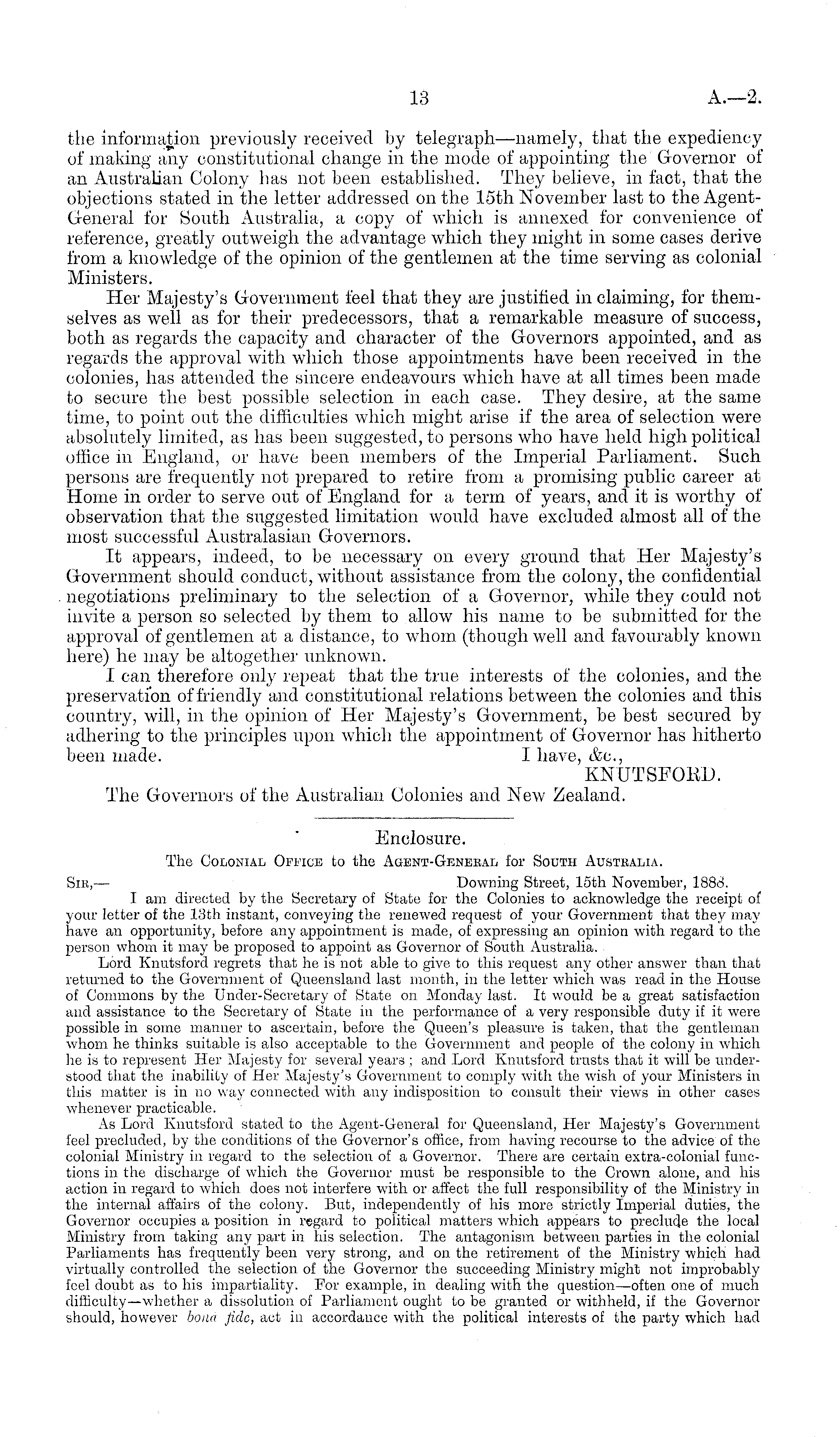 the information previously received by telegraph—namely, that the expediency of making any constitutional change in the mode of appointing the Governor of an Australian Colony has not been established. They believe, in fact, that the objections stated in the letter addressed on the 15th November last to the AgentGeneral for South Australia, a copy of which is annexed for convenience of reference, greatly outweigh the advantage which they might in some cases derive from a knowledge of the opinion of the gentlemen at the time serving as colonial Ministers. Her Majesty's Government feel that they are justified in claiming, for themselves as well as for their predecessors, that a remarkable measure of success, both as regards the capacity and character of the Governors appointed, and as regards the approval with which those appointments have been received in the colonies, has attended the sincere endeavours which have at all times been made to secure the best possible selection in each case. They desire, at the same time, to point out the difficulties which might arise if the area of selection were absolutely limited, as has been suggested, to persons who have held high political office in England, or have been members of the Imperial Parliament. Such persons are frequently not prepared to retire from a promising public career at Home in order to serve out of England for a term of years, and it is worthy of observation that the suggested limitation would have excluded almost all of the most successful Australasian Governors. It appears, indeed, to be necessary on every ground that Her Majesty's Government should conduct, without assistance from the colony, the confidential negotiations preliminary to the selection of a Governor, while they could not invite a person so selected by them to allow his name to be submitted for the approval of gentlemen at a distance, to whom (though well and favourably known here) he may be altogether unknown. I can therefore only repeat that the true interests of the colonies, and the preservation of friendly and constitutional relations between the colonies and this country, will, in the opinion of Her Majesty's Government, be best secured by adhering to the principles upon which the appointment of Governor has hitherto been made. I have, &c, KNUTSFOKD. The Governors of the Australian Colonies and New Zealand.