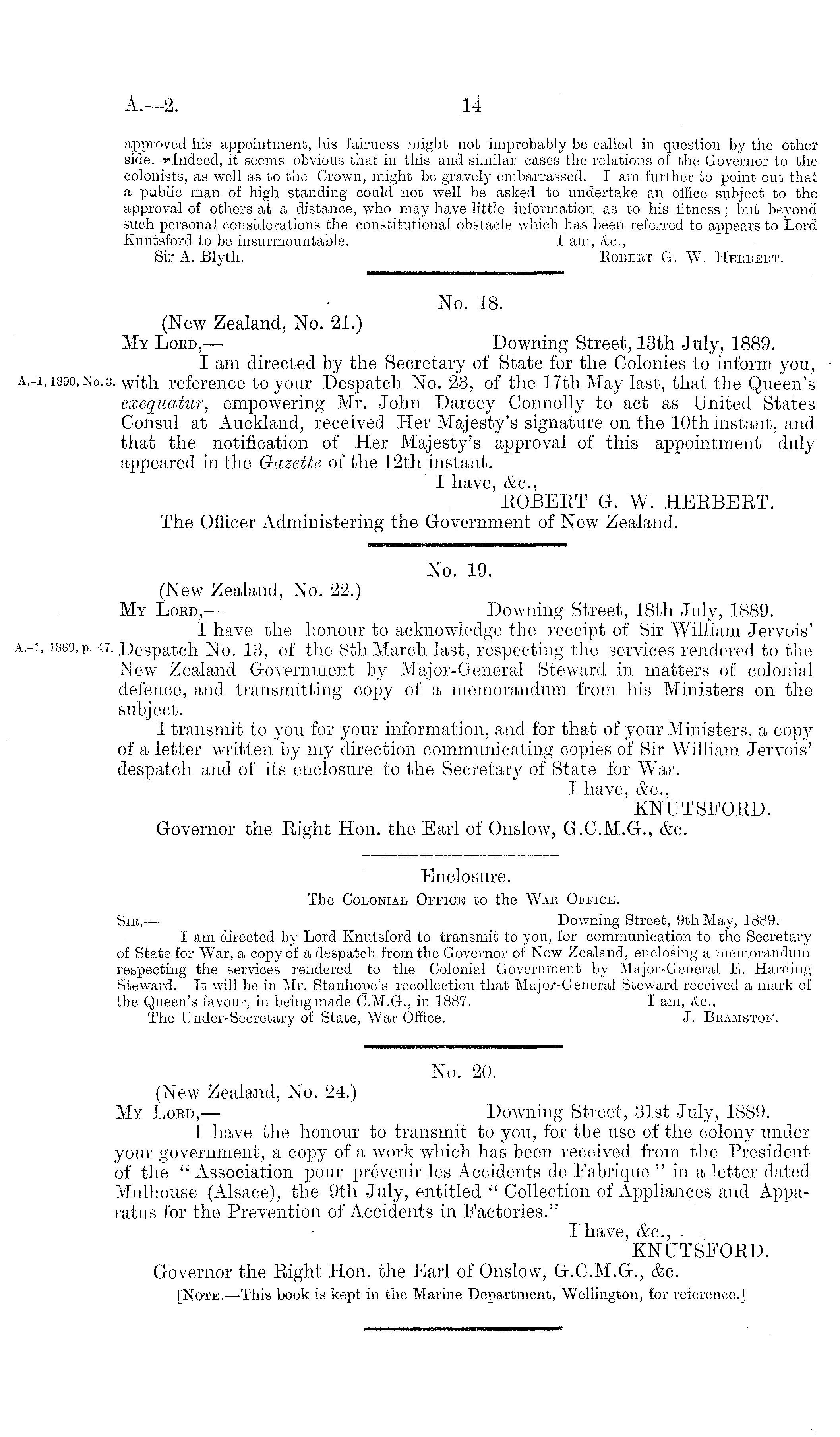 Enclosure. The Colonial Office to the Wak Office. Sir,— Downing Street, 9th May, 1889. I am directed by Lord Knutsford to transmit to you, for communication to the Secretary of State for War, a copy of a despatch from the Governor of New Zealand, enclosing a memorandum respecting the services rendered to the Colonial Government by Major-General B. Harding Steward. It will be in Mr. Stanhope's recollection that Major-General Steward received a mark of the Queen's favour, in being made C.M.G., in 1887. I am, &c, The Under-Secretary of State, War Office. J. Bkamston.