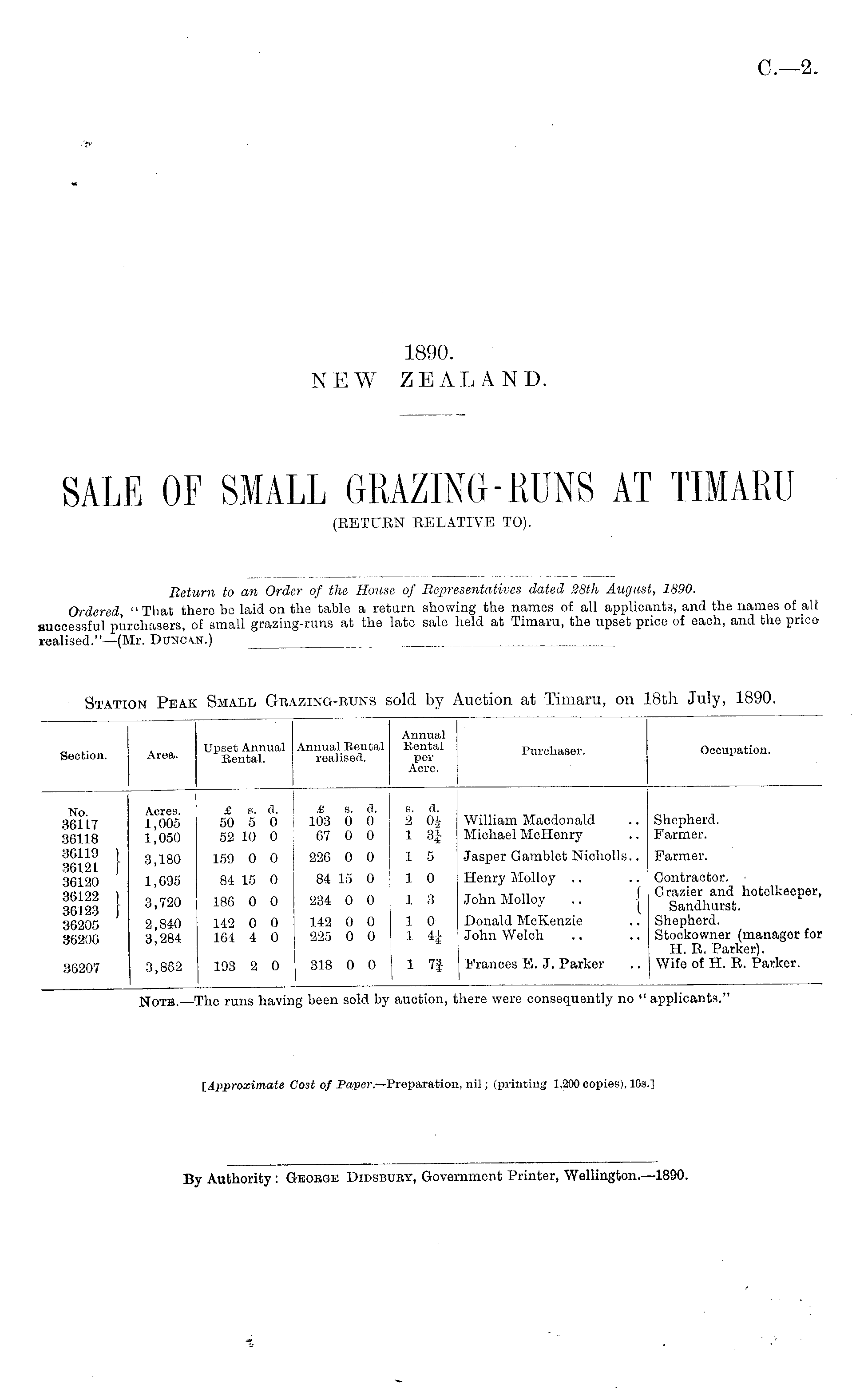 Return to an Order of the House of Representatives dated %Btli August, 1890. Ordered "That there bo laid on the table a return showing the names of all applicants, and the names of all successful purchasers, of small grazing-runs at the late sale held at Timaru, tho upset price of each, and the prico realised."—(Mr. Duncan.) ___