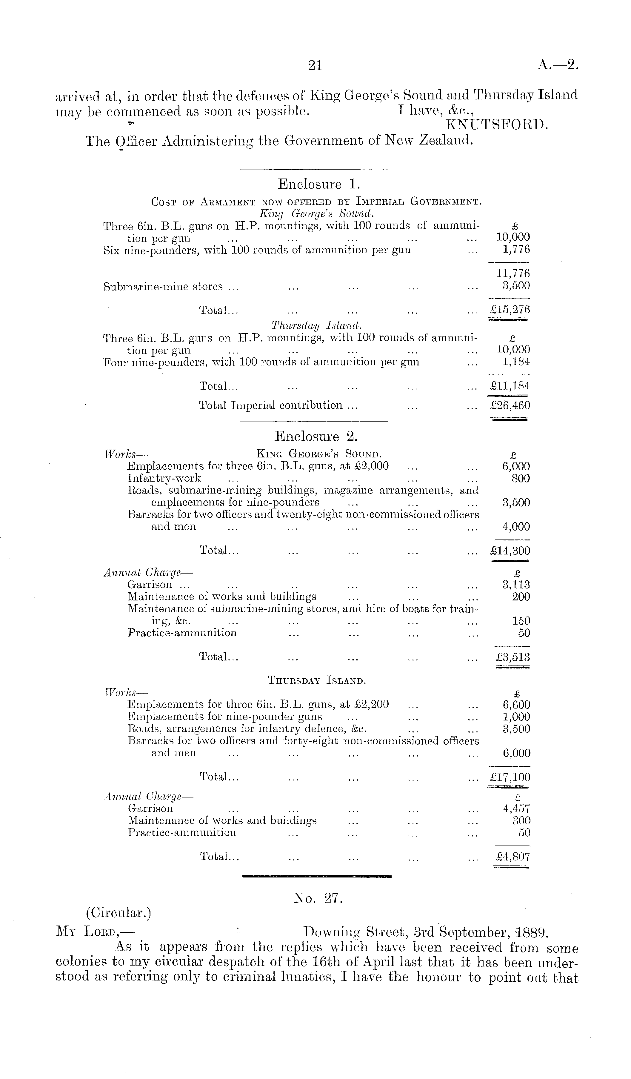 Enclosure 2. Works — King Geobgb's Sound. £ Emplacements for three 6in. B.L. guns, at £2,000 ... ... 6,000 Infantry-work ... ... ... ... ... 800 Eoads, submarine-milling buildings, magazine arrangements, and emplacements for nine-pounders ... ... ... 3,500 Barracks for two officers and twenty-eight non-commissioned officers and men ... ... ... ... ... 4,000 Total... ... ... ... ... £14,300 Annual Charge — £ Garrison ... ... .. ... ... ... 3,113 Maintenance of works and buildings ... ... ... 200 Maintenance of submarine-mining stores, and hire of boats for training, &c. ... ... ... ... ... 150 Practice-ammunition ... ... ... ... 50 Total... ... ... ... ... £3,513 Thursday Island. Works — £ Emplacements for three 6in. B.L. guns, at £2,200 ... ... 6,600 Emplacements for nine-pounder guns ... ... ... 1,000 Eoads, arrangements for infantry defence, &c. ... ... 3,500 Barracks for two officers and forty-eight non-commissioned officers and men ... ... ... ... ... 6,000 Total... ... ... ... ... £17,100 Annual Charge — £ Garrison ... ... ... ... ... 4,457 Maintenance of works and buildings ... ... ... 300 Practice-ammunition ... ... ... ... 50 Total... ... ... ... ... £4,807