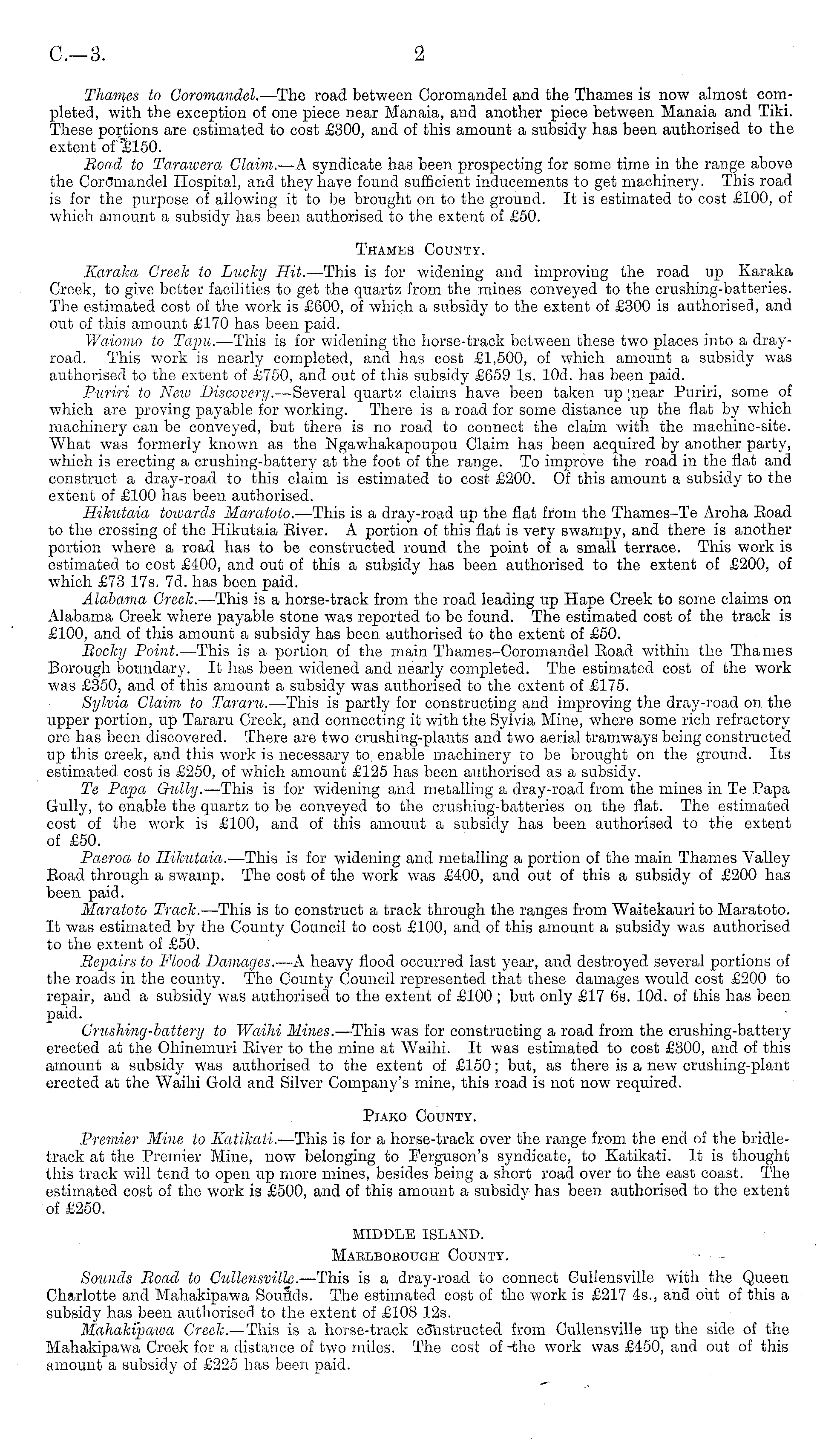 Thames to Coromandel. —The road between Coromandel and the Thames is now almost completed, with the exception of one piece near Manaia, and another piece between Manaia and Tiki. These portions are estimated to cost £300, and of this amount a subsidy has been authorised to the extent of *£150. Road to Taraicera Claim. —A syndicate has been prospecting for some time in the range above the Corflmandel Hospital, and they have found sufficient inducements to get machinery. This road is for the purpose of allowing it to be brought on to the ground. It is estimated to cost £100, of which amount a subsidy has been authorised to the extent of £50. Thames County. Karaka Creek to Lucky Hit. —This is for widening and improving the road up Karaka Creek, to give better facilities to get the quartz from the mines conveyed to the crushing-batteries. The estimated cost of the work is £600, of which a subsidy to the extent of £300 is authorised, and out of this amount £170 has been paid. Waiomo to Tapu. —This is for widening the horse-track between these two places into a drayroad. This work is nearly completed, and. has cost £1,500, of which amount a subsidy was authorised to the extent of £750, and out of this subsidy £659 Is. lOd. has been paid. Puriri to New Discovery. —Several quartz claims have been taken up ;near Puriri, some of which are proving payable for working. There is a road for some distance up the flat by which machinery can be conveyed, but there is no road to connect the claim with the machine-site. What was formerly known as the Ngawhakapoupou Claim has been acquired by another party, which is erecting a crushing-battery at the foot of the range. To improve the road in the flat and construct a dray-road to this claim is estimated to cost £200. Of this amount a subsidy to the extent of £100 has been authorised. Hikutaia towards Maratoto. —This is a dray-road up the flat from the Thames-Te Aroha Eoad to the crossing of the Hikutaia Eiver. A portion of this flat is very swampy, and there is another portion where a road has to be constructed round the point of a small terrace. This work is estimated to cost £400, and out of this a subsidy has been authorised to the extent of £200, of which £73 17s. 7d. has been paid. Alabama Creek. —This is a horse-track from the road leading up Hape Creek to some claims on Alabama Creek where payable stone was reported to be found. The estimated cost of the track is £100, and of this amount a subsidy has been authorised to the extent of £50. Bocky Point. —This is a portion of the main Thames-Coromandel Eoad within the Thames Borough boundary. It has been widened and nearly completed. The estimated cost of the work was £350, and of this amount a subsidy was authorised to the extent of £175. Sylvia Claim to Tararu. —This is partly for constructing and improving the dray-road on the upper portion, up Tararu Creek, and connecting it with the Sylvia Mine, where some rich refractory ore has been discovered. There are two crushing-plants and two aerial tramways being constructed up this creek, and this work is necessary to enable machinery to be brought on the ground. Its estimated cost is £250, of which amount £125 has been authorised as a subsidy. Te Papa Gully. —This is for widening and metalling a dray-road from the mines in Te Papa Gully, to enable the quartz to be conveyed to the crushiug-batteries on the flat. The estimated cost of the work is £100, and of this amount a subsidy has been authorised to the extent of £50. Paeroa to Hikutaia. —This is for widening and metalling a portion of the main Thames Valley Eoad through a swamp. The cost of the work was £400, and out of this a subsidy of £200 has been paid. Maratoto Track. —This is to construct a track through the ranges from Waitekauri to Maratoto. It was estimated by the County Council to cost £100, and of this amount a subsidy was authorised to the extent of £50. Bcjjairs to Flood Damages. —A heavy flood occurred last year, and destroyed several portions of the roads in the county. The County Council represented that these damages would cost £200 to repair, and a subsidy was authorised to the extent of £100 ; but only £17 6s. lOd. of this has been paid. Crushing-battery to Waihi Mines. —This was for constructing a road from the crushing-battery erected at the Ohinemuri Eiver to the mine at Waihi. It was estimated to cost £300, and of this amount a subsidy was authorised to the extent of £150; but, as there is a new crushing-plant erected at the Waihi Gold and Silver Company's mine, this road is not now required. Piako County. Premier Mine to Katikati. —This is for a horse-track over the range from the end of the bridletrack at the Premier Mine, now belonging to Ferguson's syndicate, to Katikati. It is thought this track will tend to open up more mines, besides being a short road over to the east coast. The estimated cost of the work is £500, and of this amount a subsidy has been authorised to the extent of £250. MIDDLE ISLAND. Mablboeough County. Sounds Boad to Cullensvilh. —This is a dray-road to connect Gullensville with the Queen Charlotte and Mahakipawa Souitds. The estimated cost of the work is £217 45., and out of this a subsidy has been authorised to the extent of £108 12s. Mahakipawa Creek. — This is a horse-track constructed from Cullensville up the side of the Mahakipawa Creek for a distance of two miles. The cost of -the work was £450, and out of this amount a subsidy of £225 has been paid.