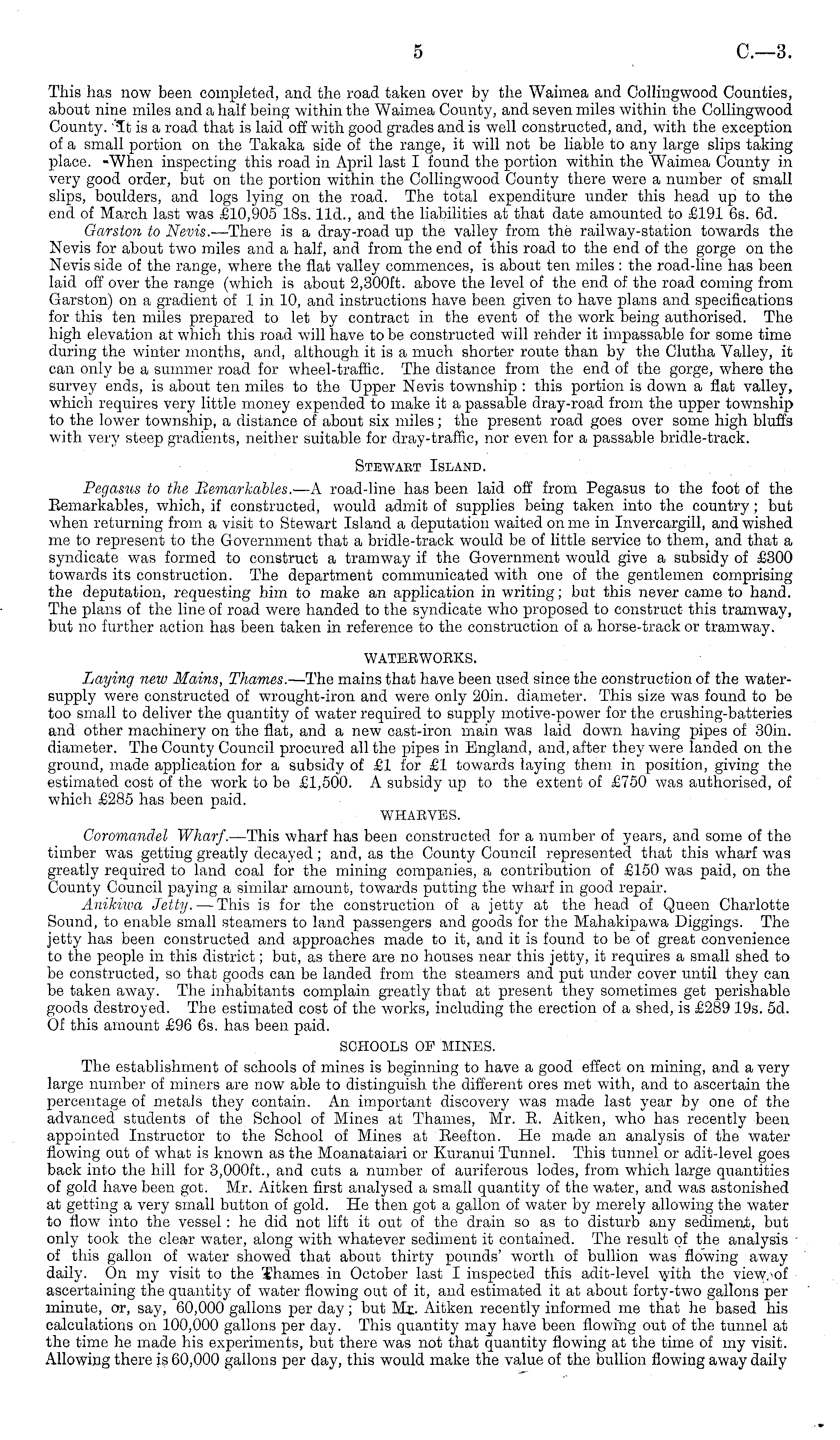 This has now been completed, and the road taken over by the Waimea and Collingwood Counties, about nine miles and a half being within the Waimea County, and seven miles within the Collingwood County. 'It is a road that is laid off with good grades and is well constructed, and, with the exception of a small portion on the Takaka side of the range, it will not be liable to any large slips taking place. -When inspecting this road in April last I found the portion within the Waimea County in very good order, but on the portion within the Collingwood County there were a number of small slips, boulders, and logs lying on the road. The total expenditure under this head up to the end of March last was £10,905 18s. lid., and the liabilities at that date amounted to £191 6s. 6d. Garston to Nevis. —There is a dray-road up the valley from the railway-station towards the Nevis for about two miles and a half, and from the end of this road to the end of the gorge on the Nevis side of the range, where the flat valley commences, is about ten miles : the road-line has been laid off over the range (which is about 2,300 ft. above the level of the end of the road coming from Garston) on a gradient of 1 in 10, and instructions have been given to have plans and specifications for this ten miles prepared to let by contract in the event of the work being authorised. The high elevation at which this road will have to be constructed will render it impassable for some time during the winter months, and, although it is a much shorter route than by the Clutha Valley, it can only be a summer road for wheel-traffic. The distance from the end of the gorge, where the, survey ends, is about ten miles to the Upper Nevis township : this portion is down a flat valley, which requires very little money expended to make it a passable dray-road from the upper township to the lower township, a distance of about six miles ; the present road goes over some high bluffs with very steep gradients, neither suitable for dray-traffic, nor even for a passable bridle-track. Stewart Island. Pegasus to the Bemarhables. —A road-line has been laid off from Pegasus to the foot of the Eemarkables, which, if constructed, would admit of supplies being taken into the country; but when returning from a visit to Stewart Island a deputation waited on me in Invercargill, and wished me to represent to the Government that a bridle-track would be of little service to them, and that a syndicate was formed to construct a tramway if the Government would give a subsidy of £300 towards its construction. The department communicated with one of the gentlemen comprising the deputation, requesting him to make an application in writing; but this never came to hand. The plans of the line of road were handed to the syndicate who proposed to construct this tramway, but no further action has been taken in reference to the construction of a horse-track or tramway. WATEEWOEKS. Laying new Mains, Thames. —The mains that have been used since the construction of the watersupply were constructed of wrought-iron and were only 20in. diameter. This size was found to be too small to deliver the quantity of water required to supply motive-power for the crushing-batteries and other machinery on the flat, and a new cast-iron main was laid down having pipes of 30in. diameter. The County Council procured all the pipes in England, and, after they were landed on the ground, made application for a subsidy of £1 for £1 towards laying them in position, giving the estimated cost of the work to be £1,500. A subsidy up to the extent of £750 was authorised, of which £285 has been paid. WHAEVBS. Coromandel Wharf. —This wharf has been constructed for a number of years, and some of the timber was getting greatly decayed; and, as the County Council represented that this wharf was greatly required to land coal for the mining companies, a contribution of £150 was paid, on the County Council paying a similar amount, towards putting the wharf in good repair. Anikiiva Jetty. —This is for the construction of a jetty at the head of Queen Charlotte Sound, to enable small steamers to land passengers and goods for the Mahakipawa Diggings. The jetty has been constructed and approaches made to it, and it is found to be of great convenience to the people in this district; but, as there are no houses near this jetty, it requires a small shed to be constructed, so that goods can be landed from the steamers and put under cover until they can be taken away. The inhabitants complain greatly that at present they sometimes get perishable goods destroyed. The estimated cost of the works, including the erection of a shed, is £289 19s. sd. Of this amount £96 6s. has been paid. SCHOOLS OP MINES. The establishment of schools of mines is beginning to have a good effect on mining, and a very large number of miners are now able to distinguish the different ores met with, and to ascertain the percentage of metals they contain. An important discovery was made last year by one of the advanced students of the School of Mines at Thames, Mr. E. Aitken, who has recently been appointed Instructor to the School of Mines at Eeefton. He made an analysis of the water flowing out of what is known as the Moanataiari or Kuranui Tunnel. This tunnel or adit-level goes back into the hill for 3,000 ft., and cuts a number of auriferous lodes, from which large quantities of gold have been got. Mr. Aitken first analysed a small quantity of the water, and was astonished at getting a very small button of gold. He then got a gallon of water by merely allowing the water to flow into the vessel: he did not lift it out of the drain so as to disturb any sediment, but only took the clear water, along with whatever sediment it contained. The result of the analysis of this gallon of water showed that about thirty pounds' worth of bullion was flowing away daily. On my visit to the Thames in October last I inspected this adit-level the v