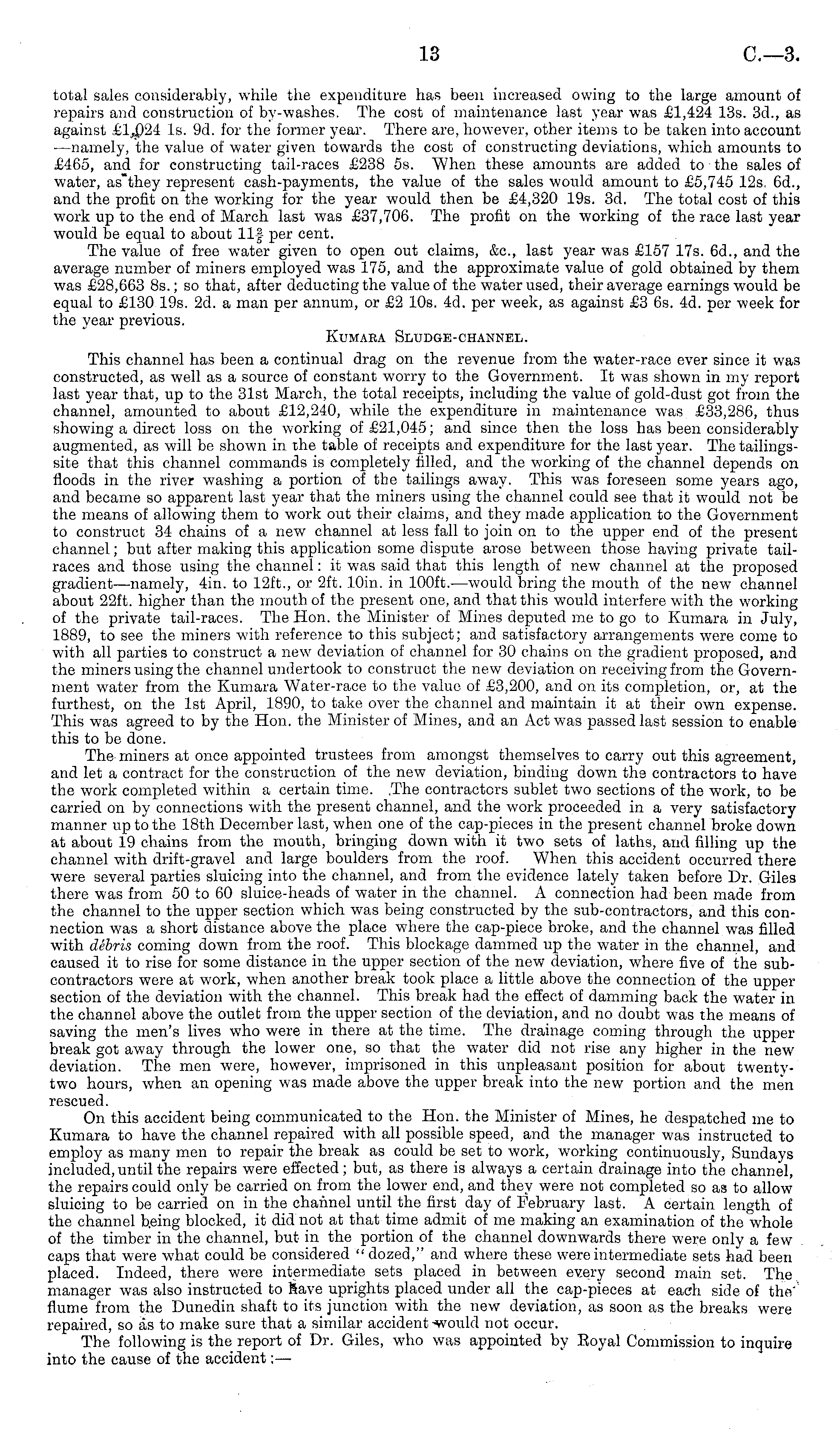 total sales considerably, while the expenditure has been increased owing to the large amount of repairs and construction of by-washes. The cost of maintenance last year was £1,424 13s. 3d., as against £1^)24 Is. 9d. for the former year. There are, however, other items to be taken into account —namely, the value of water given towards the cost of constructing deviations, which amounts to £465, and for constructing tail-races £238 ss. When these amounts are added to the sales of water, as'they represent cash-payments, the value of the sales would amount to £5,745 12s, 6d., and the profit on the working for the year would then be £4,320 19s. 3d. The total cost of this work up to the end of March last was £37,706. The profit on the working of the race last year would be equal to about 11-f per cent. The value of free water given to open out claims, &c, last year was £157 17s. 6d., and the average number of miners employed was 175, and the approximate value of gold obtained by them was £28,663 Bs.; so that, after deducting the value of the water used, their average earnings would be equal to £130 19s. 2d. a man per annum, or £2 10s. 4d. per week, as against £3 6s. 4d. per week for the year previous. Kumaea Sludge-channel. This channel has been a continual drag on the revenue from the water-race ever since it was constructed, as well as a source of constant worry to the Government. It was shown in my report last year that, up to the 31st March, the total receipts, including the value of gold-dust got from the channel, amounted to about £12,240, while the expenditure in maintenance was £33,286, thus showing a direct loss on the working of £21,045; and since then the loss has been considerably augmented, as will be shown in the table of receipts and expenditure for the last year. The tailingssite that this channel commands is completely rilled, and the working of the channel depends on floods in the river washing a portion of the tailings away. This was foreseen some years ago, and became so apparent last year that the miners using the channel could see that it would not be the means of allowing them to work out their claims, and they made application to the Government to construct 34 chains of a new channel at less fall to join on to the upper end of the present channel; but after making this application some dispute arose between those having private tailraces and those using the channel: it was said that this length of new channel at the proposed gradient—namely, 4in. to 12ft., or 2ft. lOin. in 100 ft.—would bring the mouth of the new channel about 22ft. higher than the mouth of the present one, and that this would interfere with the working of the private tail-races. The Hon. the Minister of Mines deputed me to go to Kumara in July, 1889, to see the miners with reference to this subject; and satisfactory arrangements were come to with all parties to construct a new deviation of channel for 30 chains on the gradient proposed, and the miners using the channel undertook to construct the new deviation on receiving from the Government water from the Kumara Water-race to the value of £3,200, and on its completion, or, at the furthest, on the Ist April, 1890, to take over the channel and maintain it at their own expense. This was agreed to by the Hon. the Minister of Mines, and an Act was passed last session to enable this to be done. The miners at once appointed trustees from amongst themselves to carry out this agreement, and let a contract for the construction of the new deviation, binding down the contractors to have the work completed within a certain time. .The contractors sublet two sections of the work, to be carried on by connections with the present channel, and the work proceeded in a very satisfactory manner up to the 18th December last, when one of the cap-pieces in the present channel broke down at about 19 chains from the mouth, bringing down with it two sets of laths, and filling up the channel with drift-gravel and large boulders from the roof. When this accident occurred there were several parties sluicing into the channel, and from the evidence lately taken before Dr. Giles there was from 50 to 60 sluice-heads of water in the channel. A connection had been made from the channel to the upper section which was being constructed by the sub-contractors, and this connection was a short distance above the place where the cap-piece broke, and the channel was filled with debris coming down from the roof. This blockage dammed up the water in the channel, and caused it to rise for some distance in the upper section of the new deviation, where five of the subcontractors were at work, when another break took place a little above the connection of the upper section of the deviation with the channel. This break had the effect of damming back the water in the channel above the outlet from the upper section of the deviation, and no doubt was the means of saving the men's lives who were in there at the time. The drainage coming through the upper break got away through the lower one, so that the water did not rise any higher in the new deviation. The men were, however, imprisoned in this unpleasant position for about twentytwo hours, when an opening was made above the upper break into the new portion and the men rescued. On this accident being communicated to the Hon. the Minister of Mines, he despatched me to Kumara to have the channel repaired with all possible speed, and the manager was instructed to employ as many men to repair the break as could be set to work, working continuously, Sundays included, until the repairs were effected; but, as there is always a certain drainage into the channel, the repairs could only be carried on from the lower end, and they were not completed so as to allow sluicing to be carried on in the channel until the first day of February last. A certain length of the channel being blocked, it did not at that time admit of me making an examination