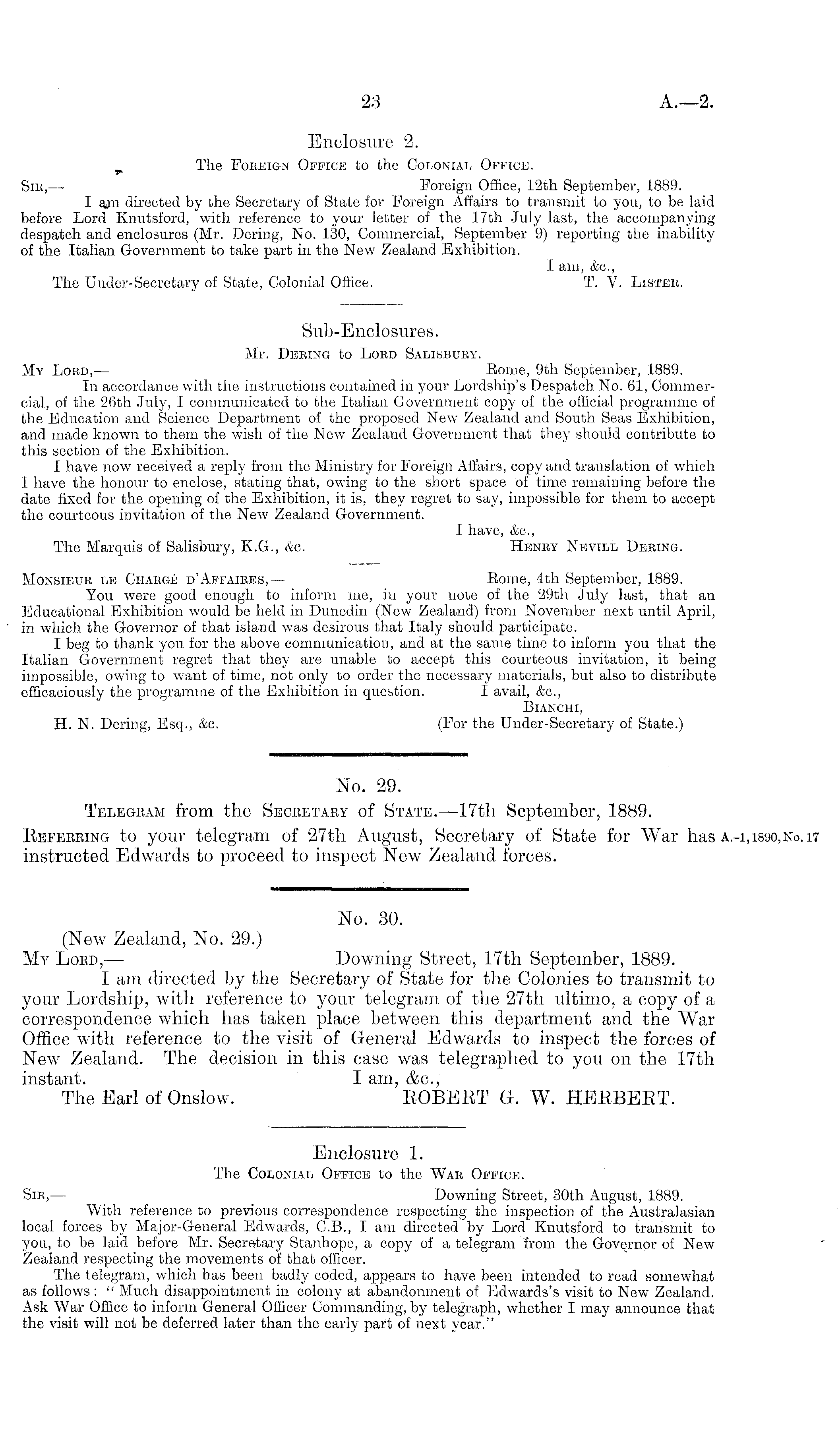 Sub-Enclosures. Mr. Dering to Lobd Salisbury. My Lobd, — Eome, 9th September, 1889. In accordance with the instructions contained in your Lordship's Despatch No. 61, Commercial, of the 26th July, I communicated to the Italian Government copy of the official programme of the Education and Science Department of the proposed New Zealand and South Seas Exhibition, and made known to them the wish of the New Zealand Government that they should contribute to this section of the Exhibition. I have now received a reply from the Ministry for Foreign Affairs, copy and translation of which I have the honour to enclose, stating that, owing to the short space of time remaining before the date fixed for the opening of the Exhibition, it is, they regret to say, impossible for them to accept the courteous invitation of the New Zealand Government. I have, &c, The Marquis of Salisbury, K.G., &c. Heney Nevill Debing. Monsieur le Charge d'Affaiees, — Eome, 4th September, 1889. You were good enough to inform me, in your note of the 29th July last, that an Educational Exhibition would be held in Dunedin (New Zealand) from November next until April, in which the Governor of that island was desirous that Italy should participate. I beg to thank you for the above communication, and at the same time to inform you that the Italian Government regret that they are unable to accept this courteous invitation, it being impossible, owing to want of time, not only to order the necessary materials, but also to distribute efficaciously the programme of the Exhibition in question. I avail, &c, Bianchi, H. N. Dering, Esq., &c. (For the Under-Secretary of State.)