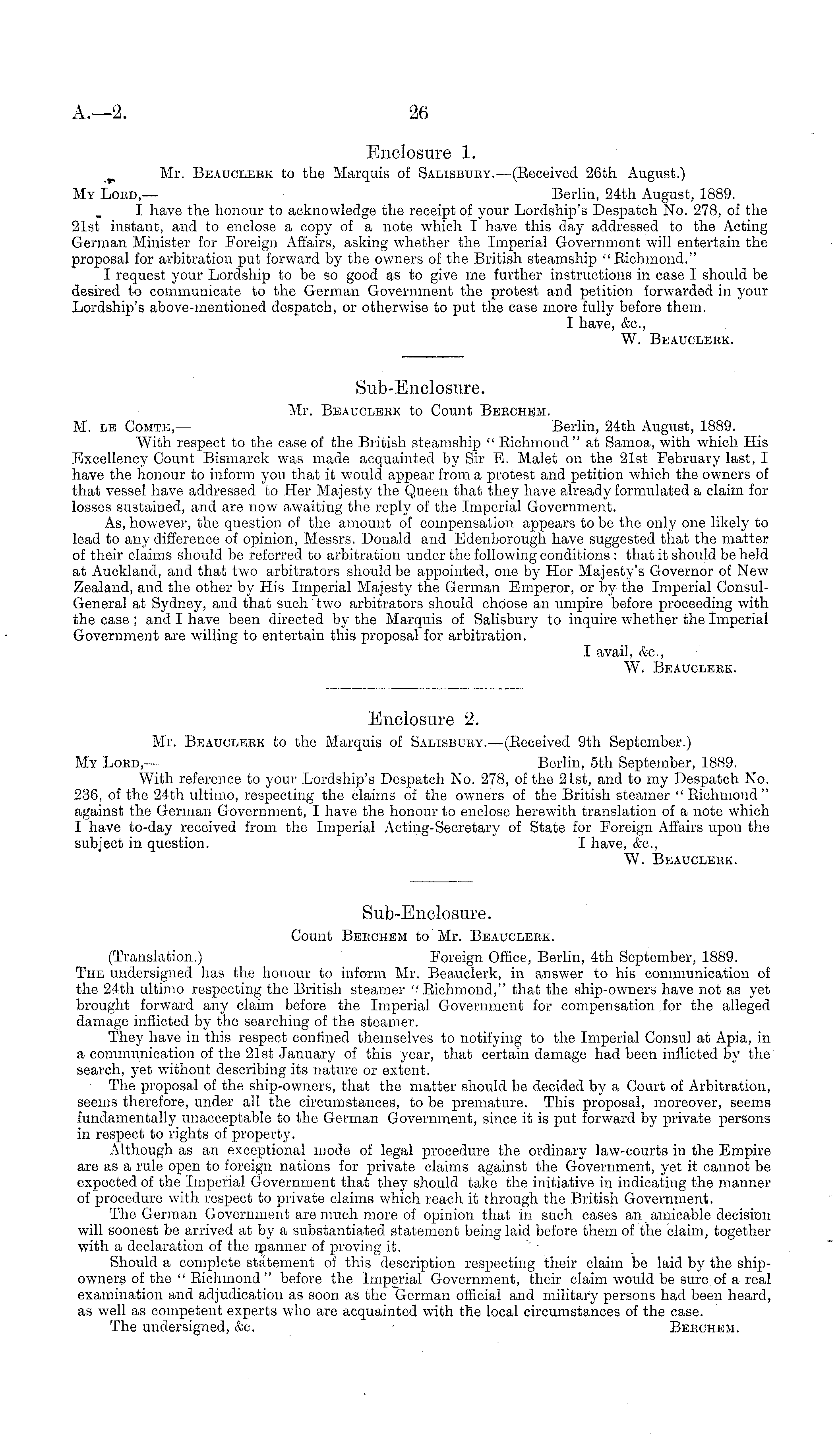 Sub-Enclosure. Mr. Beaucleek to Count Bebchem. M. lb Comte, — Berlin, 24th August, 1889. With respect to the case of the British steamship " Eichmond " at Samoa, with which His Excellency Count Bismarck was made acquainted by Sir E. Malet on the 21st February last, I have the honour to inform you that it would appear from a protest and petition which the owners of that vessel have addressed to Her Majesty the Queen that they have already formulated a claim for losses sustained, and are now awaiting the reply of the Imperial Government. As, however, the question of the amount of compensation appears to be the only one likely to lead to any difference of opinion, Messrs. Donald and Edenborough have suggested that the matter of their claims should be referred to arbitration under the following conditions : that it should be held at Auckland, and that two arbitrators should be appointed, one by Her Majesty's Governor of New Zealand, and the other by His Imperial Majesty the German Emperor, or by the Imperial ConsulGeneral at Sydney, and that such two arbitrators should choose an umpire before proceeding with the case ; and I have been directed by the Marquis of Salisbury to inquire whether the Imperial Government are willing to entertain this proposal for arbitration. I avail, &c, W. Beaucleek.