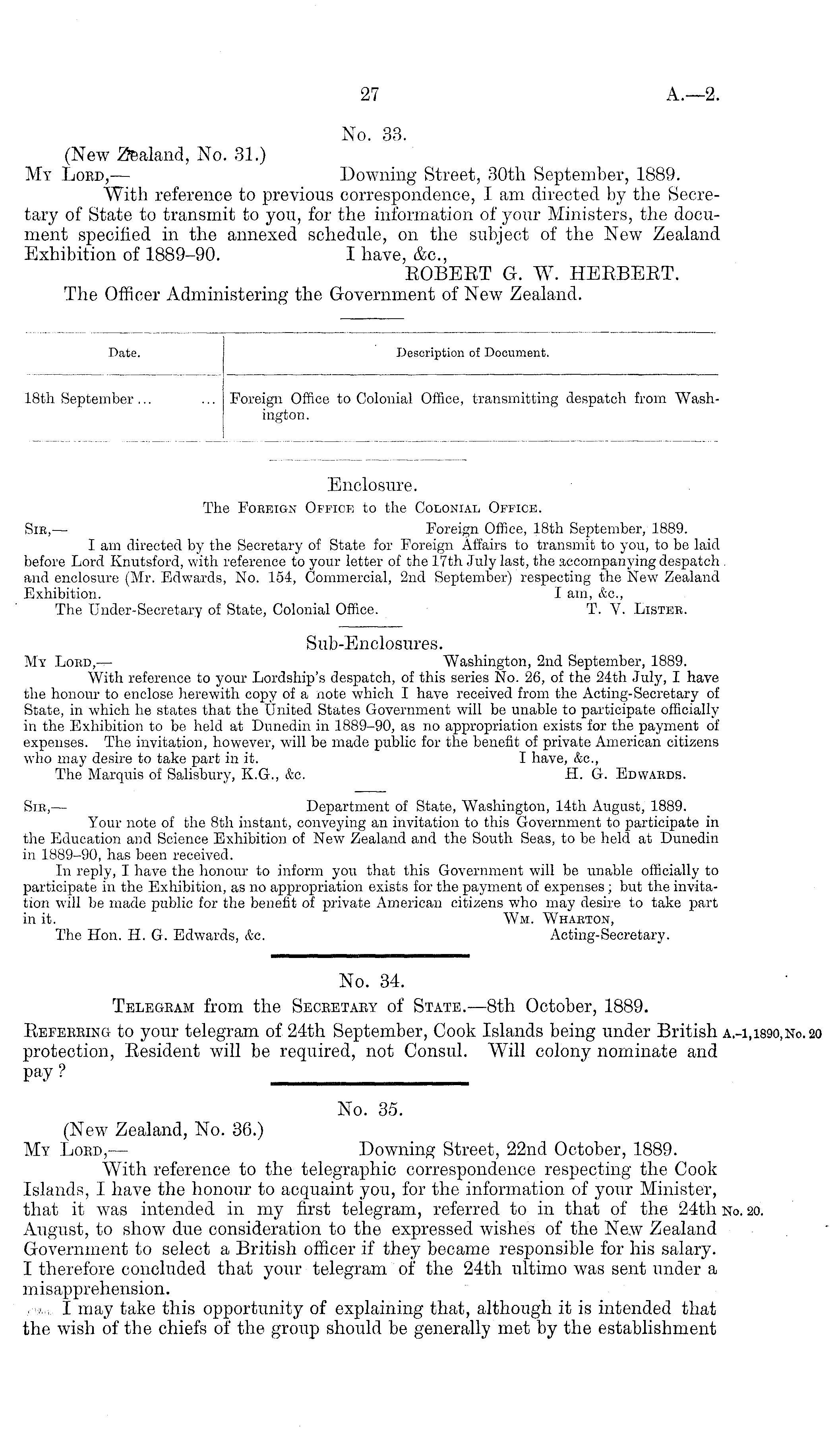 Enclosure. The Foreign Office to the Colonial Office. Sm,— Foreign Office, 18th September, 1889. I am directed by the Secretary of State for Foreign Affairs to transmit to you, to be laid before Lord Knutsford, with reference to your letter of the 17th July last, the accompanying despatch and enclosure (Mr. Edwards, No. 154, Commercial, 2nd September) respecting the New Zealand Exhibition. I am, &c, The Under-Secretary of State, Colonial Office. T. V. Lister.