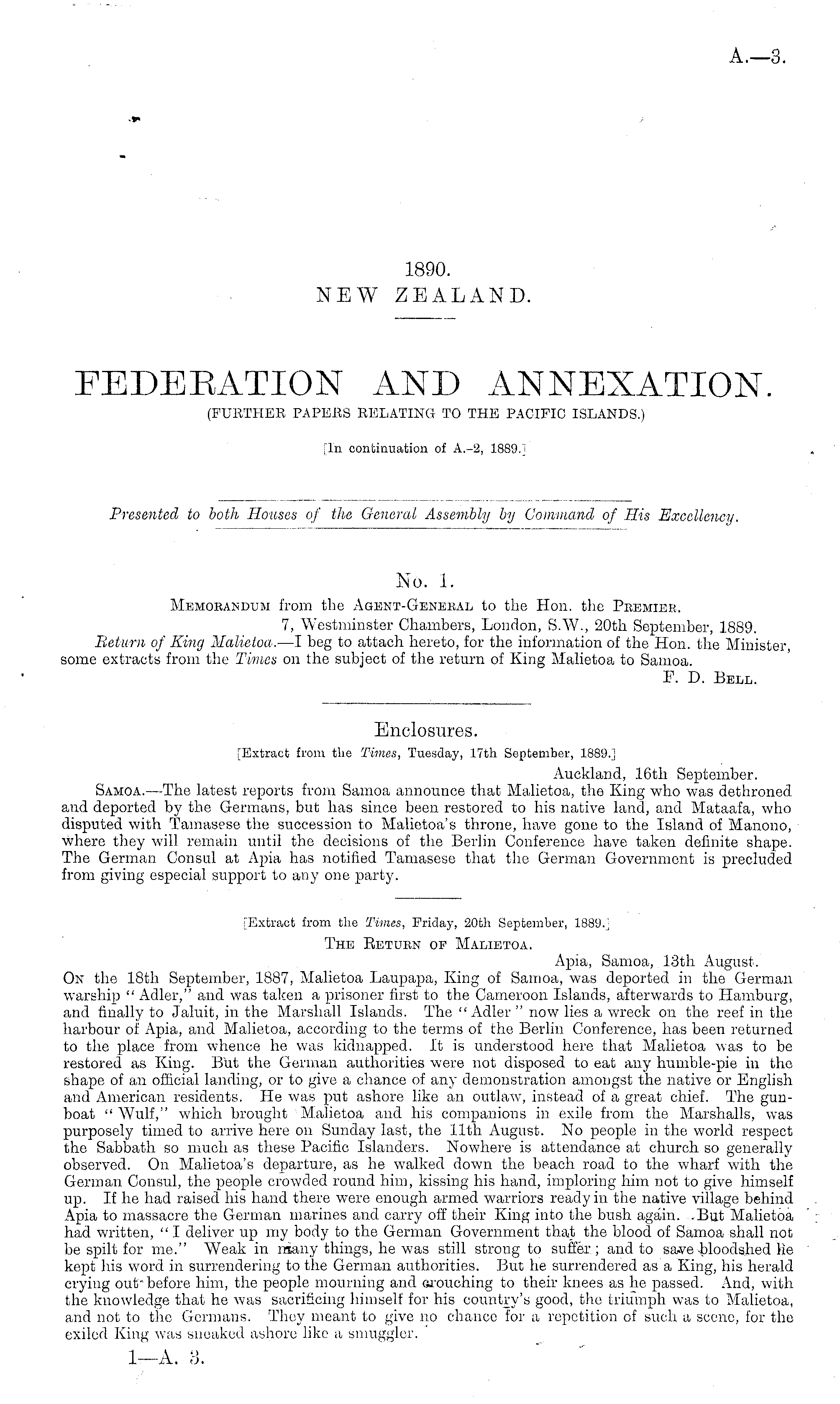 No. 1. Memorandum from the Agent-General to the Hon. the Premier. 7, Westminster Chambers, London, S.W., 20th September, 1889. Return of King 'Malietoa. —I beg to attach hereto, for the information of the Hon. the Minister some extracts from the Times on the subject of the return of King Malietoa to Samoa. F. D. Bell.