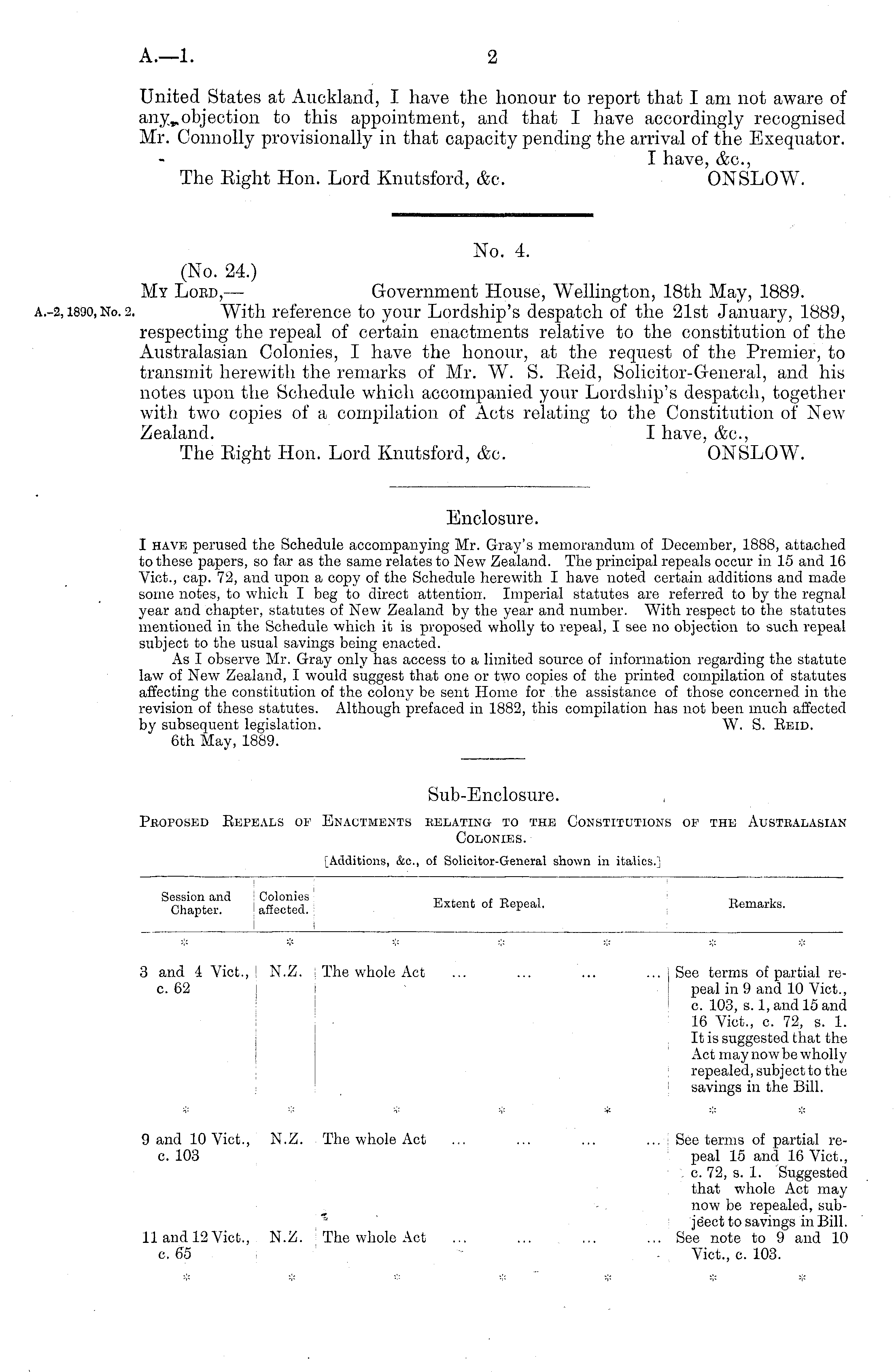 No. 4. (No. 24.) My Lord,— Government House, Wellington, 18th May, 1889. With reference to your Lordship's despatch of the 21st January, 1889, respecting the repeal of certain enactments relative to the constitution of the Australasian Colonies, I have the honour, at the request of the Premier, to transmit herewith the remarks of Mr. W. S. Eeid, Solicitor-General, and his notes upon the Schedule which accompanied your Lordship's despatch, together with two copies of a compilation of Acts relating to the Constitution of NewZealand. I have, &c, The Eight Hon. Lord Knutsford, &o. ONSLOW.