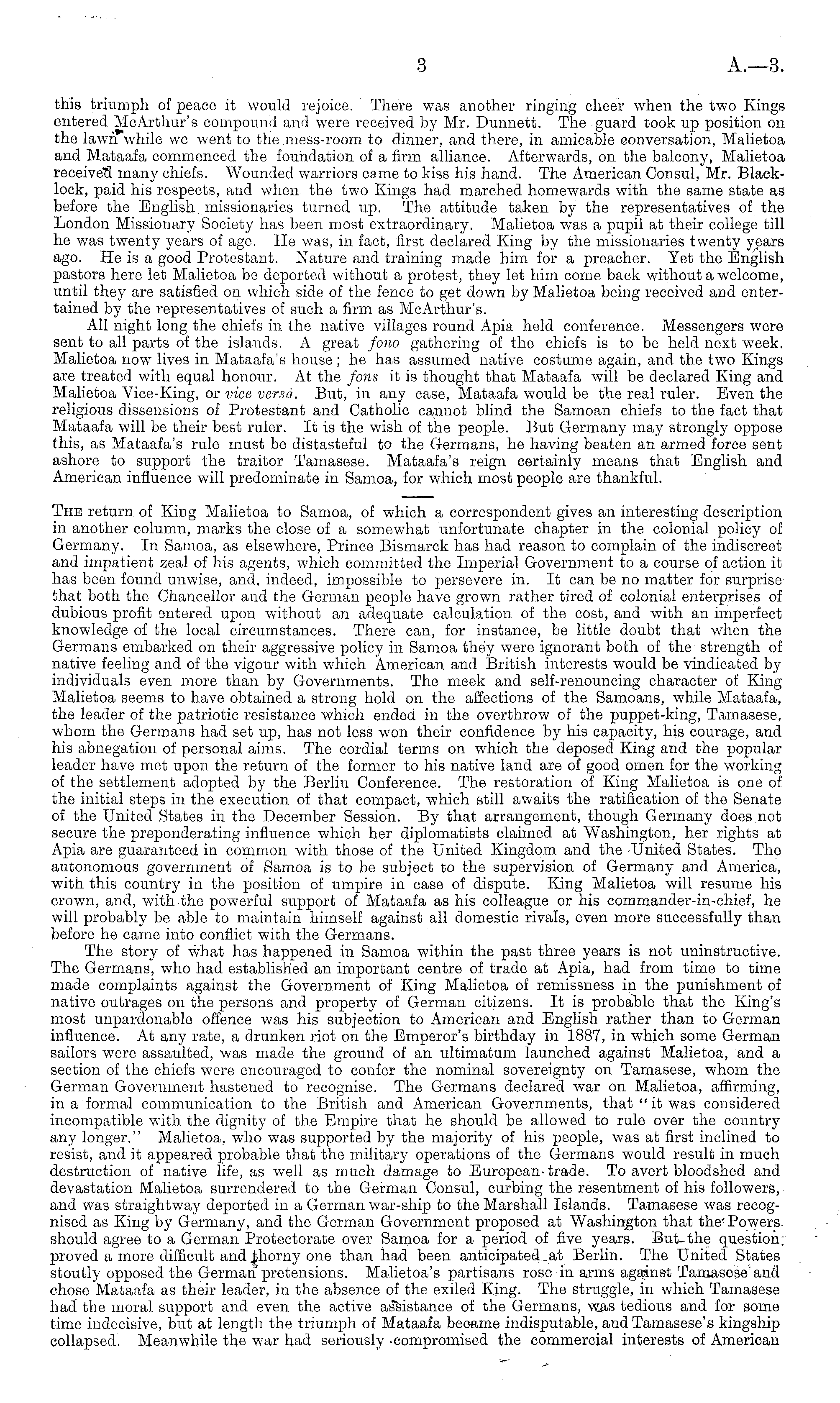 this triumph of peace it would rejoice. There was another ringing cheer when the two Kings entered McArthur's compound and were received by Mr. Dunnett. The guard took up position on the lawn while we went to the mess-room to dinner, and there, in amicable conversation, Malietoa and Mataafa commenced the foundation of a firm alliance. Afterwards, on the balcony, Malietoa received many chiefs. Wounded warriors came to kiss his hand. The American Consul, Mr. Blacklock, paid his respects, and when the two Kings had marched homewards with the same state as before the English missionaries turned up. The attitude taken by the representatives of the London Missionary Society has been most extraordinary. Malietoa was a pupil at their college till he was twenty years of age. He was, in fact, first declared King by the missionaries twenty years ago. He is a good Protestant. Nature and training made him for a preacher. Yet the English pastors here let Malietoa be deported without a protest, they let him come back without a welcome, until they are satisfied ou which side of the fence to get down by Malietoa being received and entertained by the representatives of such a firm as McArthur's. All night long the chiefs in. the native villages round Apia held conference. Messengers were sent to all parts of the islands. A great fono gathering of the chiefs is to be held next week. Malietoa now lives in Mataafa's house ; he has assumed native costume again, and the two Kings are treated with equal honour. At the fons it is thought that Mataafa will be declared King and Malietoa Vice-King, or vice versii. But, in any case, Mataafa would be the real ruler. Even the religious dissensions of Protestant and Catholic cannot blind the Samoan chiefs to the fact that Mataafa will be their best ruler. It is the wish of the people. But Germany may strongly oppose this, as Mataafa's rule must be distasteful to the Germans, he having beaten an armed force sent ashore to support the traitor Tamasese. Mataafa's reign certainly means that English and American influence will predominate in Samoa, for which most people are thankful.