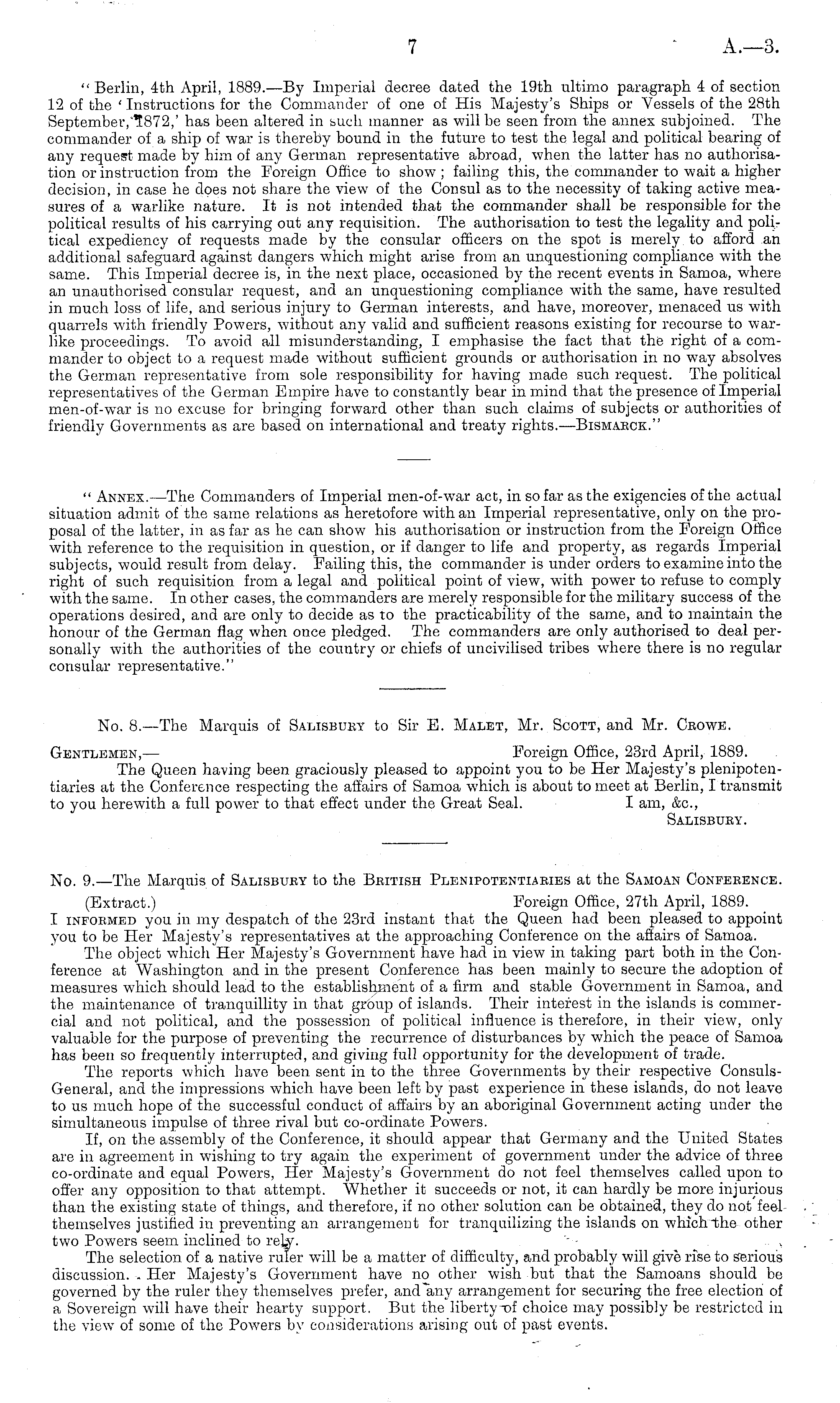 No. B.—The Marquis of Salisbury to Sir E. Malet, Mr. Scott, and Mr. Crowe. Gentlemen, — Foreign Office, 23rd April, 1889. The Queen having been graciously pleased to appoint you to be Her Majesty's plenipotentiaries at the Conference respecting the affairs of Samoa which is about to meet at Berlin, I transmit to you herewith a full power to that effect under the Great Seal. I am, &c, Salisbury.